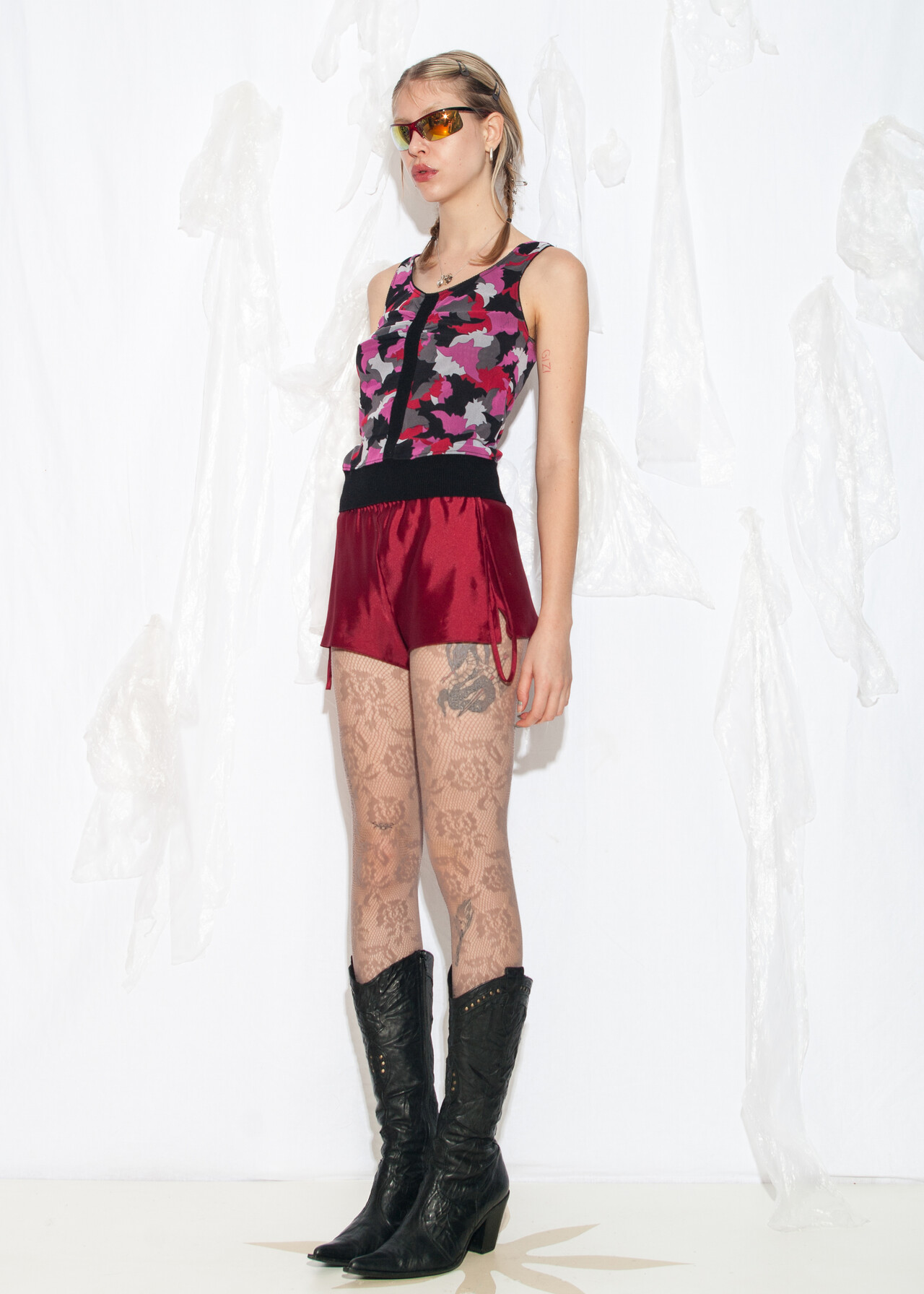 Tags: 2000s style clothing, abstract pattern, mesh top, stretchy vest top, tank top, y2k grunge outfit, y2k vintage fashion