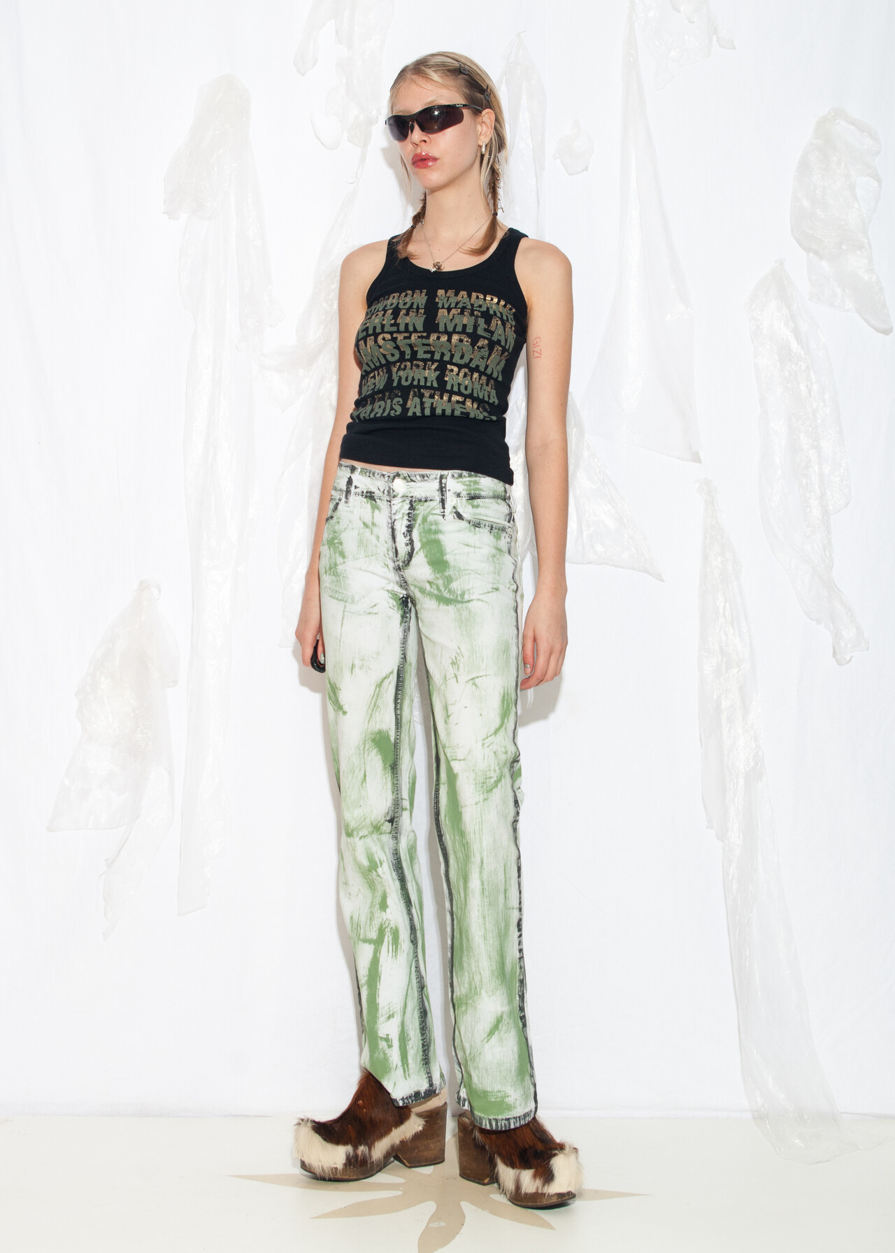Reworked Vintage Y2K Flare Jeans in Hand-Painted Green and White