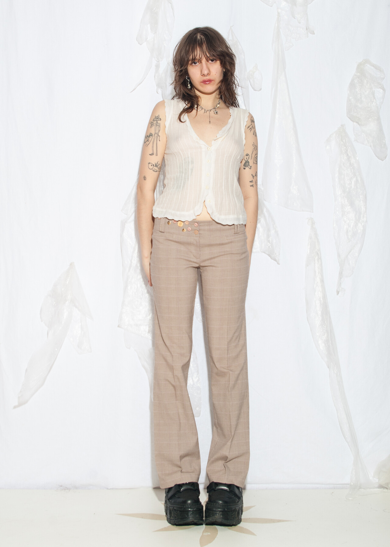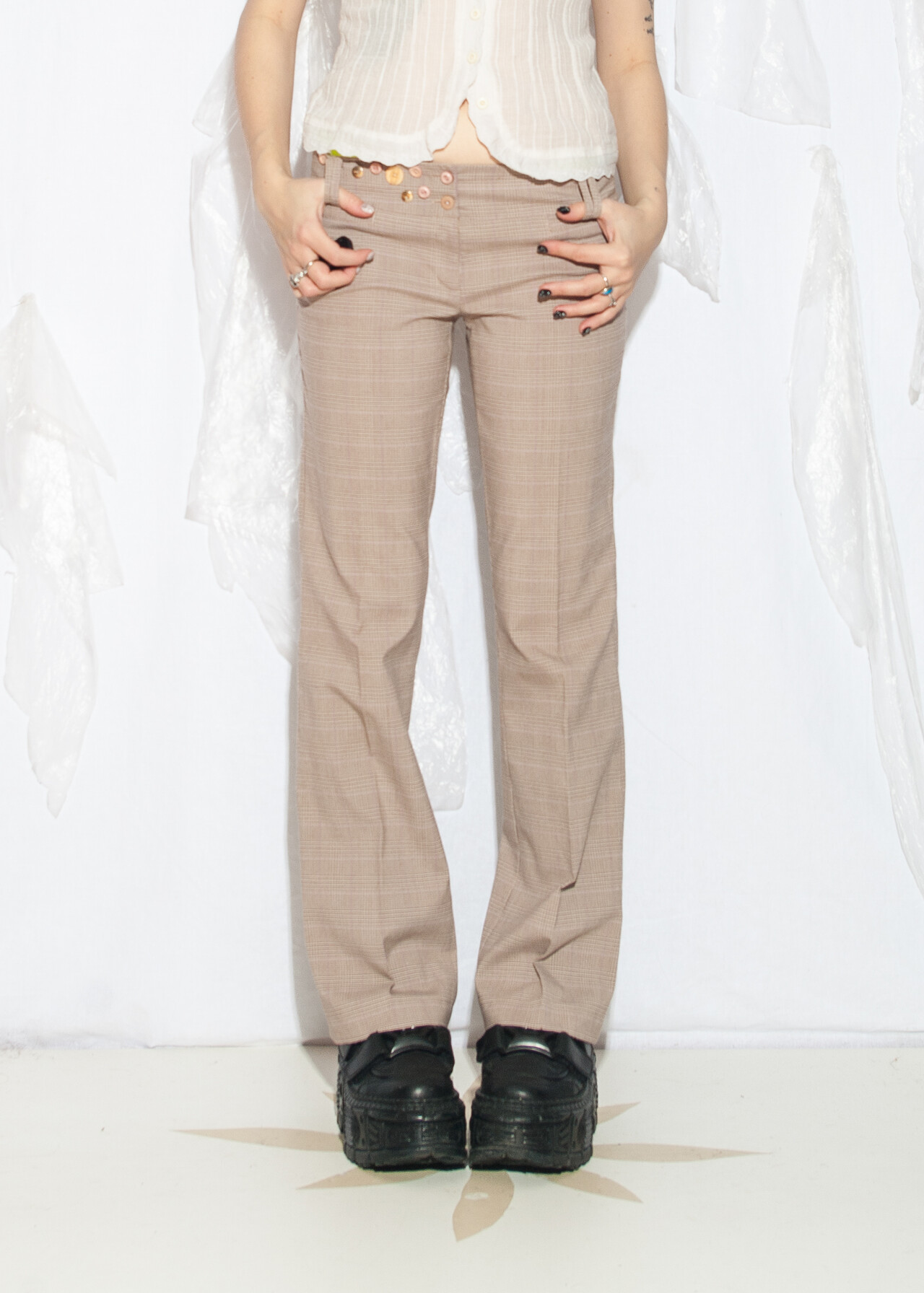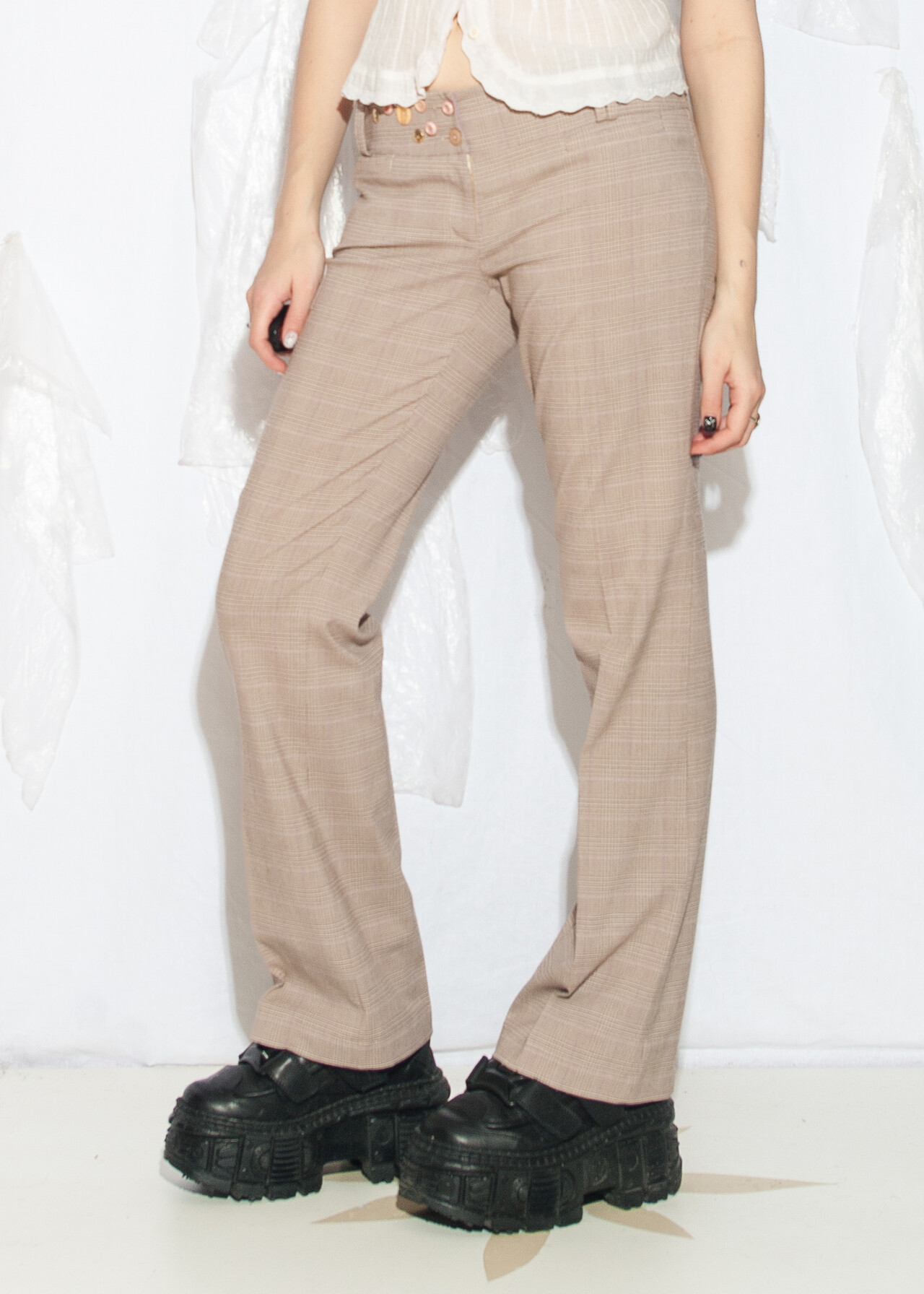Tags: 2000s style fashion, button decorated, flare trousers, low rise waist, plaid bootcut pants, reworked, upcycled pants, whimsical aesthetic, y2k vintage clothing