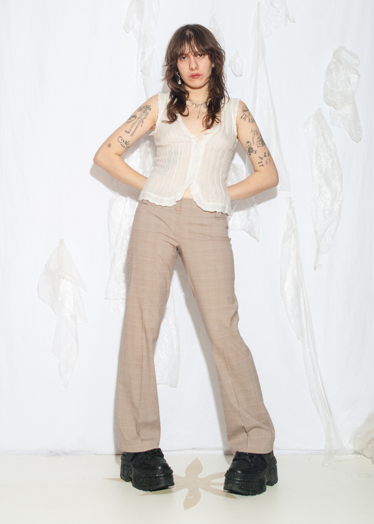 These Y2K vintage trousers are serving up all the low rise waist, flare style you need. With button decorations and a reworked, upcycled vibe, these brown beauties will have you feeling like you’re strutting down a runway made of nostalgia.