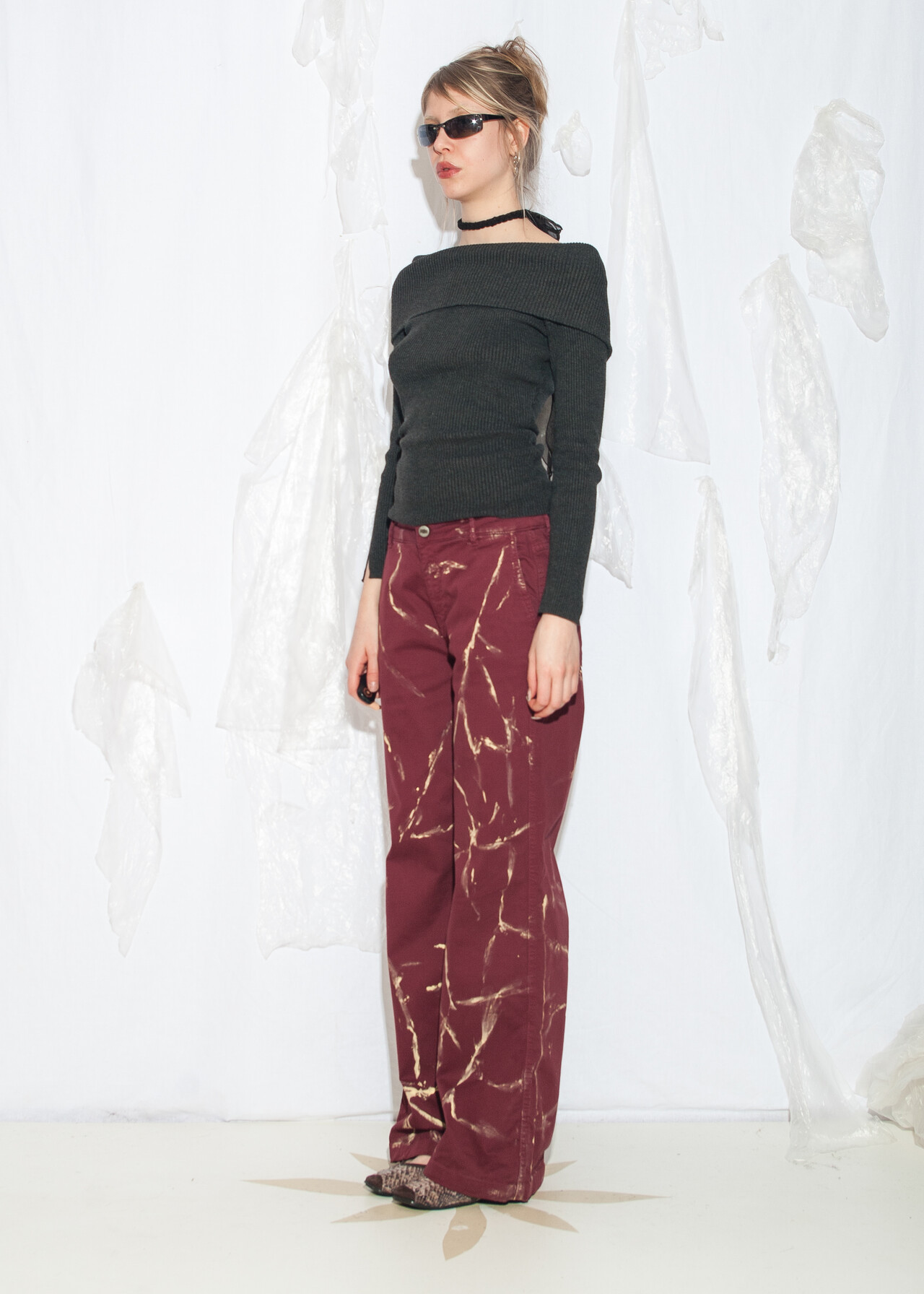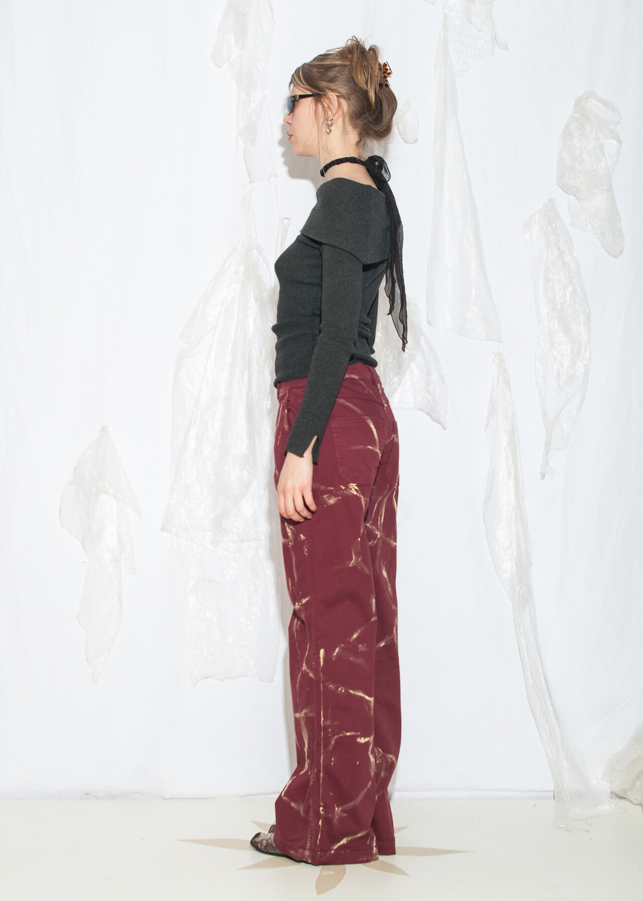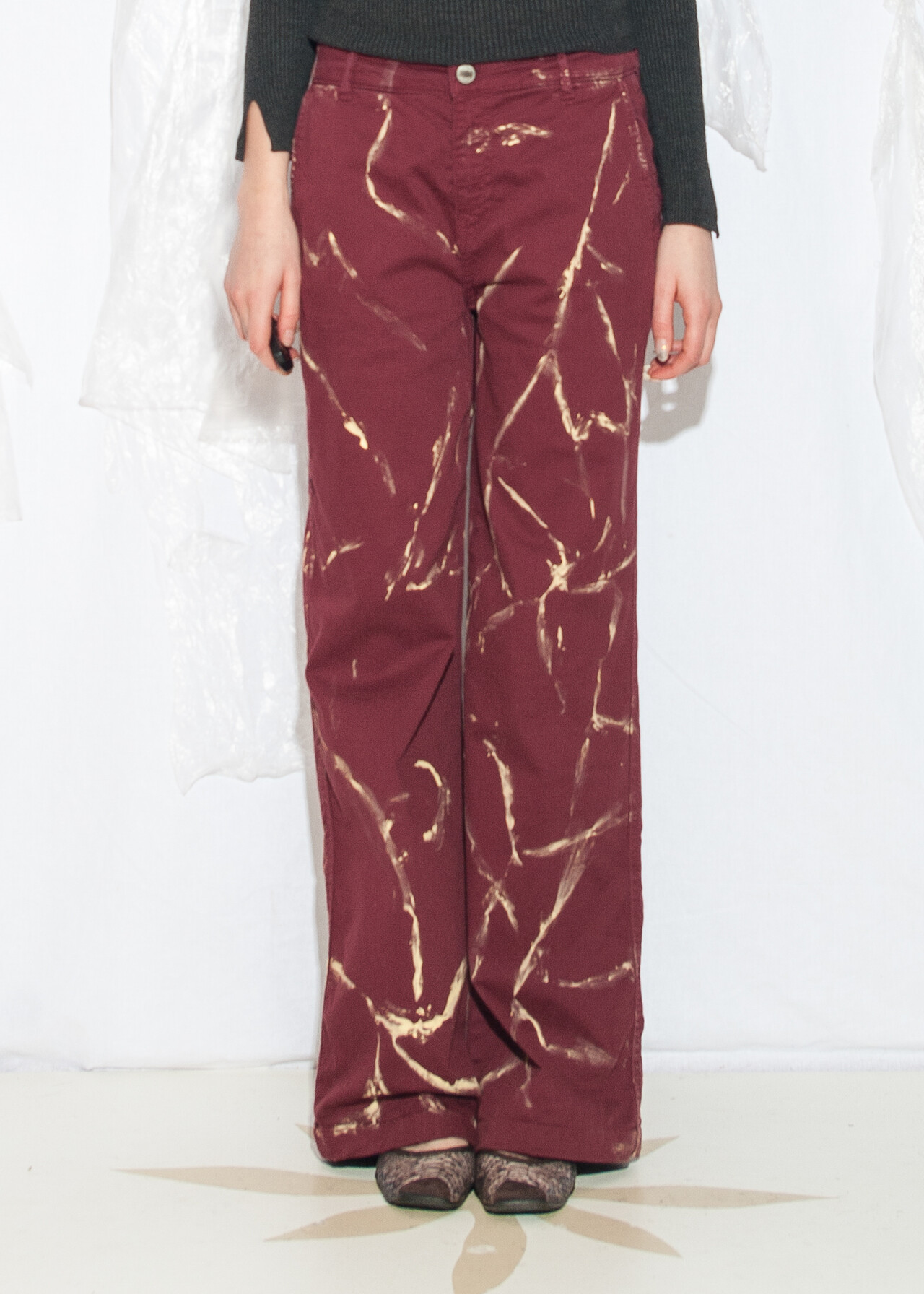 Tags: 00s streetwear look, 2000s style fashion, grunge outfit, hand-painted, marble pattern, natural fabric, upcycled jeans, wide leg trousers, y2k vintage clothing