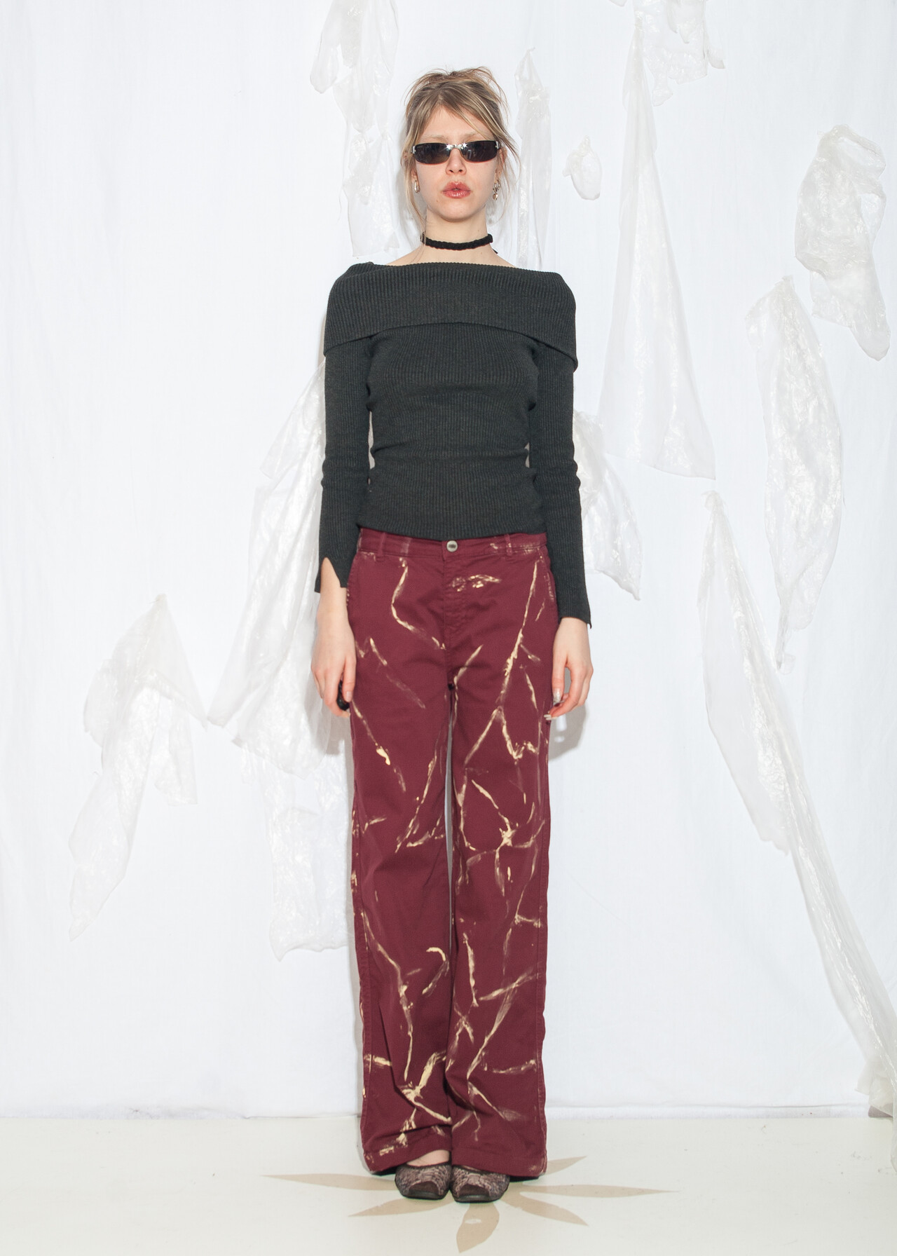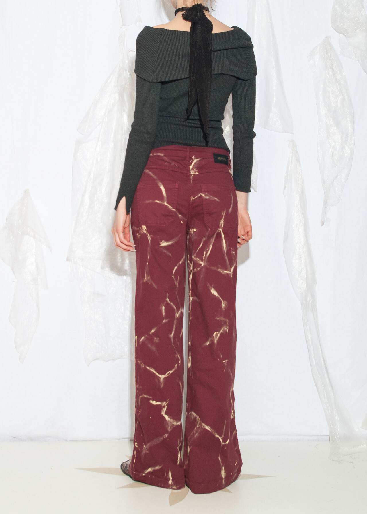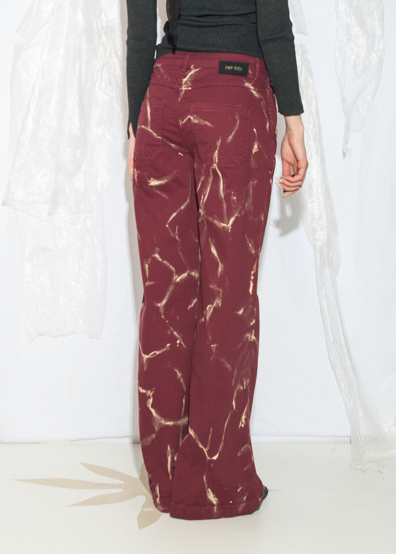 Tags: 00s streetwear look, 2000s style fashion, grunge outfit, hand-painted, marble pattern, natural fabric, upcycled jeans, wide leg trousers, y2k vintage clothing