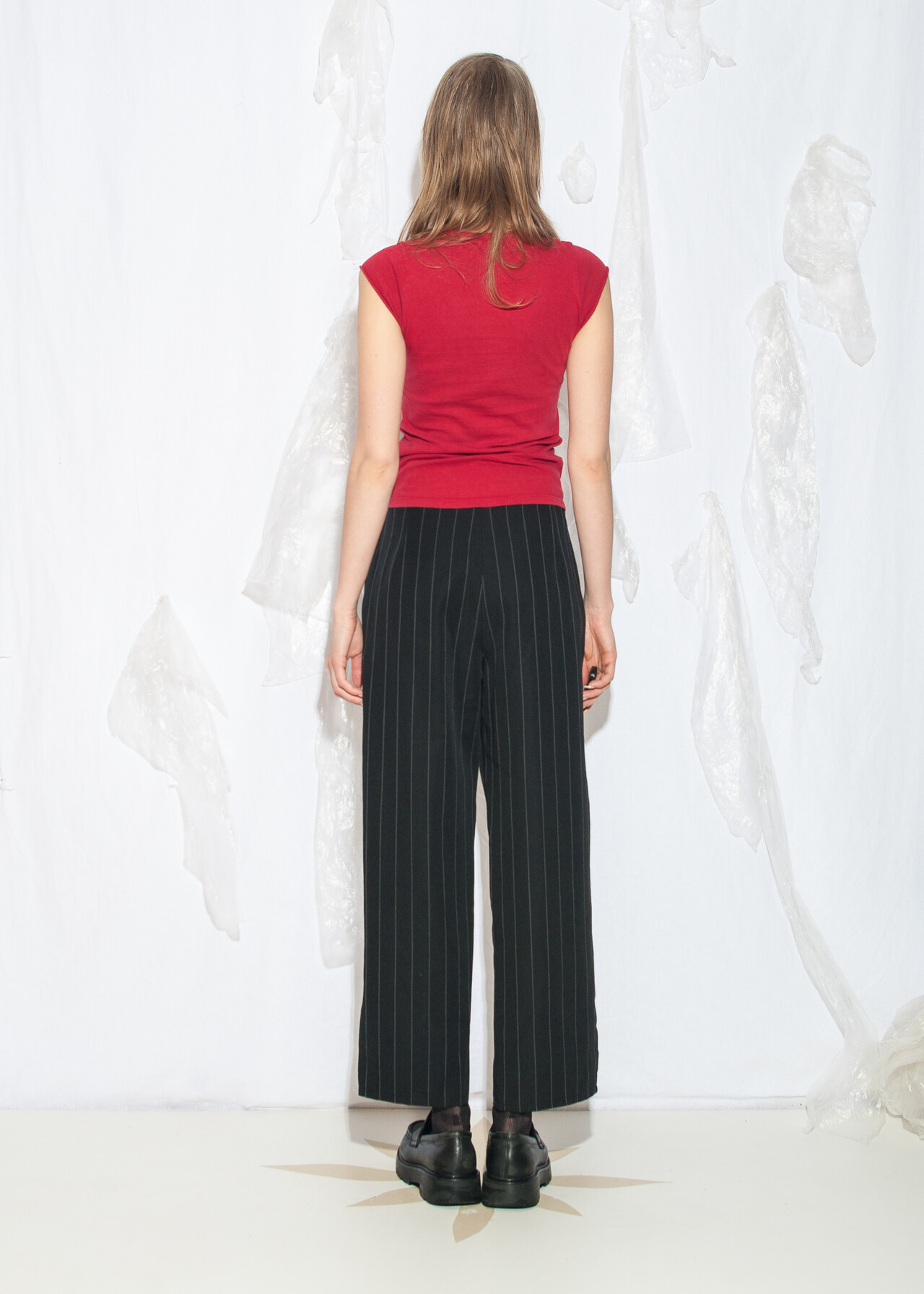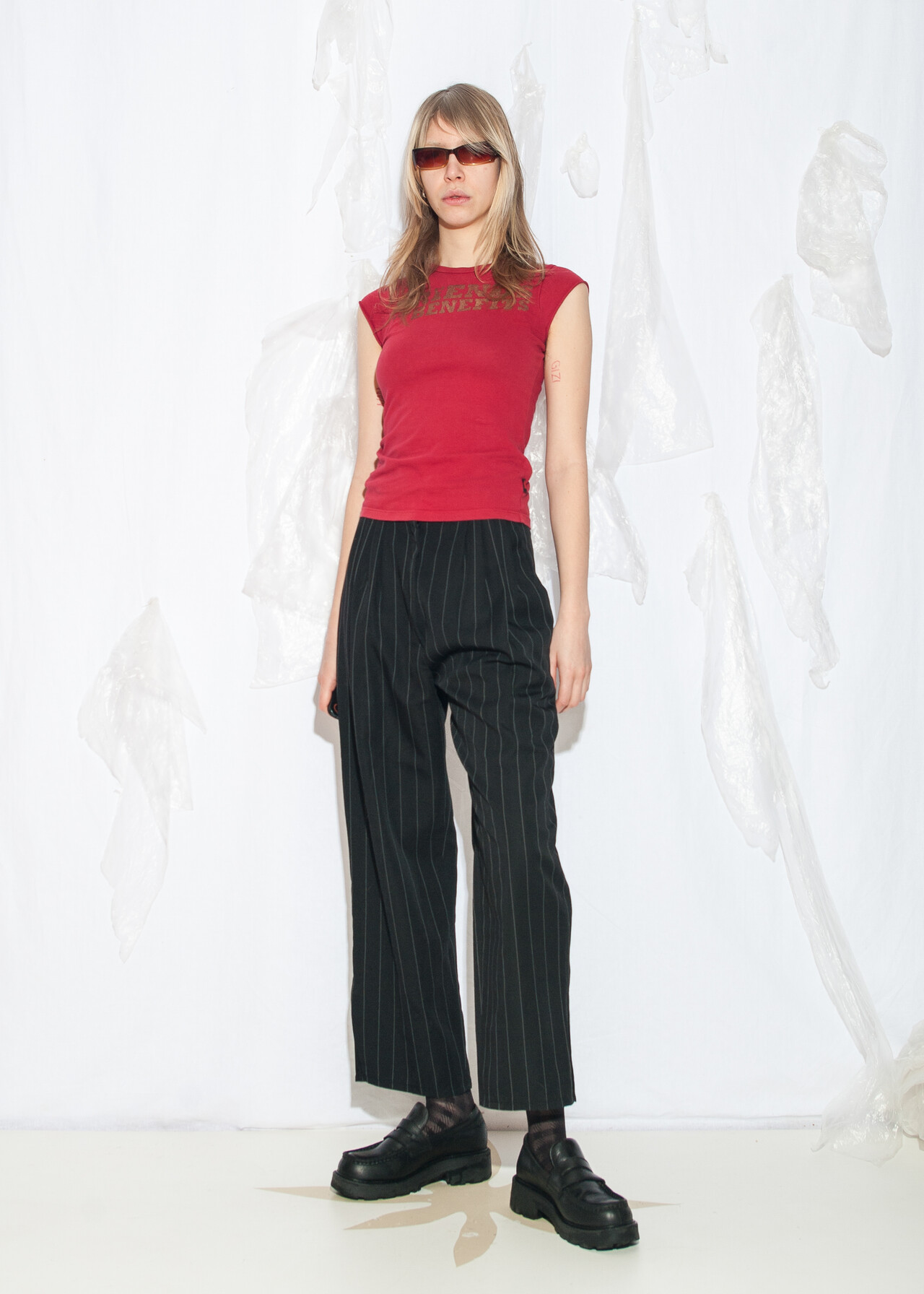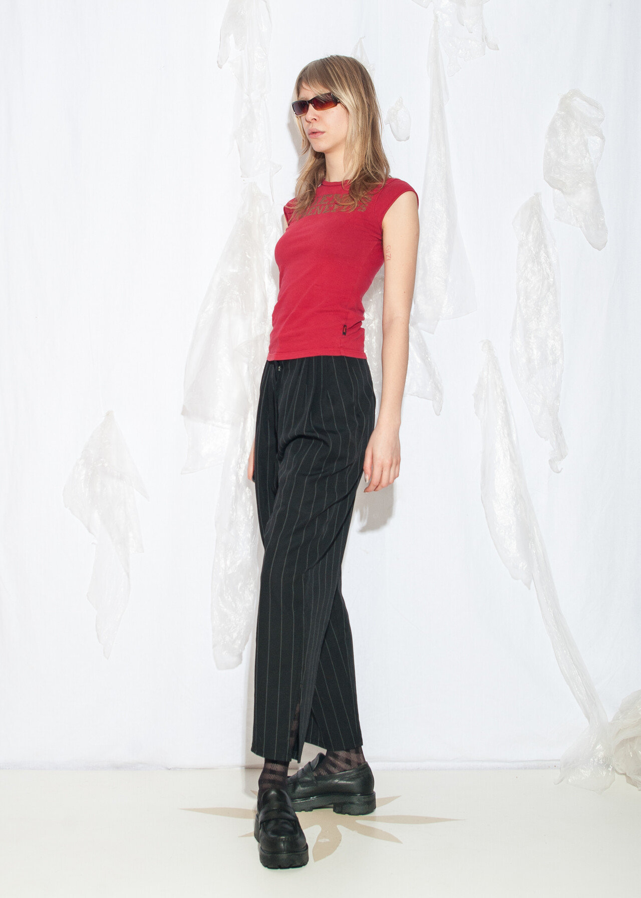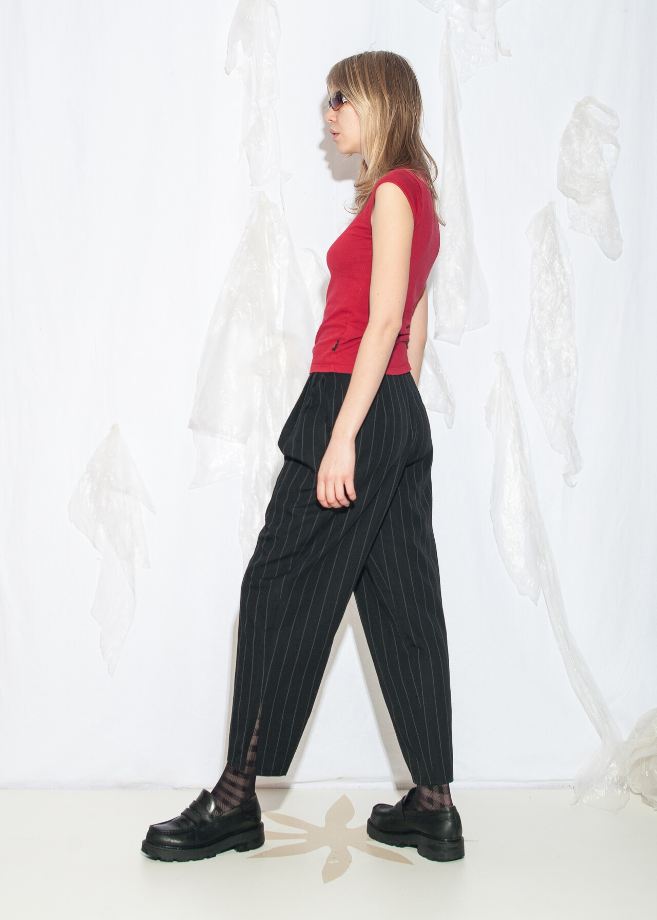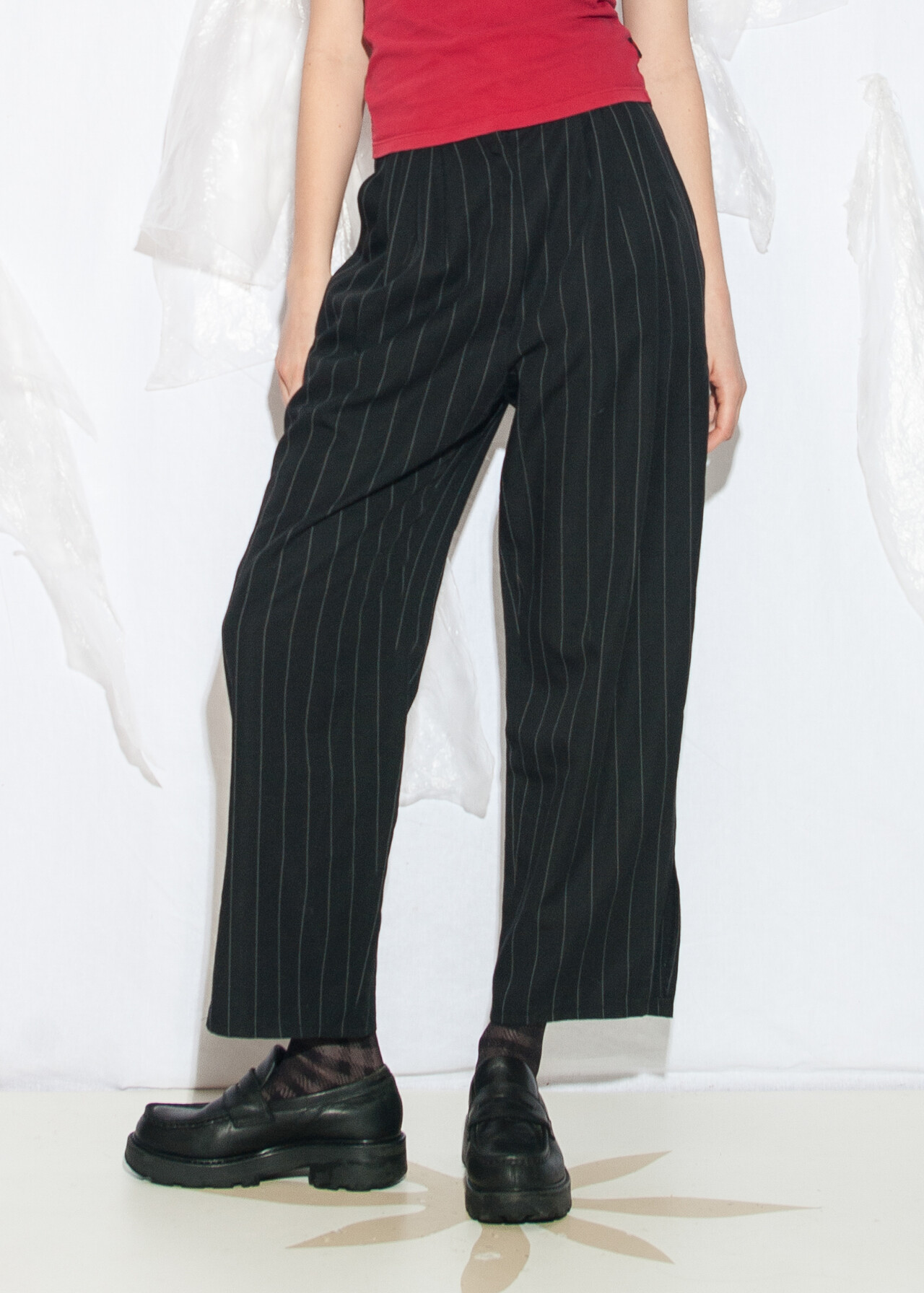 Tags: 80s vintage clothing, grunge outfit, maffia look, office siren, pinstriped pants, pleated waist, wide leg trousers, wool blend, y2k style fashion