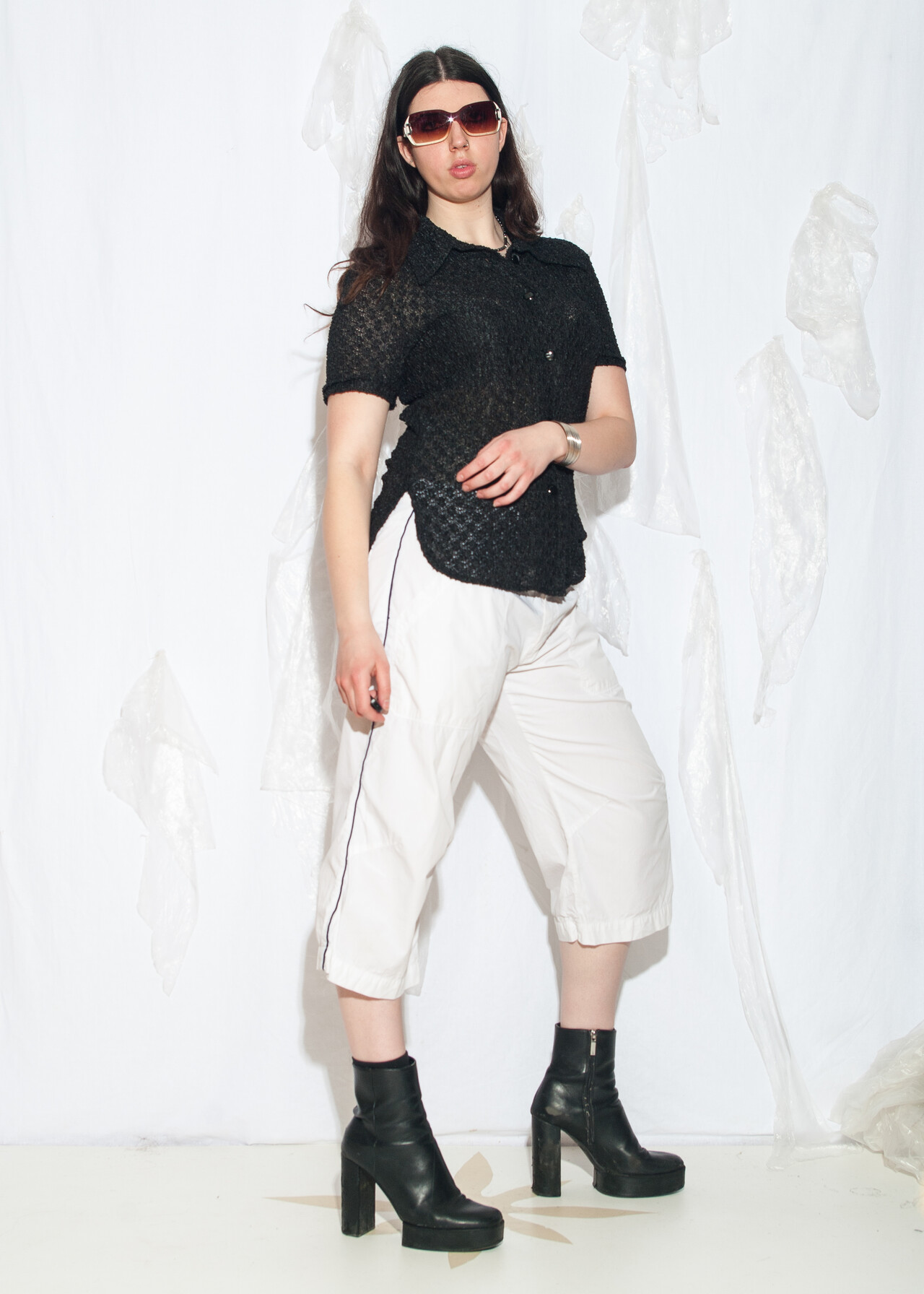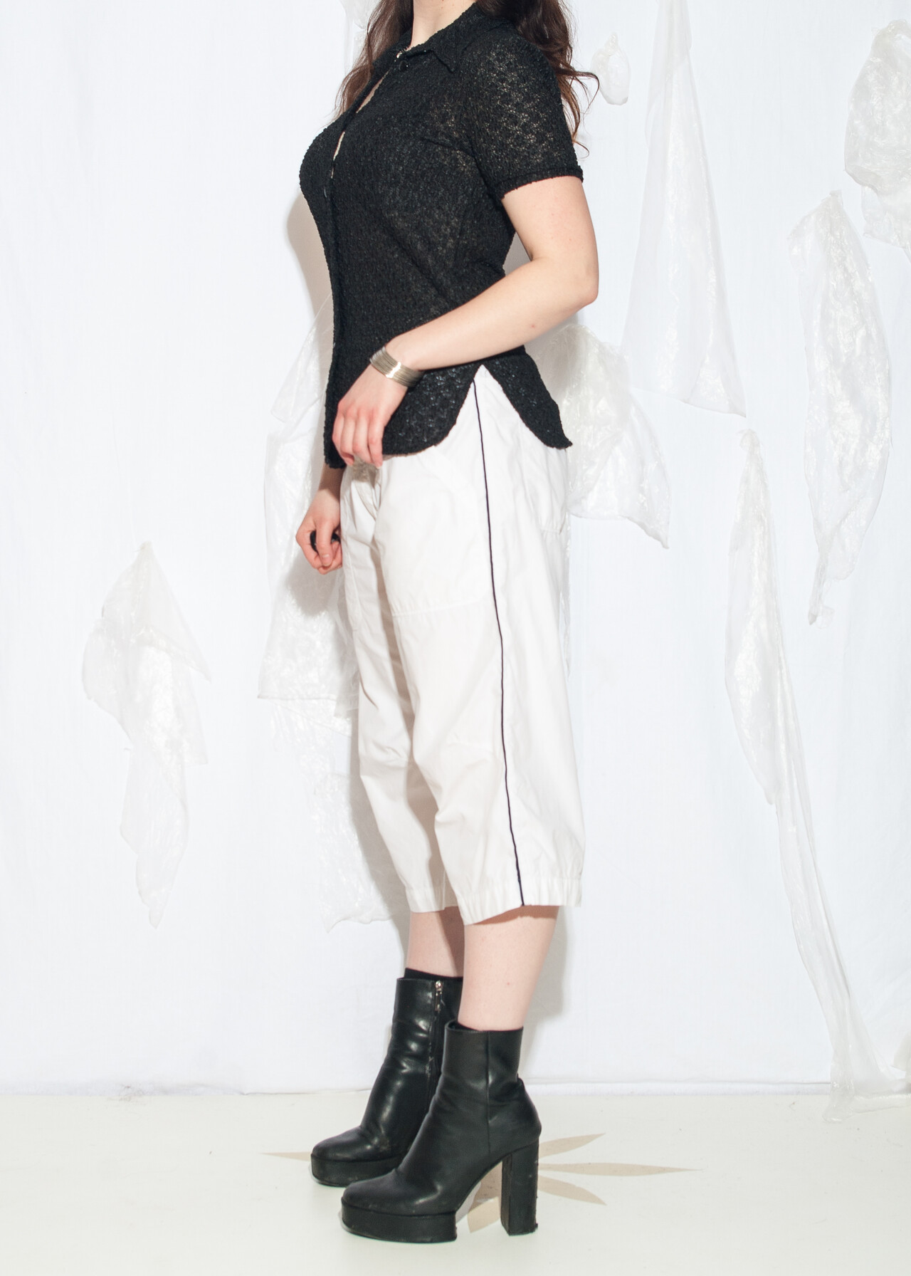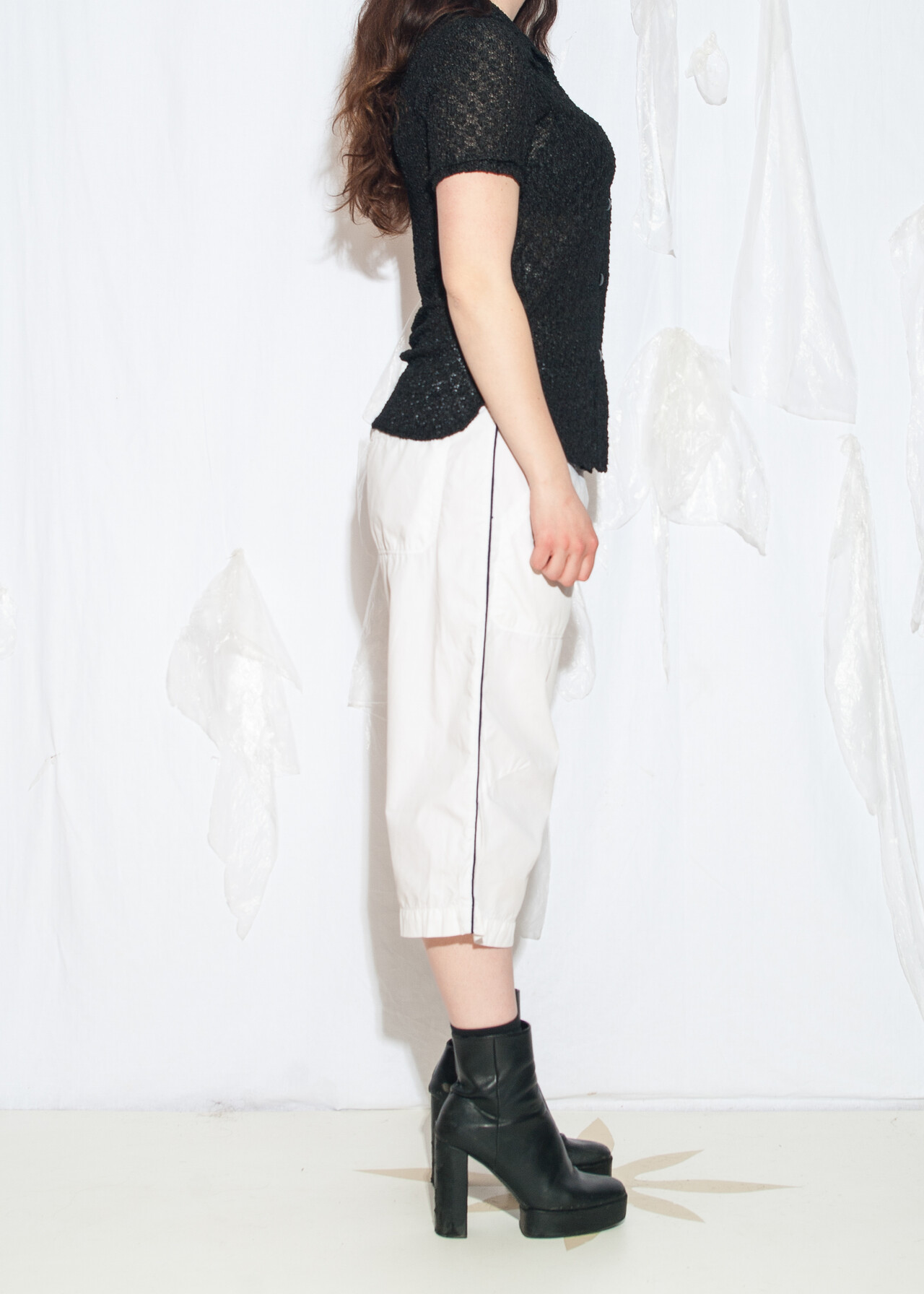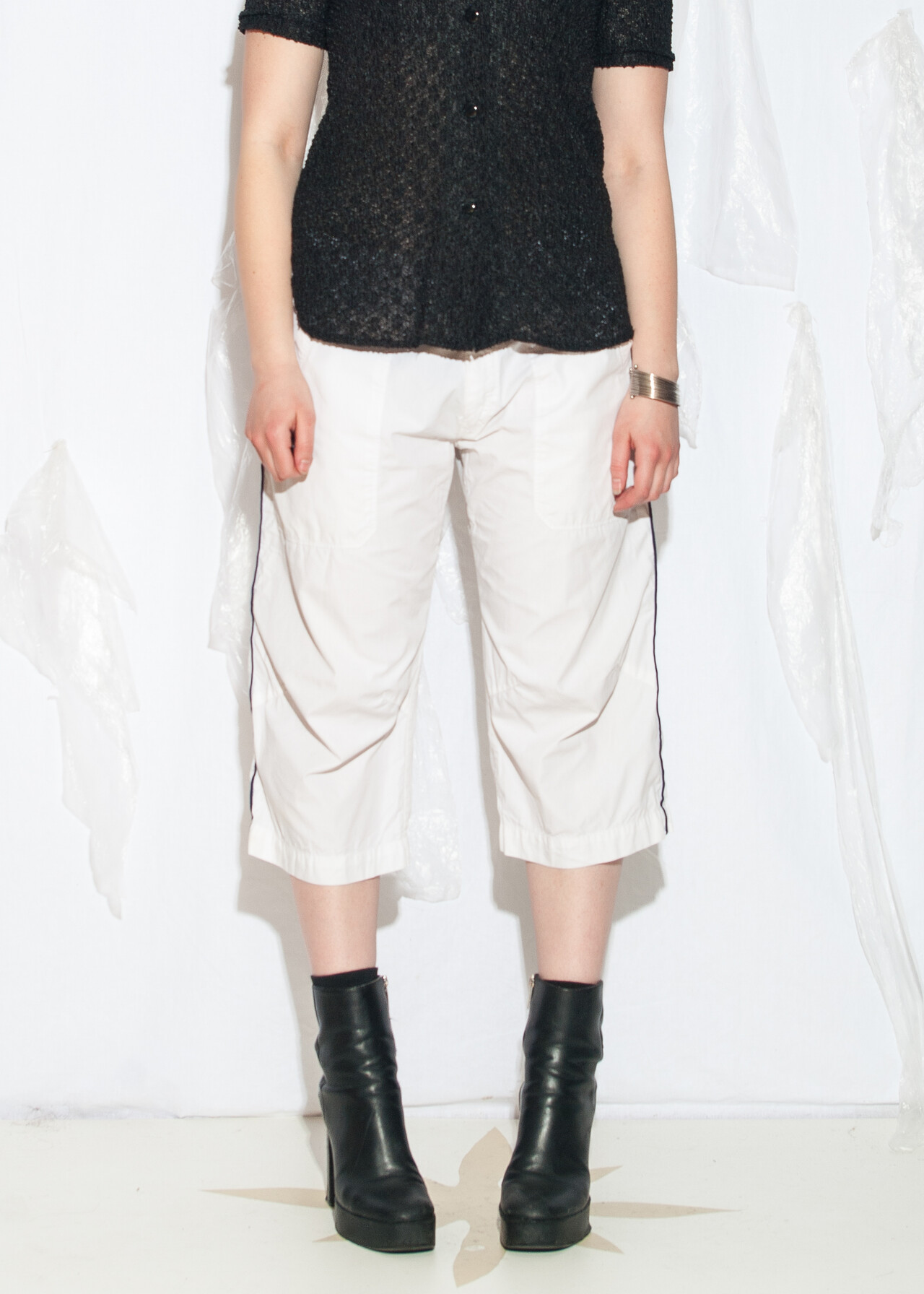 Tags: 2000s style fashion, boyfriend fit, capri pants, energie, European vintage, middle rise waist, Miss Sixty, sporty coquette, white sports shorts, y2k vintage clothing