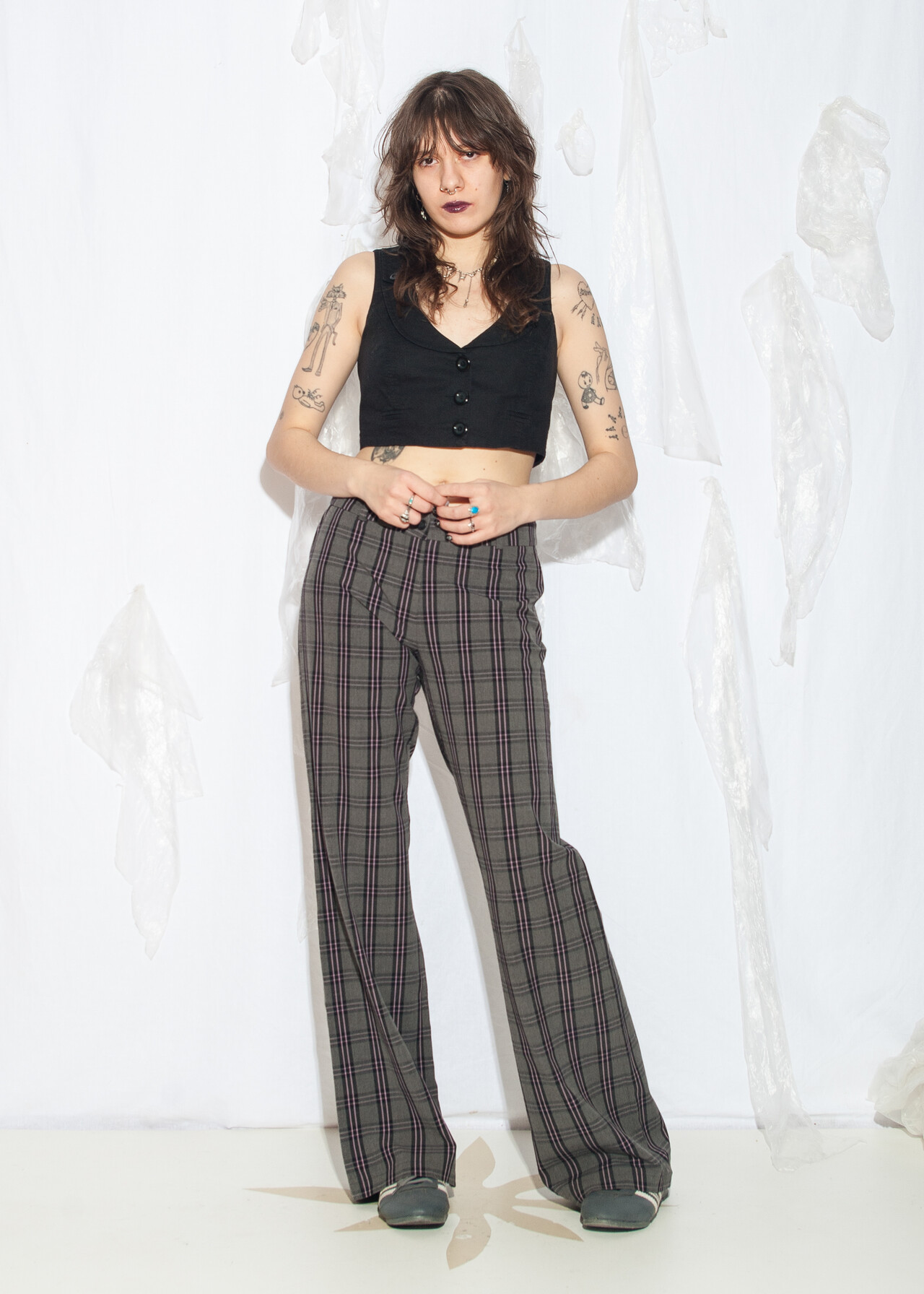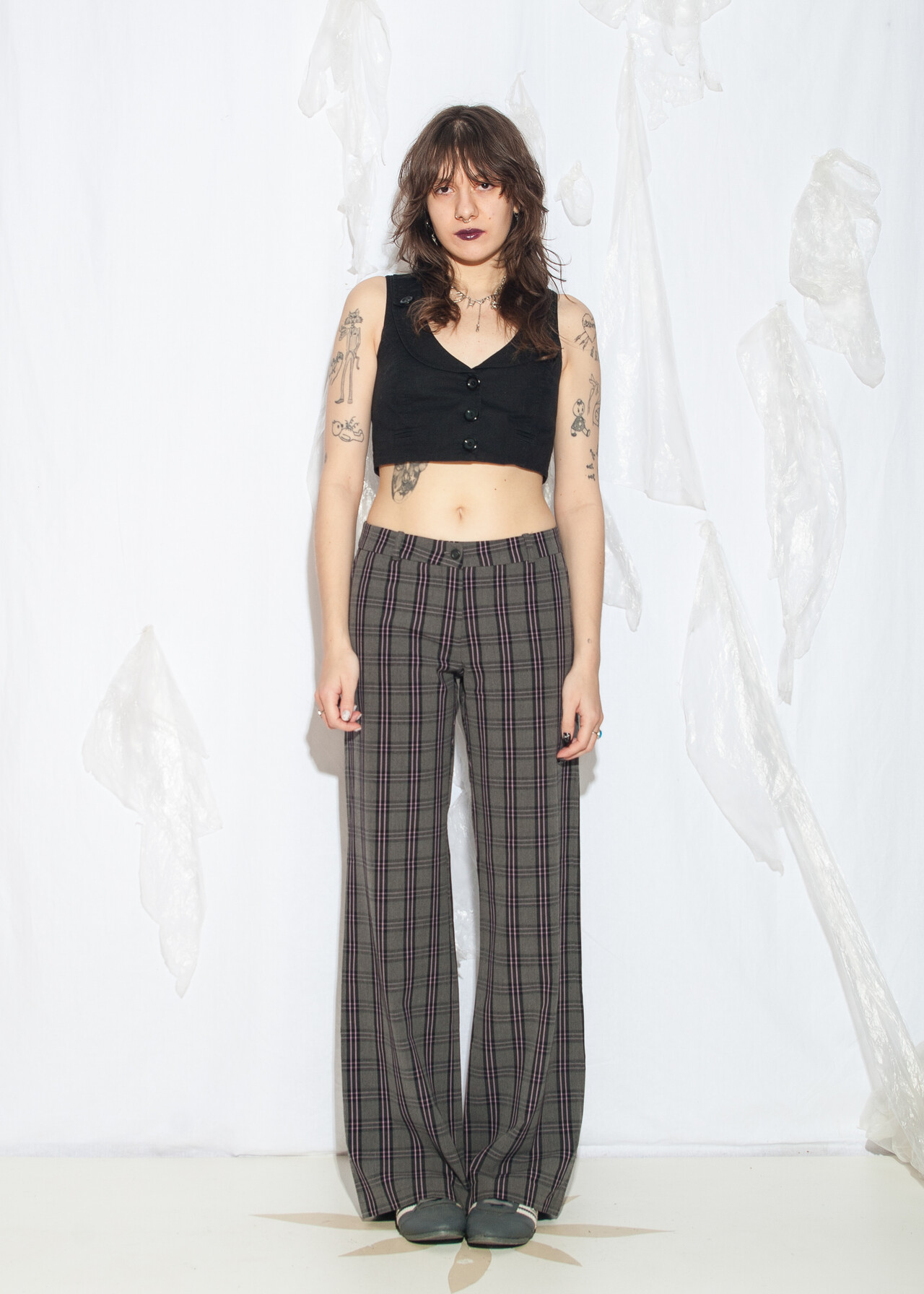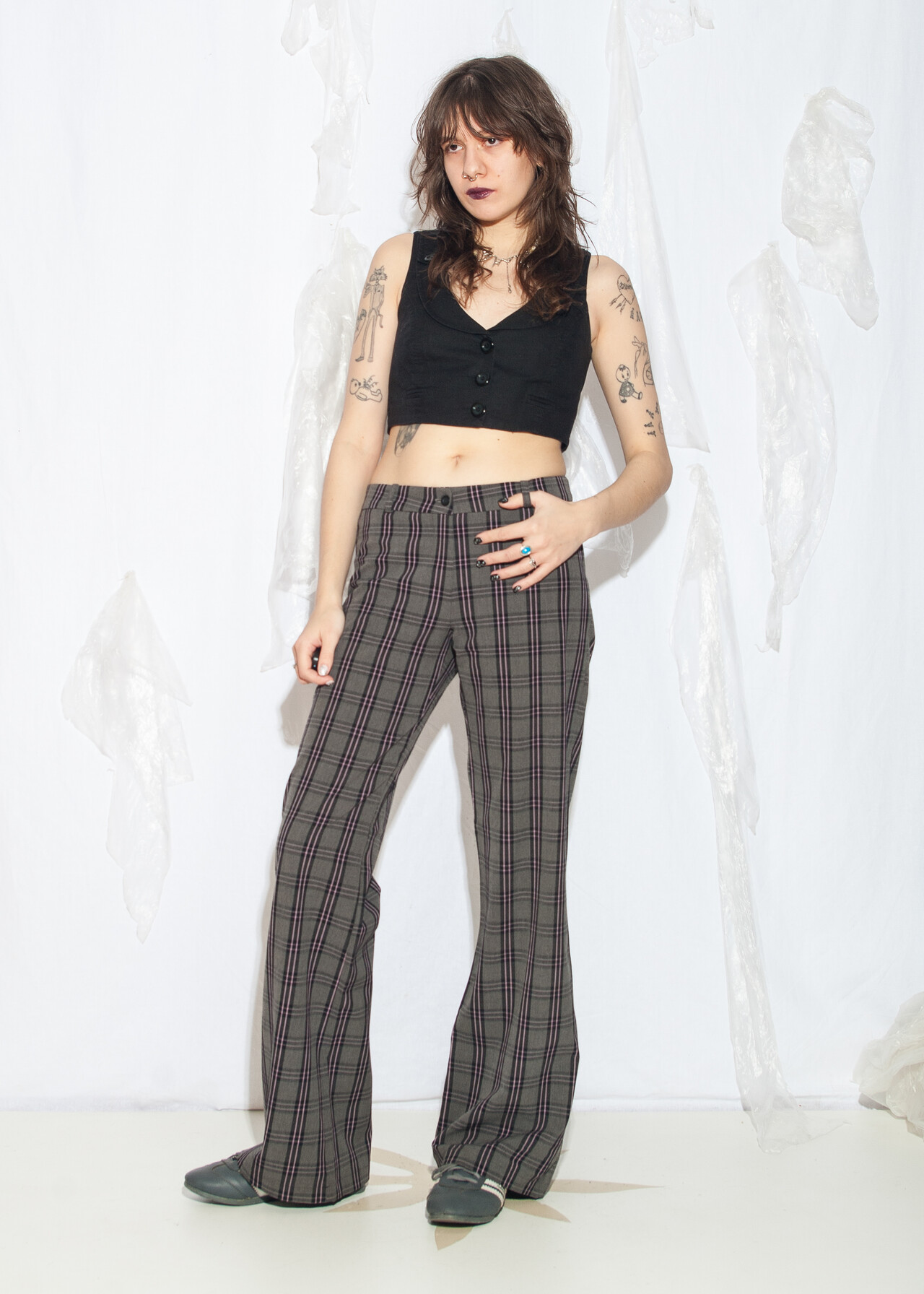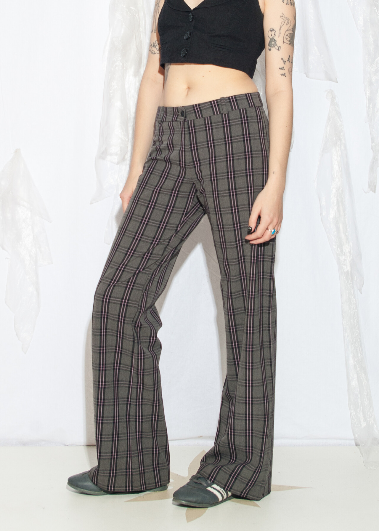 Tags: 00s streetwear look, 2000s style fashion, checked punk pants, grunge outfit, middle rise waist, plaid flares, whimsigoth, y2k vintage clothing