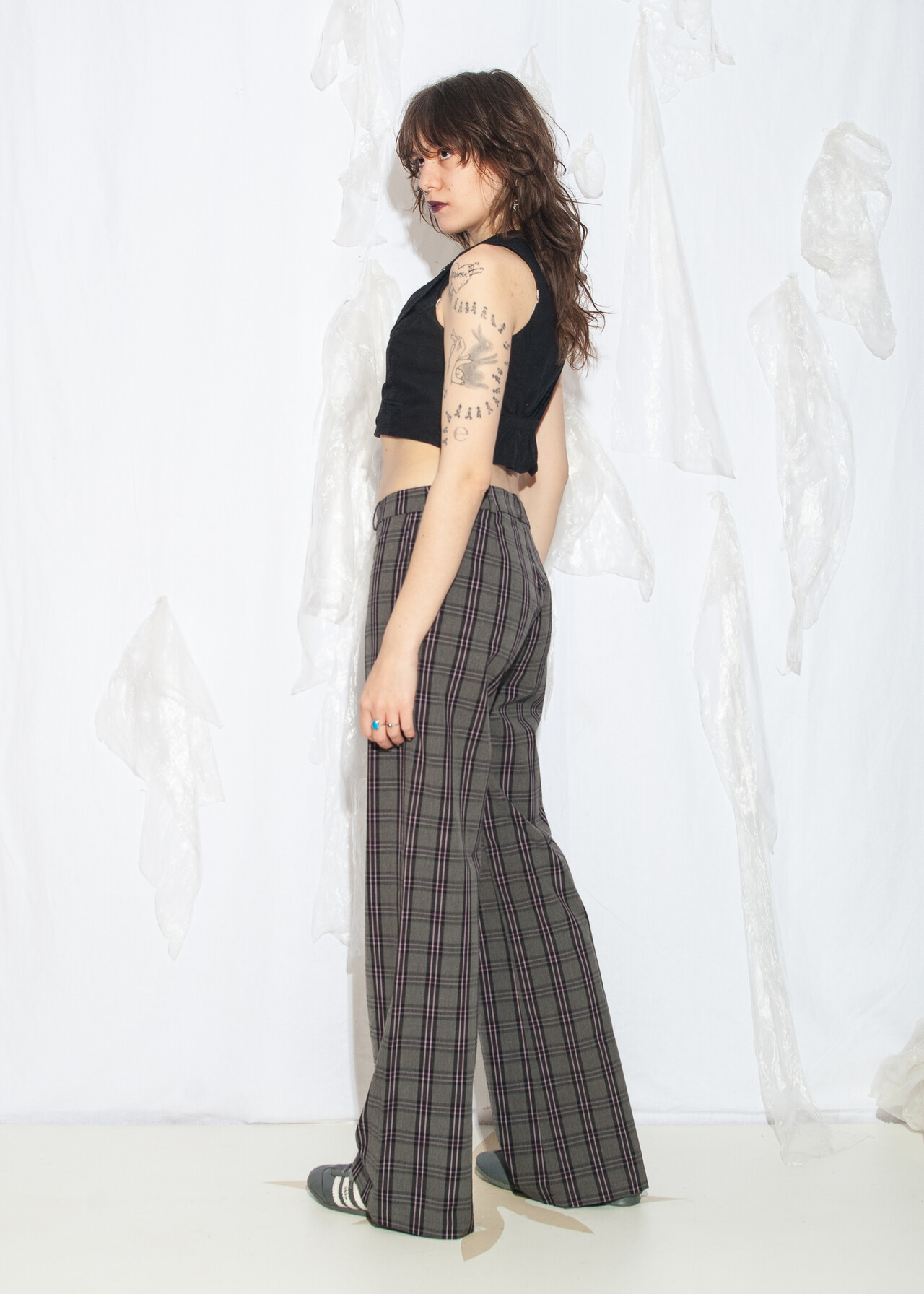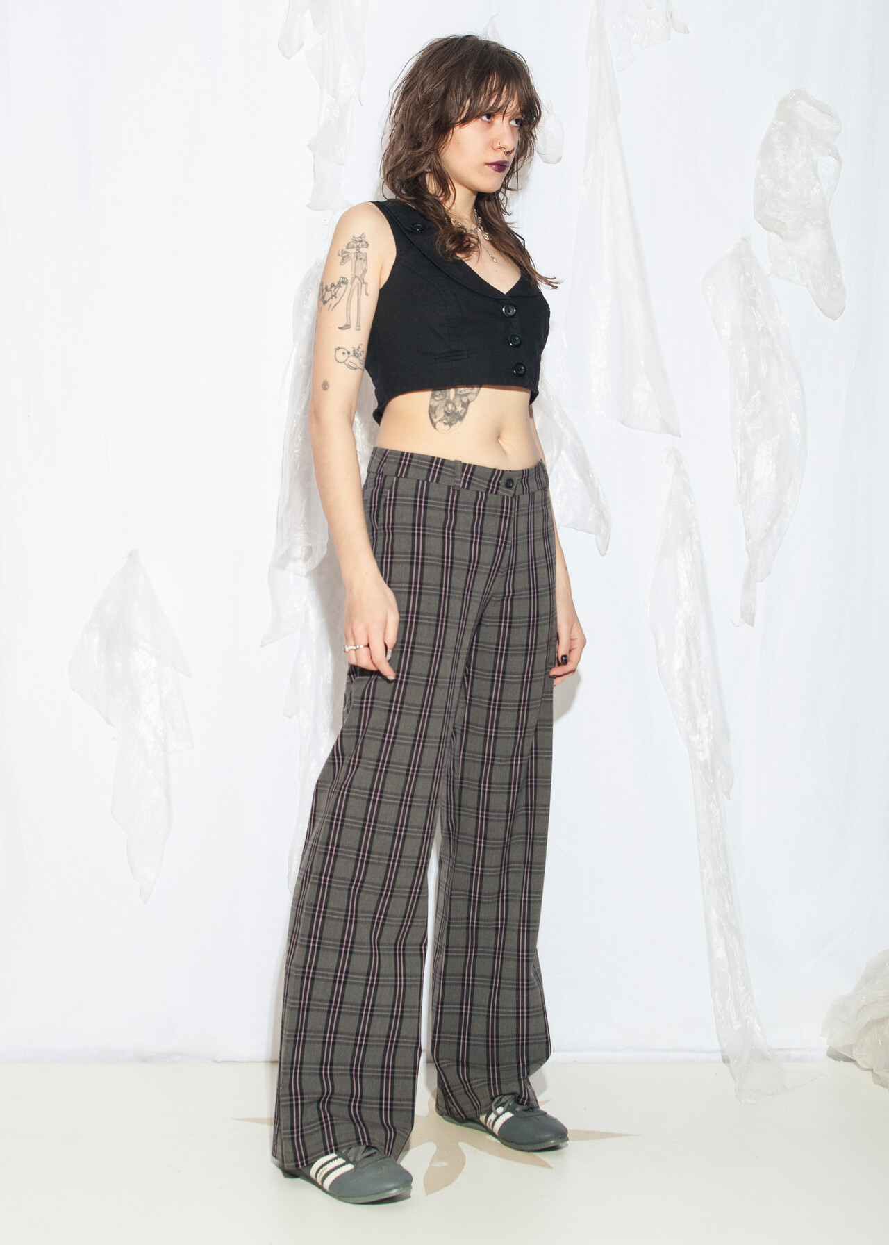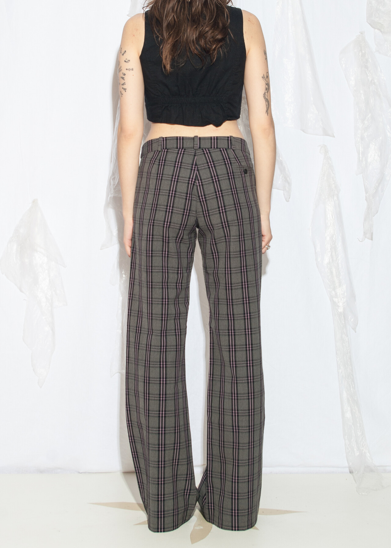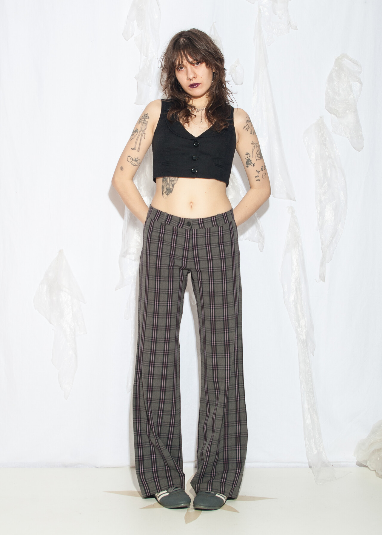 Tags: 00s streetwear look, 2000s style fashion, checked punk pants, grunge outfit, middle rise waist, plaid flares, whimsigoth, y2k vintage clothing