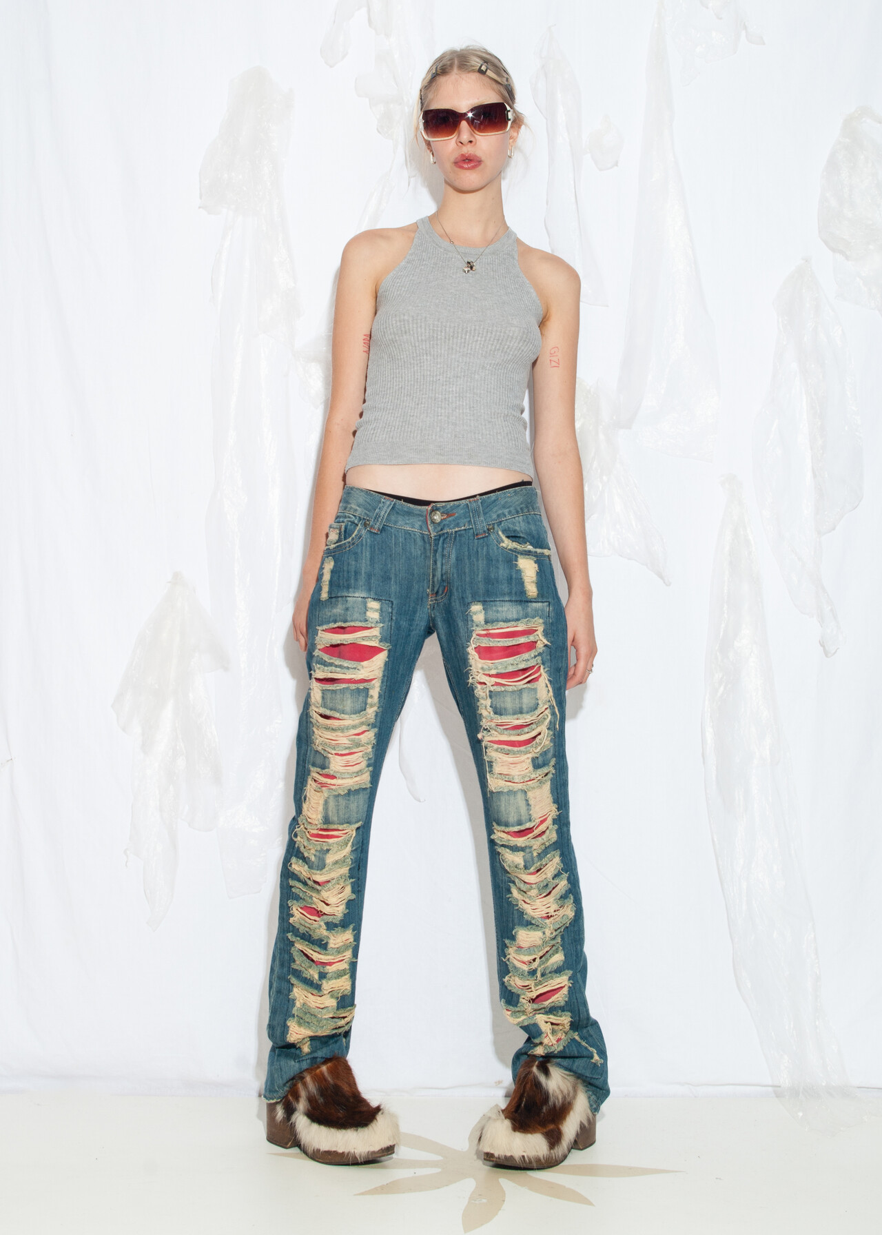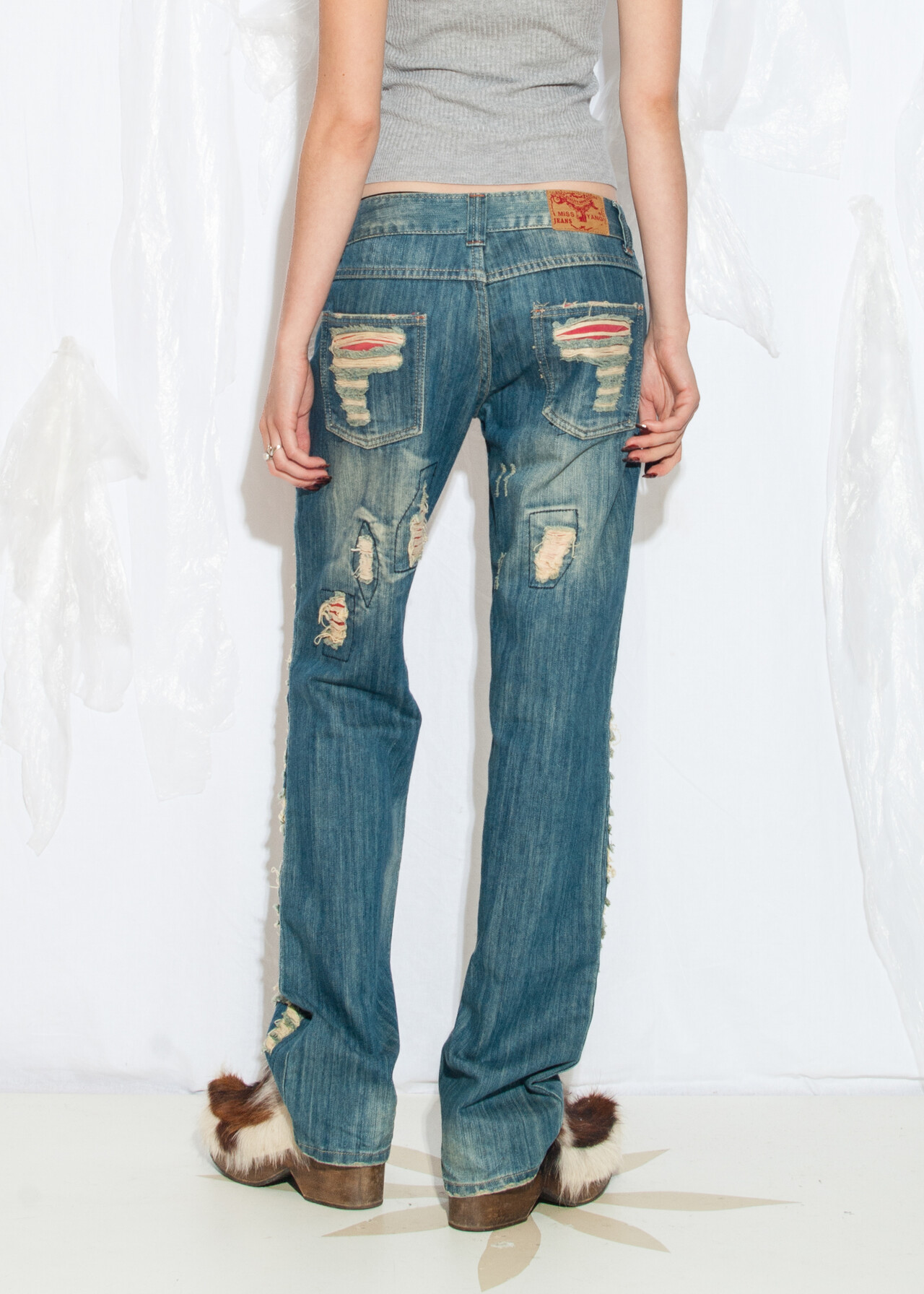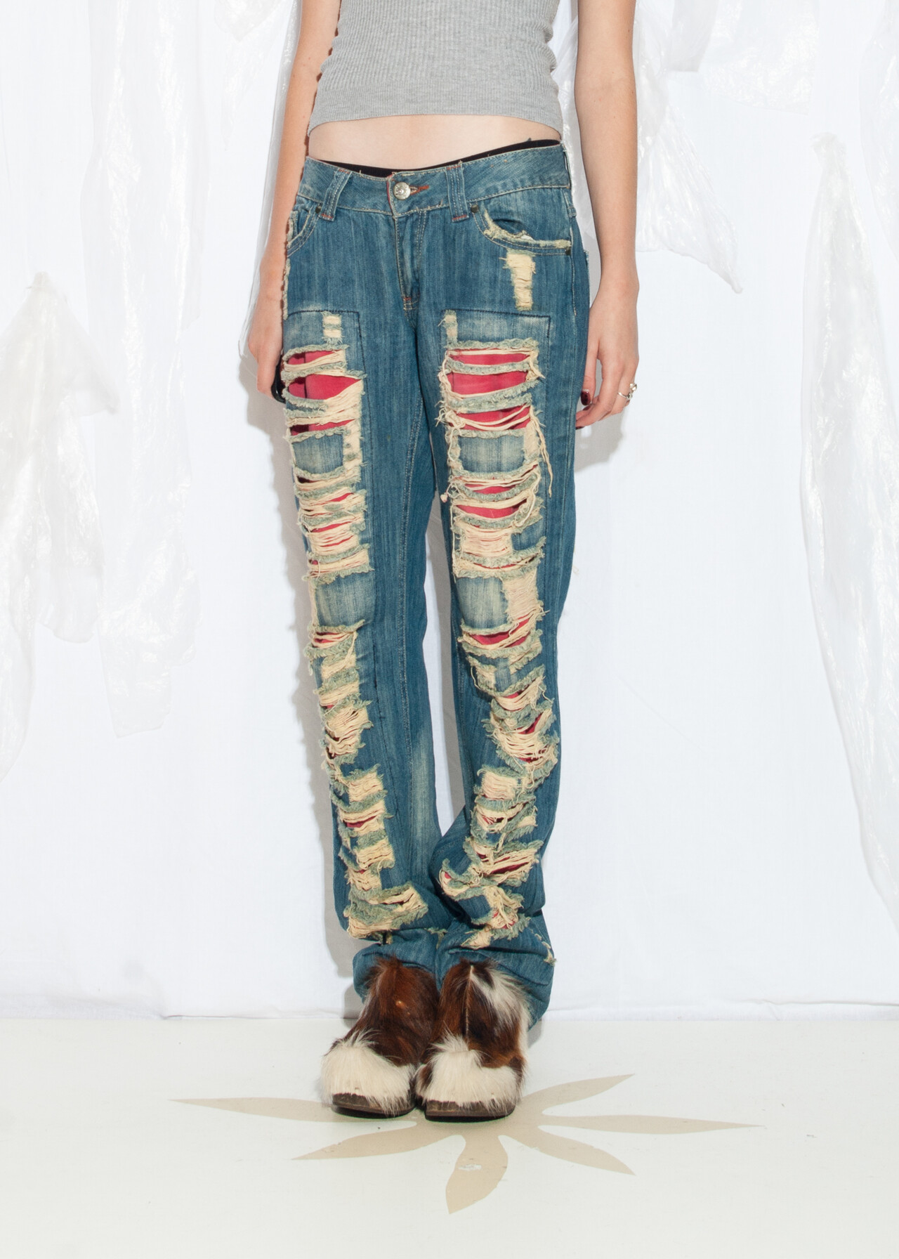 These shredded Y2K vintage statement jeans are the ticket to a 2000s grunge revival, because who wouldn’t want to relive the low-rise, distressed denim days when flip phones were our closest companions?