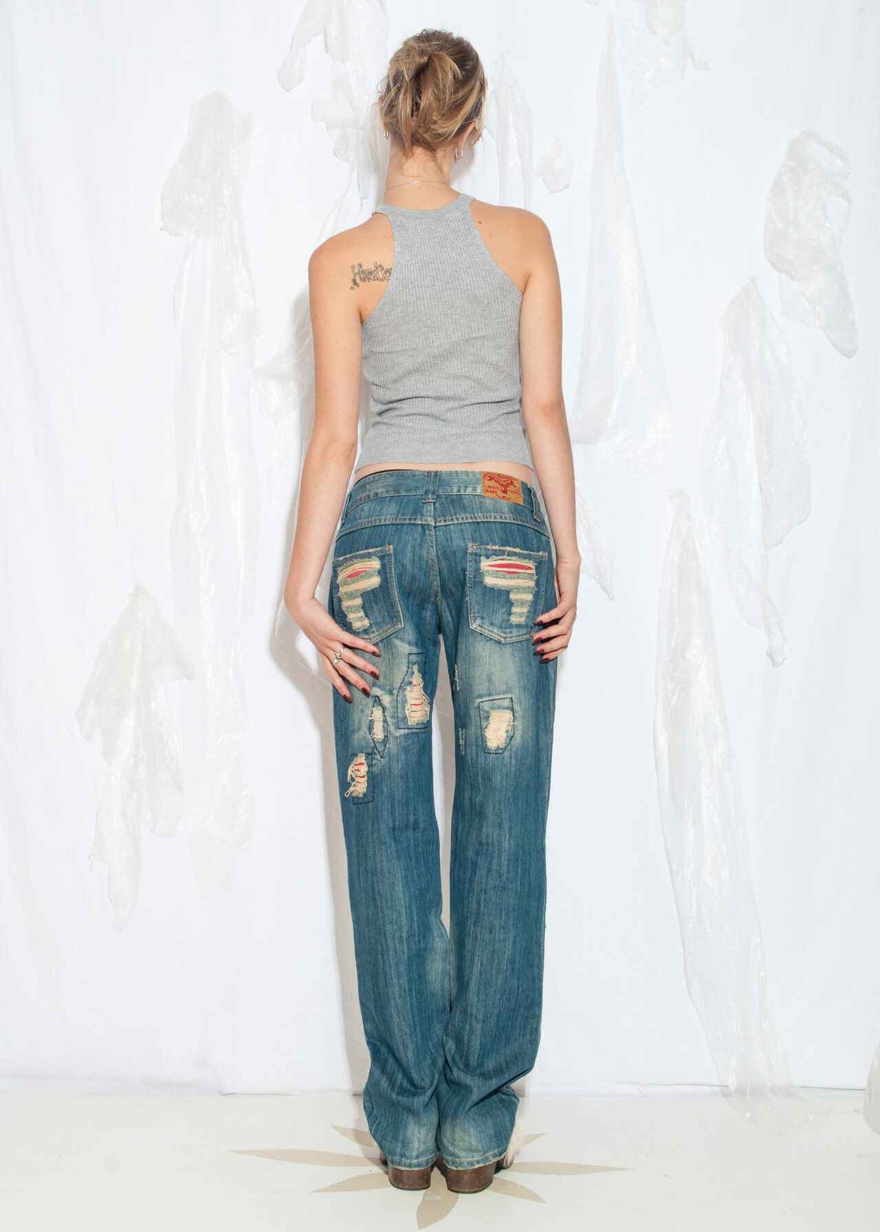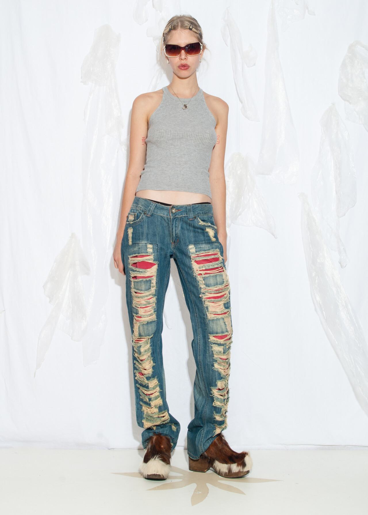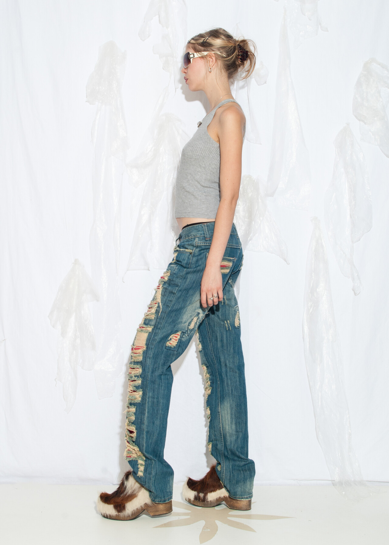 These shredded Y2K vintage statement jeans are the ticket to a 2000s grunge revival, because who wouldn’t want to relive the low-rise, distressed denim days when flip phones were our closest companions?