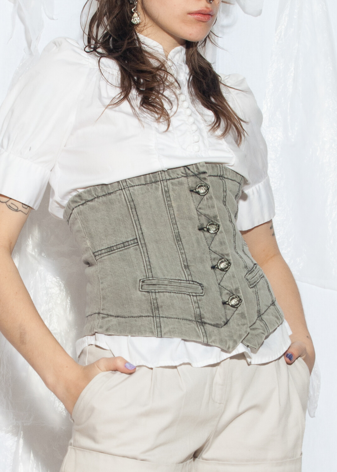 This Y2K vintage vest is the ultimate denim corset for anyone wanting to channel their inner 2000s icon without breaking a sweat. Rock this grey underbust top and watch as your style goes from zero to “omg, is that a time traveler?!” in seconds.