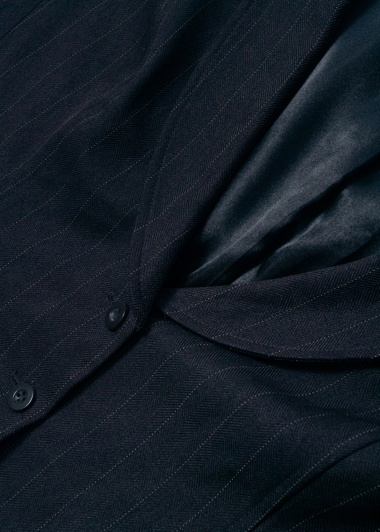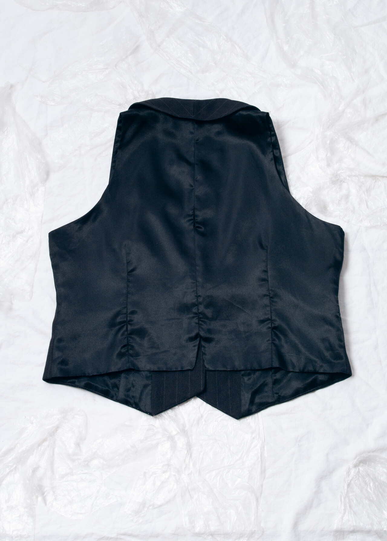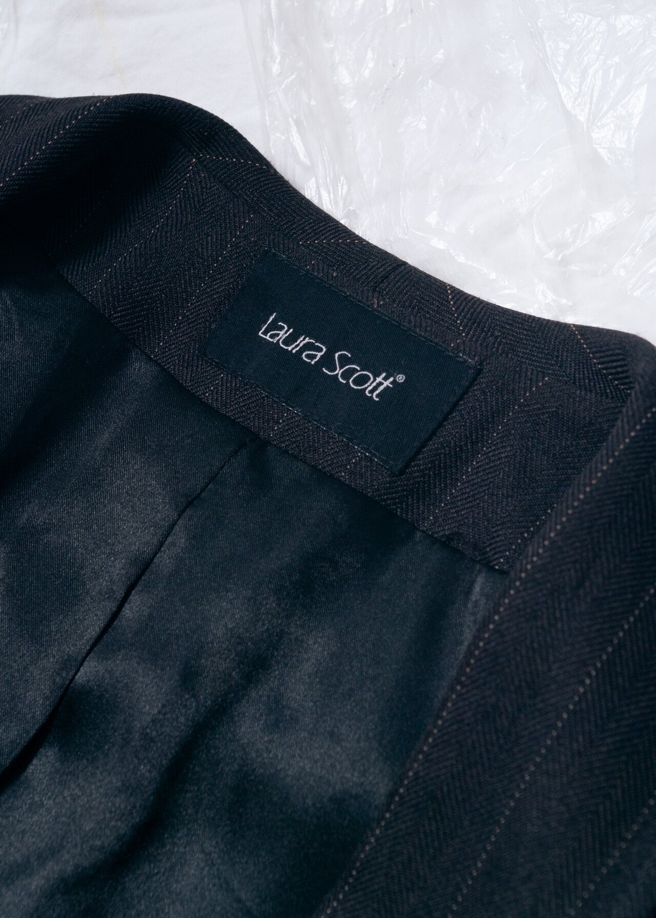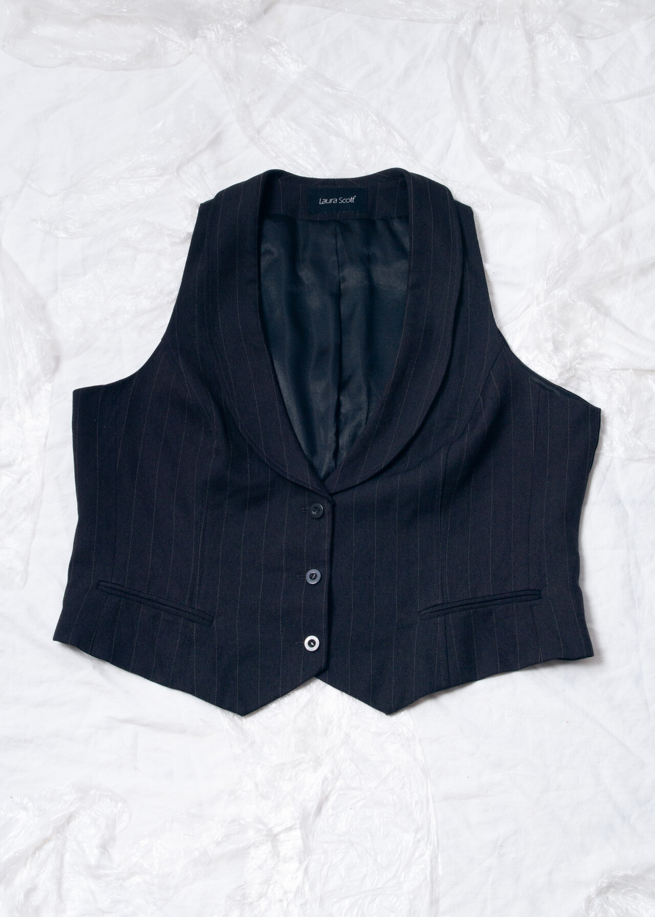 This Y2K vintage vest by Laura Scott is a fitted waistcoat that screams office siren vibes with its sleek pinstriped design.