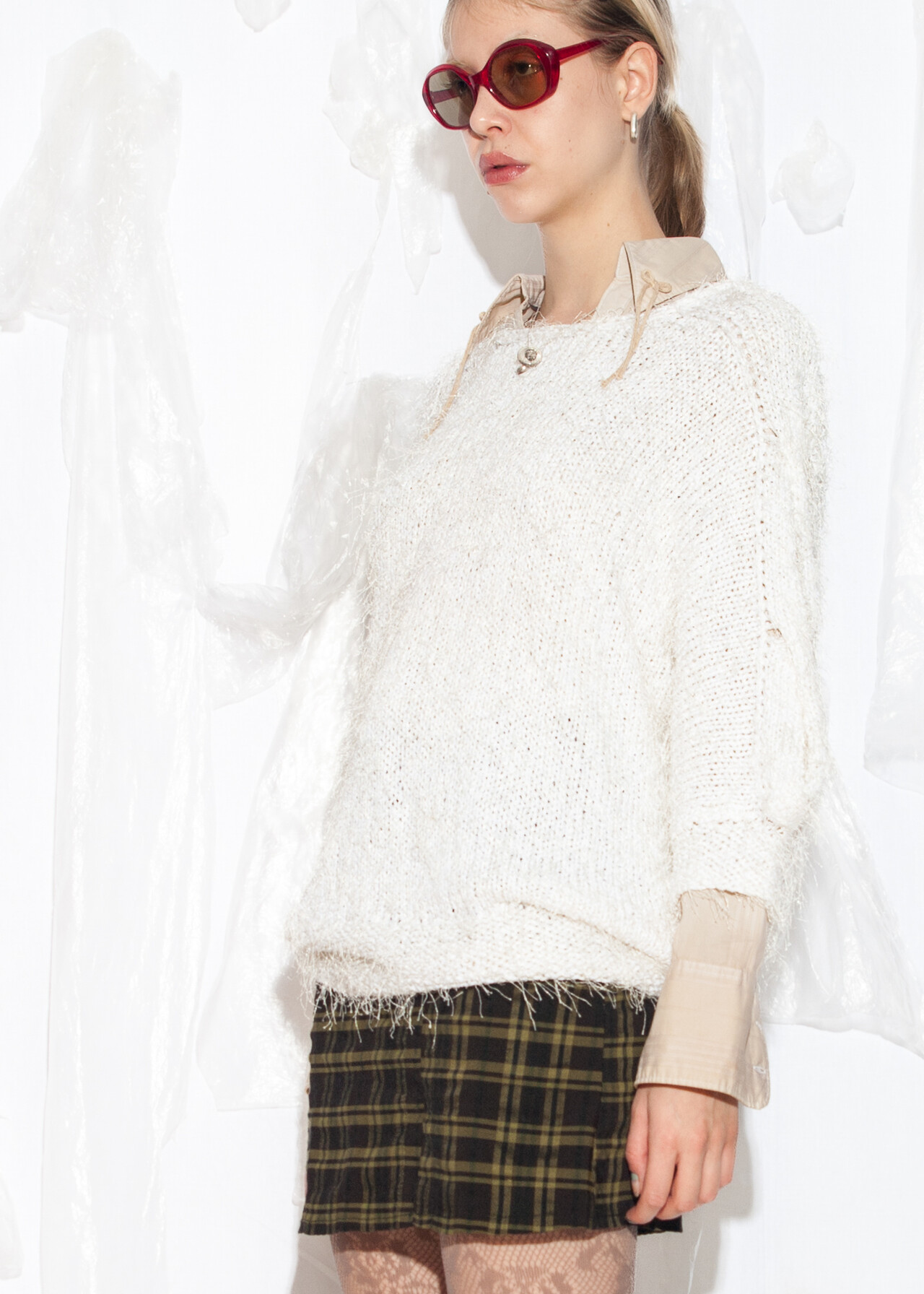 Tags: 80s vintage fashion, fluffy jumper, furry white sweater, knit pullover, oversized, slouchy top, y2k style clothing