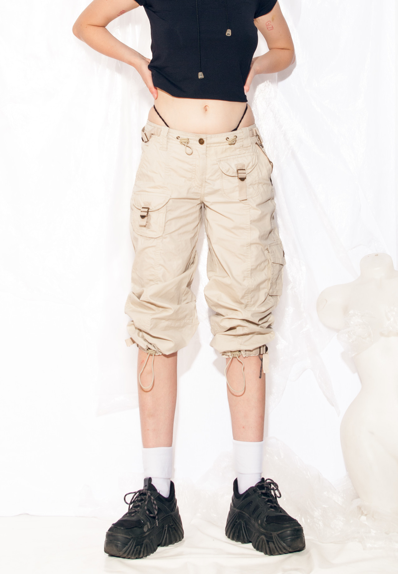 Y2K vintage gorpcore capri trousers. These cargo beauties in beige cotton are the epitome of sustainable swagger. With a zip closure and seven pockets, they’re perfect for storing all your gadgets…or just some snacks for a journey back to the early 2000s.