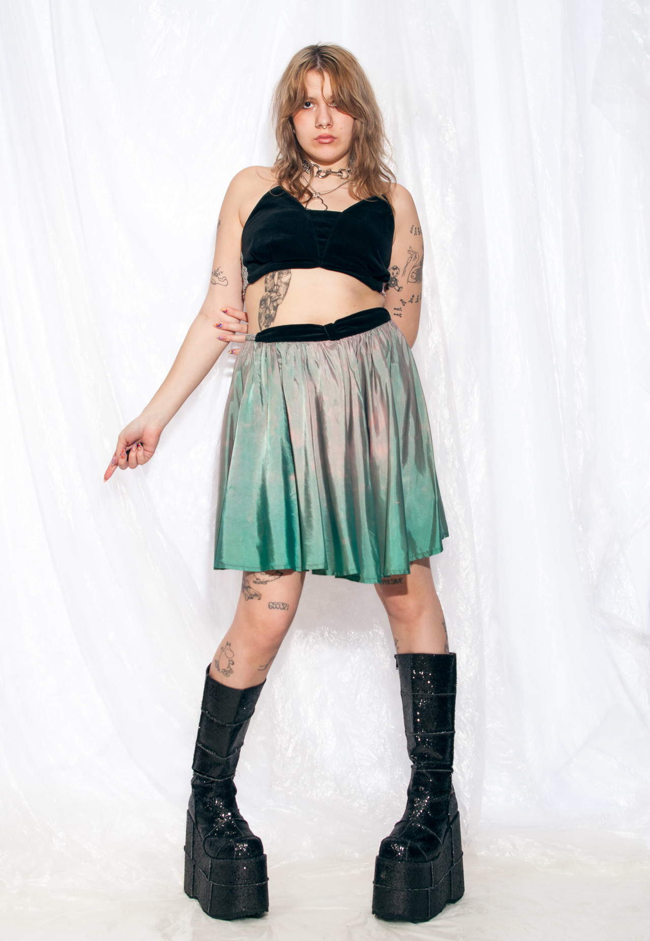 We made this party set by reworking an 80s vintage dress. It’s made of multi-coloured mixed fabric with velvet details, its hemline is asymmetric and its waist is stretchy. As you can see, our vintage shop is full of one-off treasures, take this one before it’s gone!