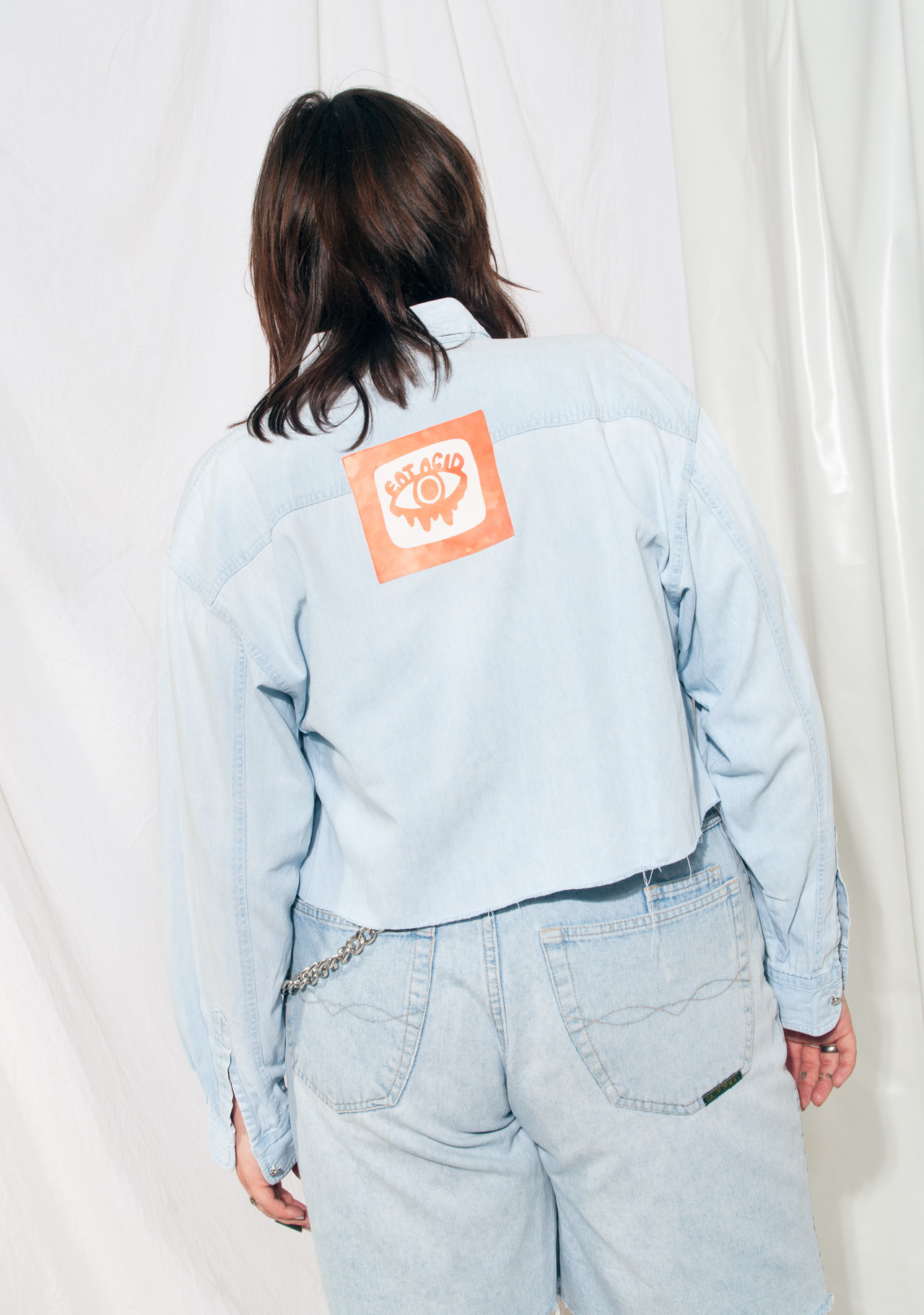 A reworked vintage denim shirt from the mid-90s, still in great condition. We cropped it and sewed one of our hand-printed Eat Acid patches on its back. Featuring button closure and natural cotton fabric. As it’s oversized, it fits more sizes and can be worn as a shacket, too.