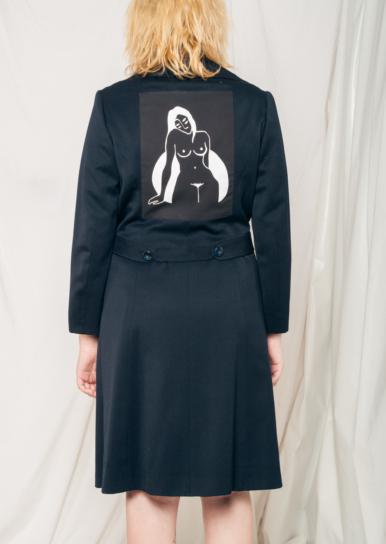 Reworked vintage trench coat still in flawless condition, a real gem straight from the 70s. We fixed and cleaned it for you and sewed a feminist nude patch on its back. It’s our own graphic hand-printed on black canvas. The coat features dark blue fabric and button closure. You know how to get the real vintage aesthetic? Simply skip fast fashion and create head-to-toe vintage outfits!