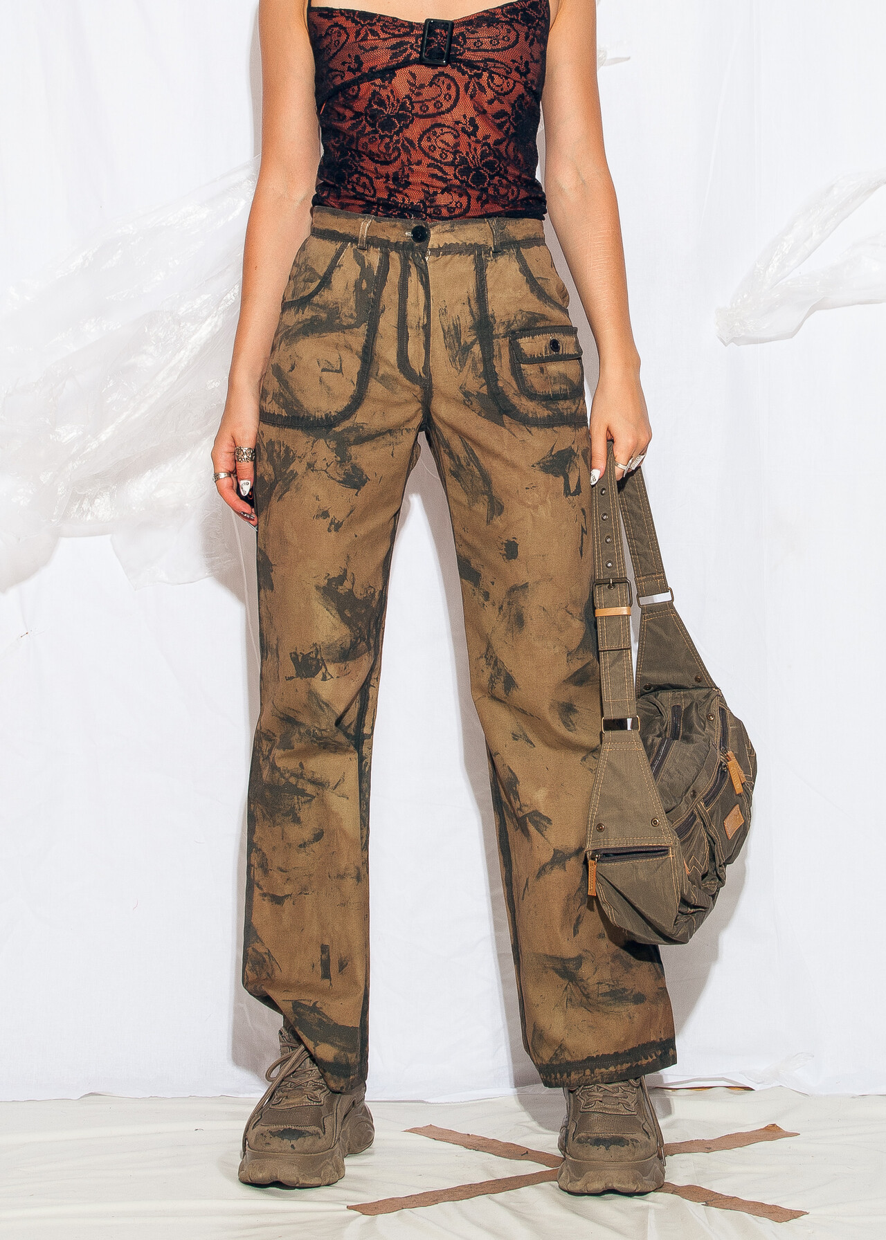 This 90s vintage trousers are a muddy delight, reworked and hand-painted to give your cargo pants the personality of a rebellious art project gone wonderfully right.