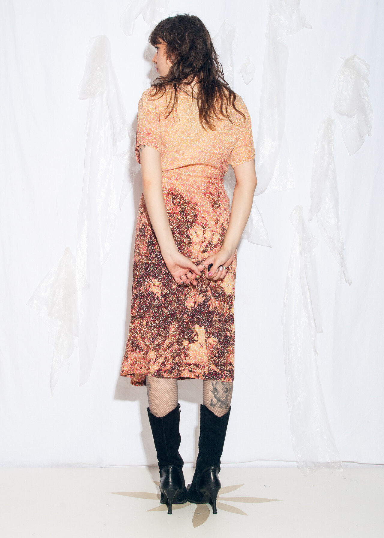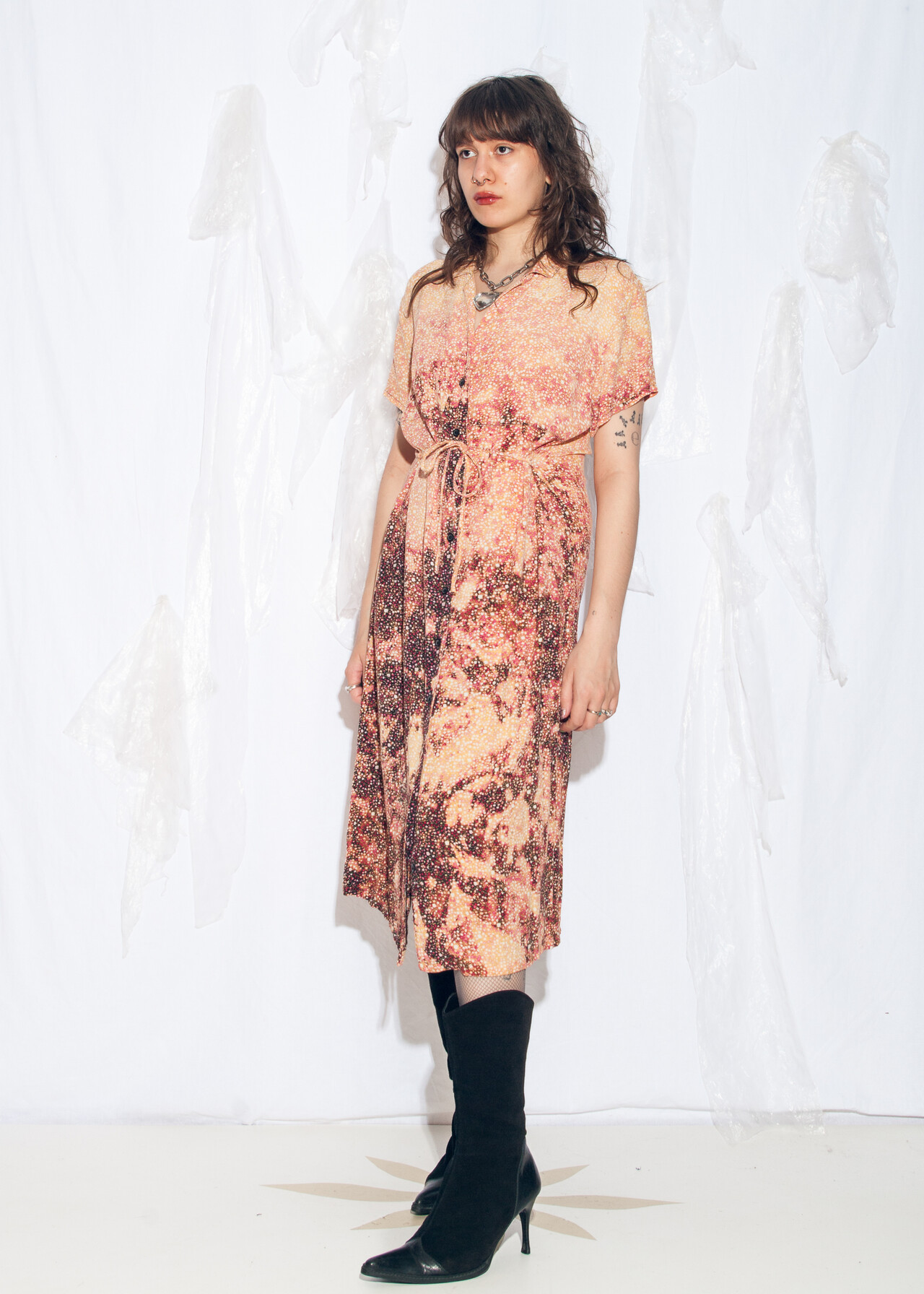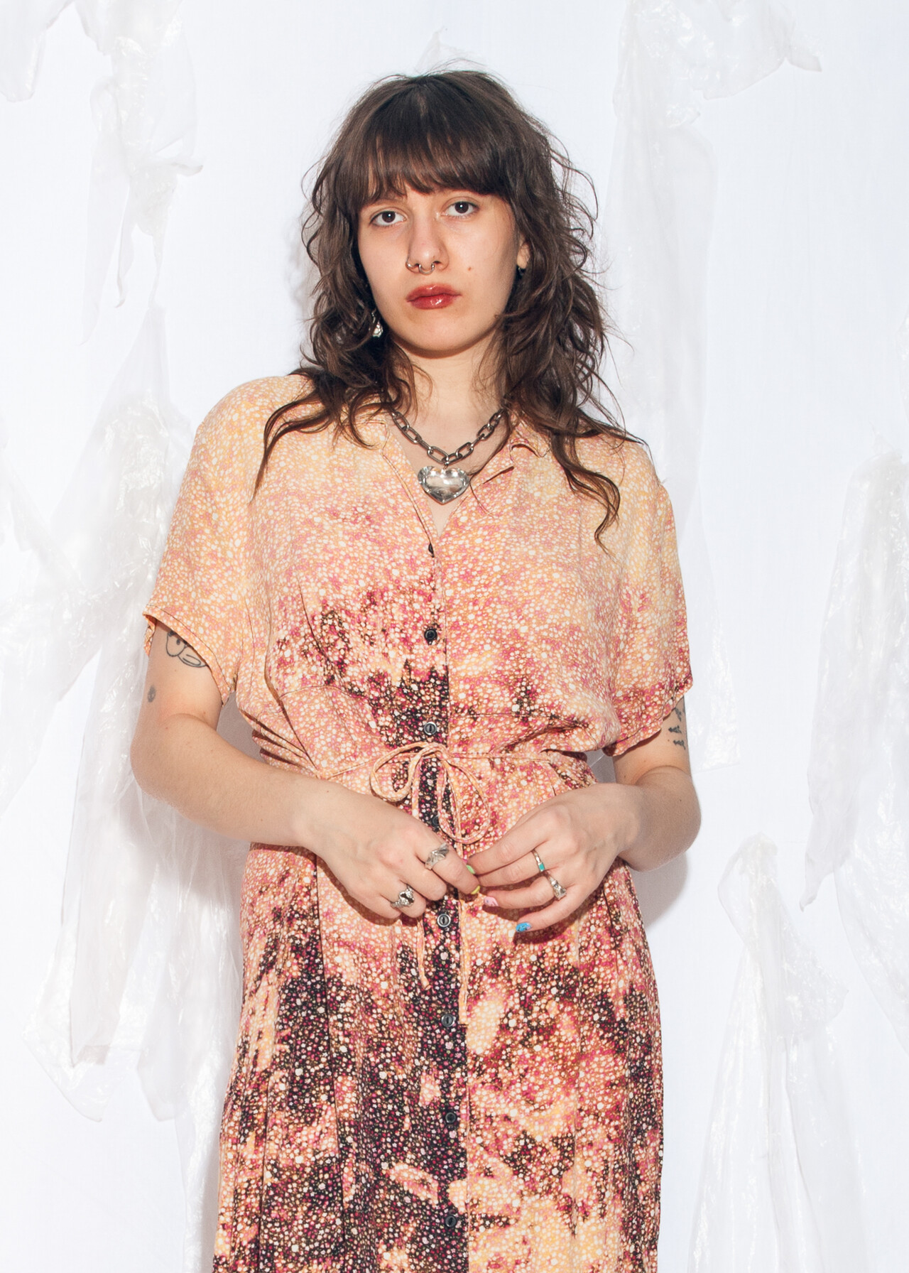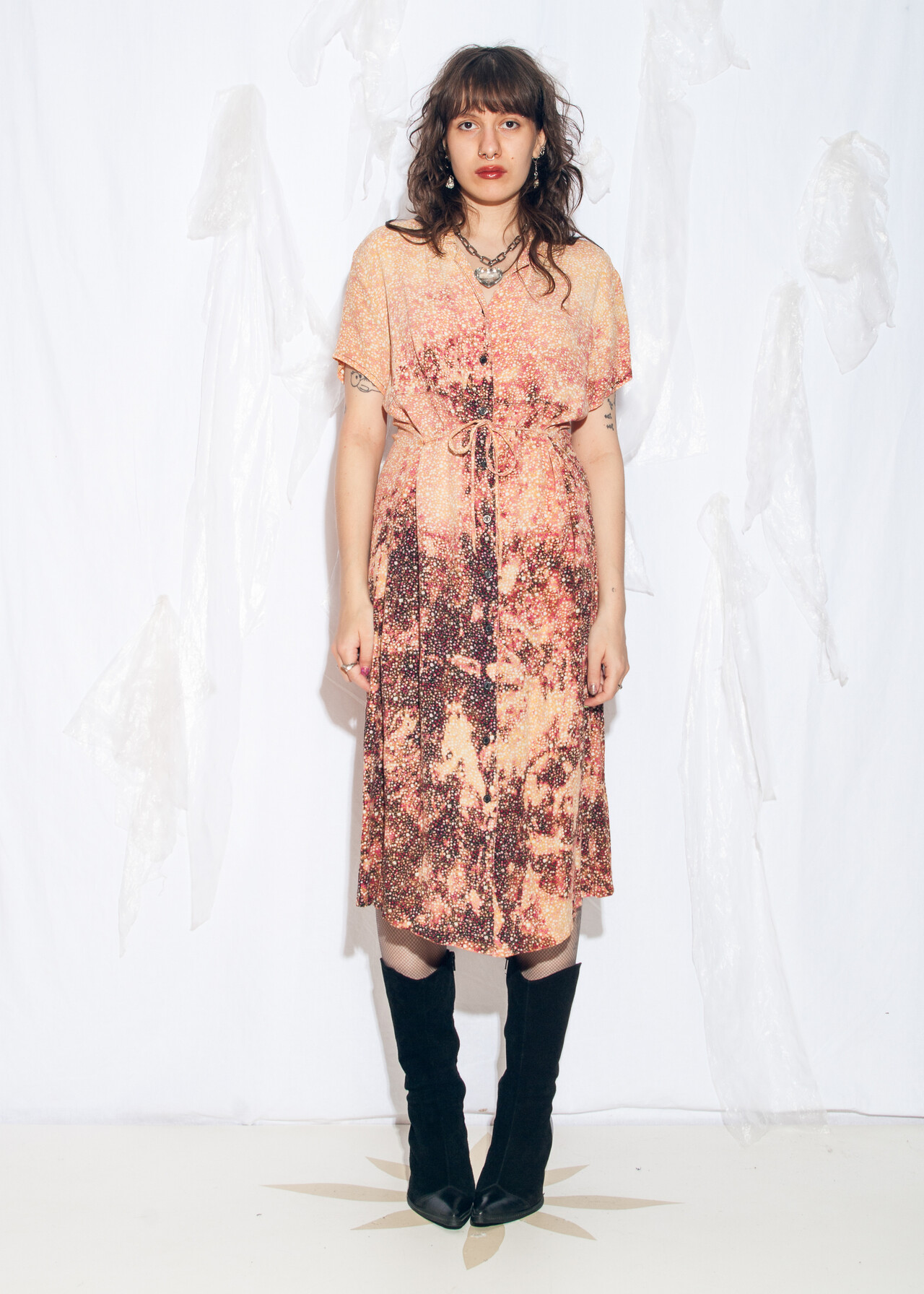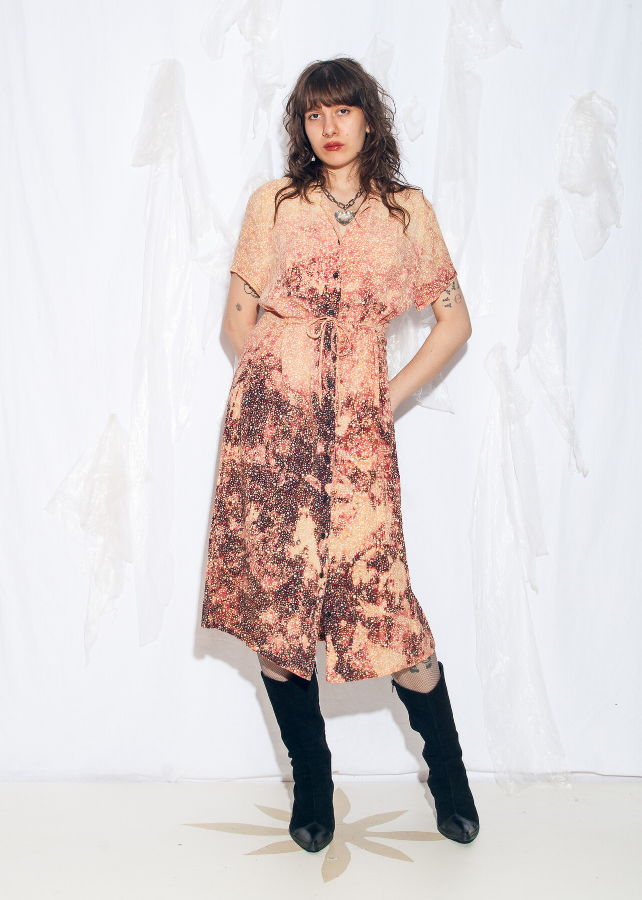 Tags: 90s vintage fashion, bleach dyed, button front dress, floral flower print, grunge dress, maxi dress, rayon midi dress, reworked, y2k style clothing