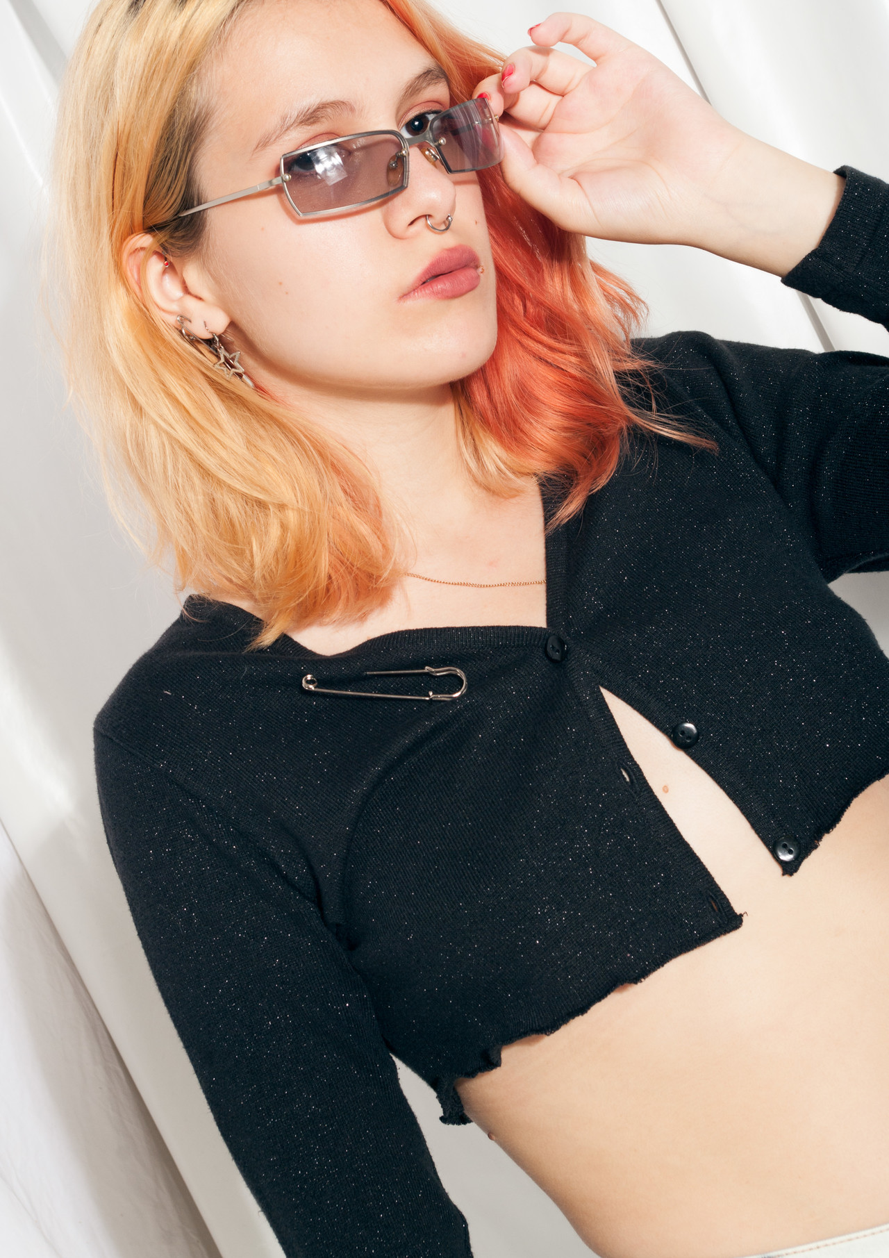 A vintage knit cardigan from the early 2000s, and we even reworked it for you: it has a cropped length with lettuce hem finish & a huge safety pin now. Although time travel is a bit exhausting, this piece withstood the test of time in mint condition. It features natural-feel black fabric and button closure. Let’s get sustainable – switch to vintage now!