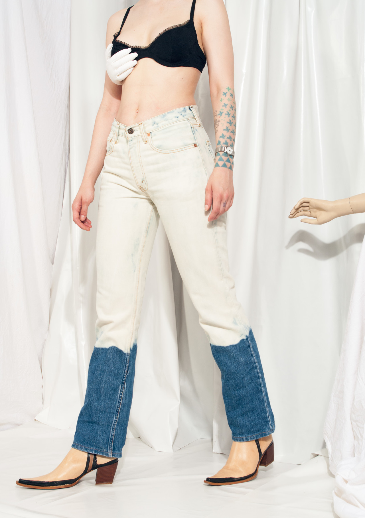 Reworked vintage Levi’s 595 jeans straight from the 90s in mint condition, what could be better than this? We dip-bleached this babe to get this one-off look. It features thick blue denim, zip closure and five pockets. Nothing more to say, just our standard daily styling advice: this one is best worn with more vintage clothes.