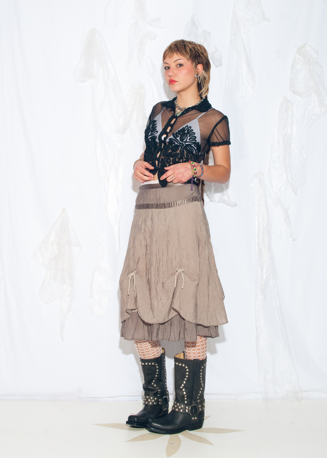 Tags: 2000s style clothing, coquette bow, layered midi skirt, low rise waist, reworked, upcycled clothes, y2k vintage fashion