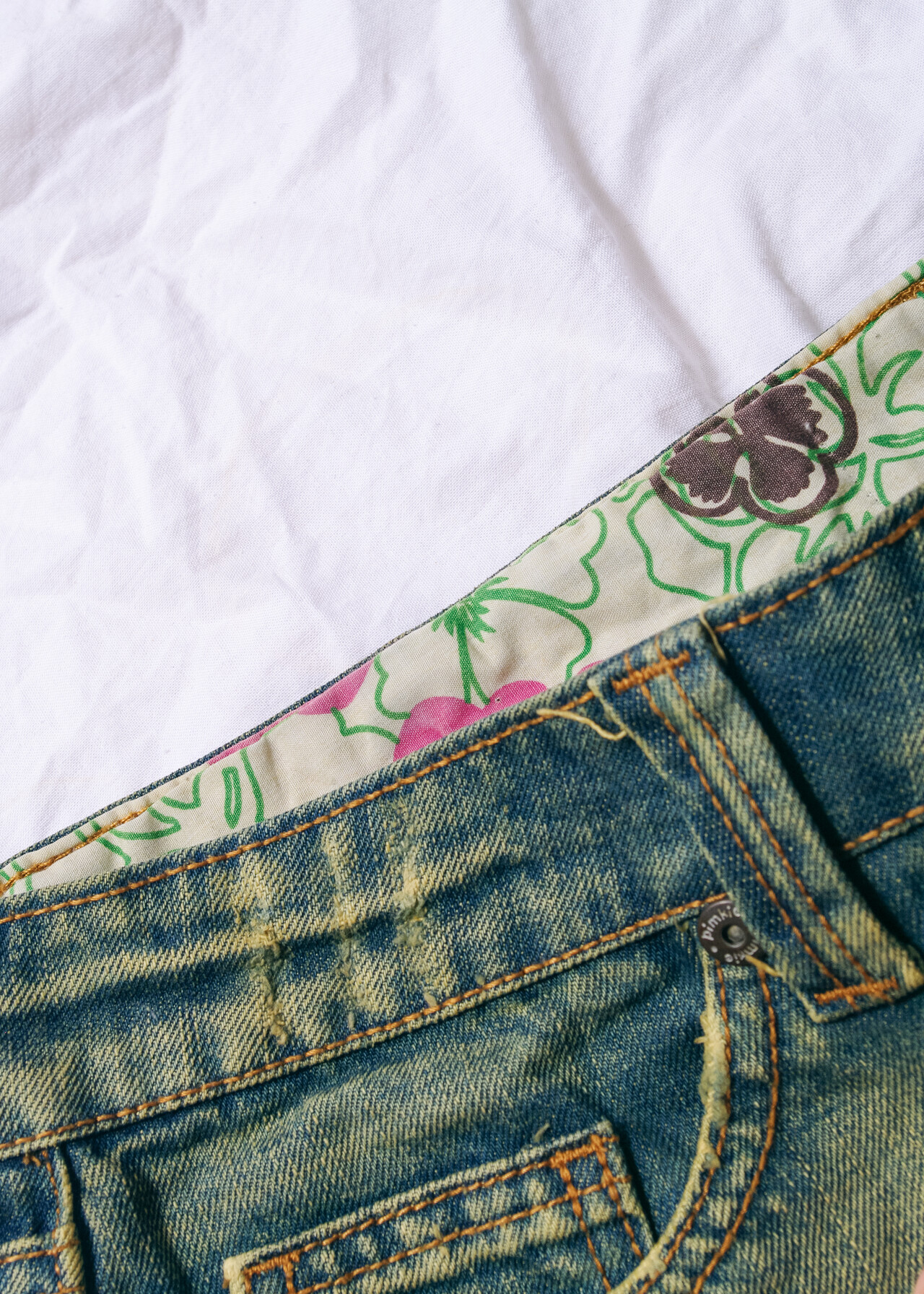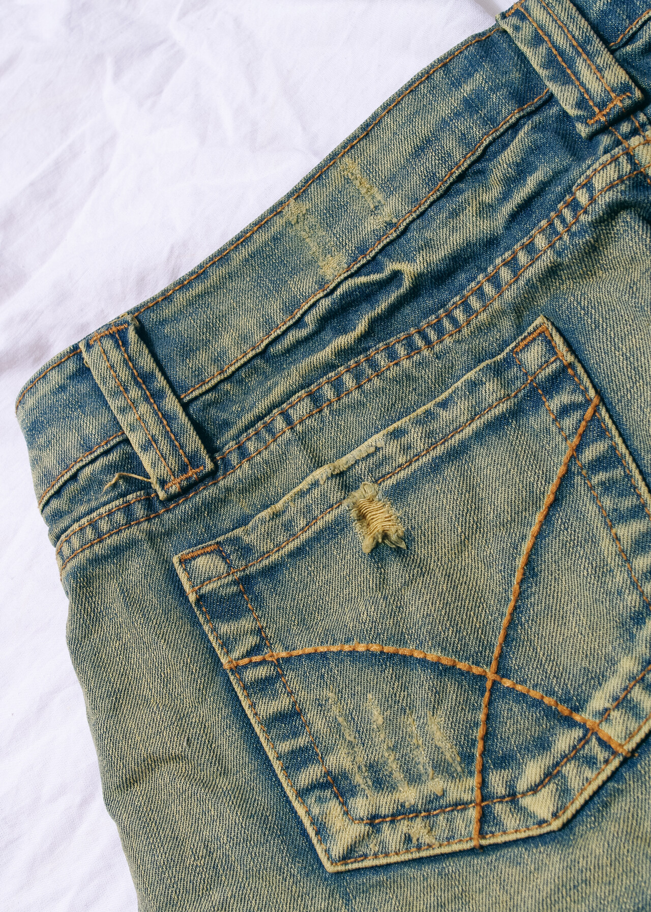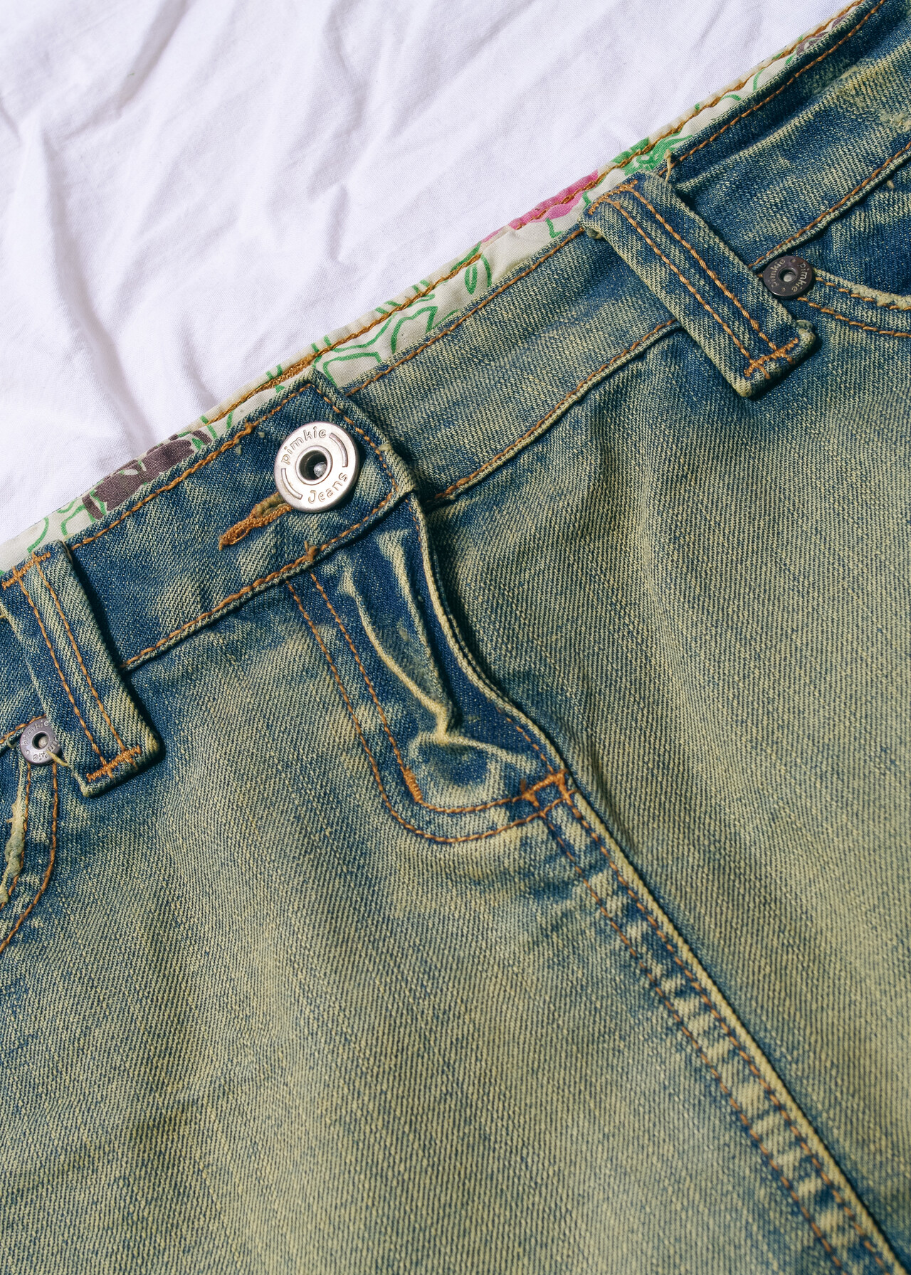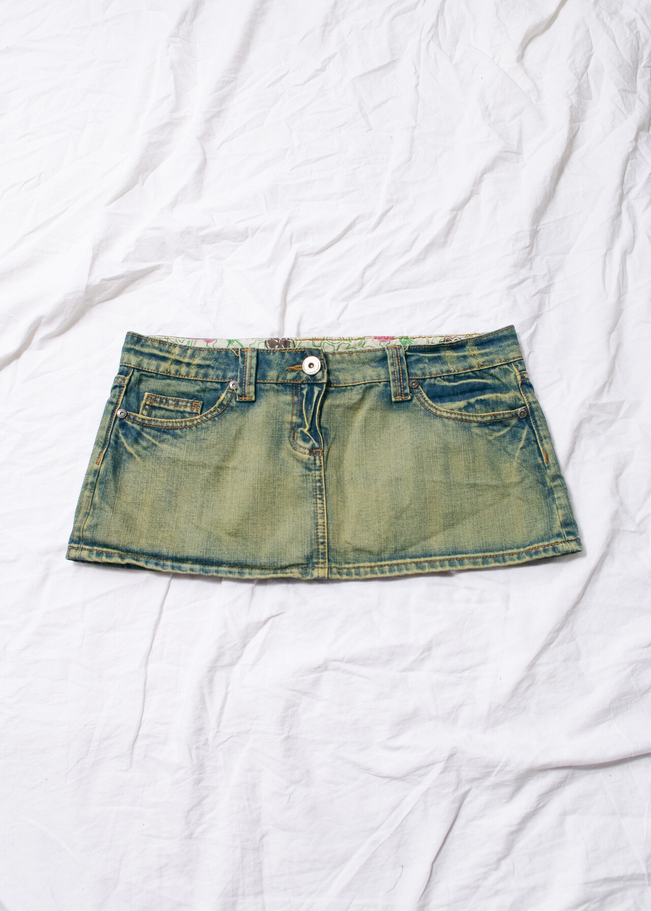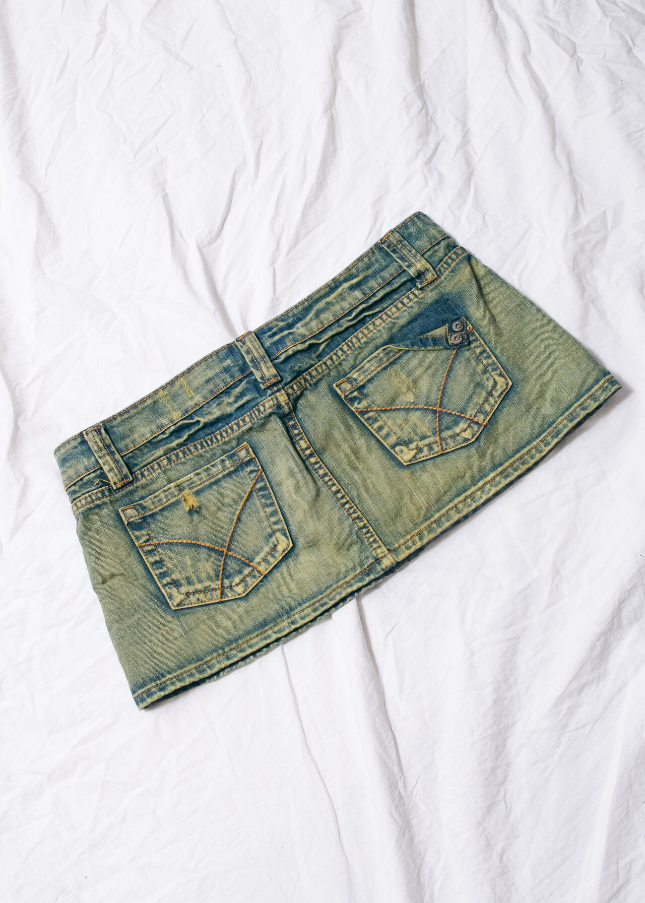 Y2K vintage denim micro skirt – because who wouldn’t want to strut around in overdyed khaki and pretend they’re the main character in a 2000s teen movie?