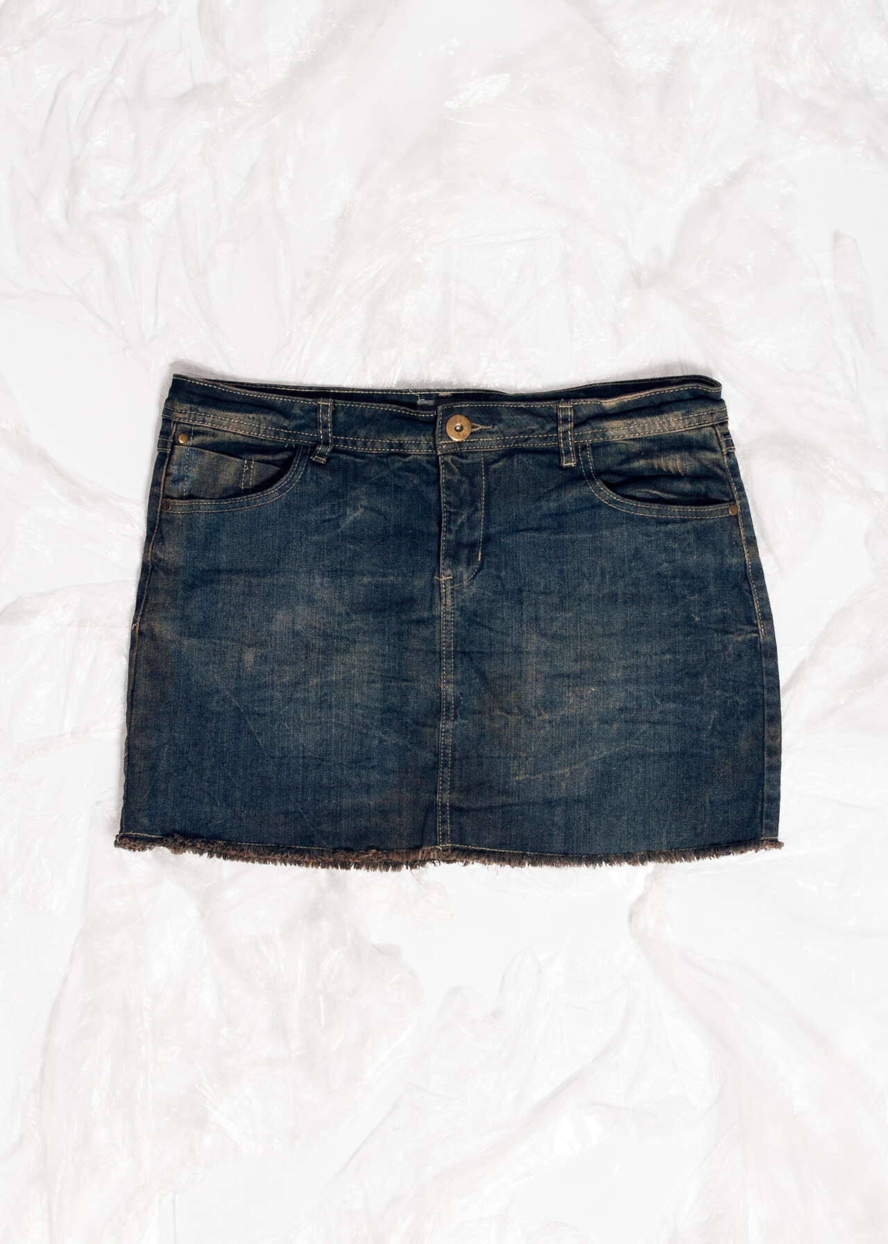 Tags: 2000s vintage style, cyber grunge, denim micro skirt, low rise, mud wash, reworked