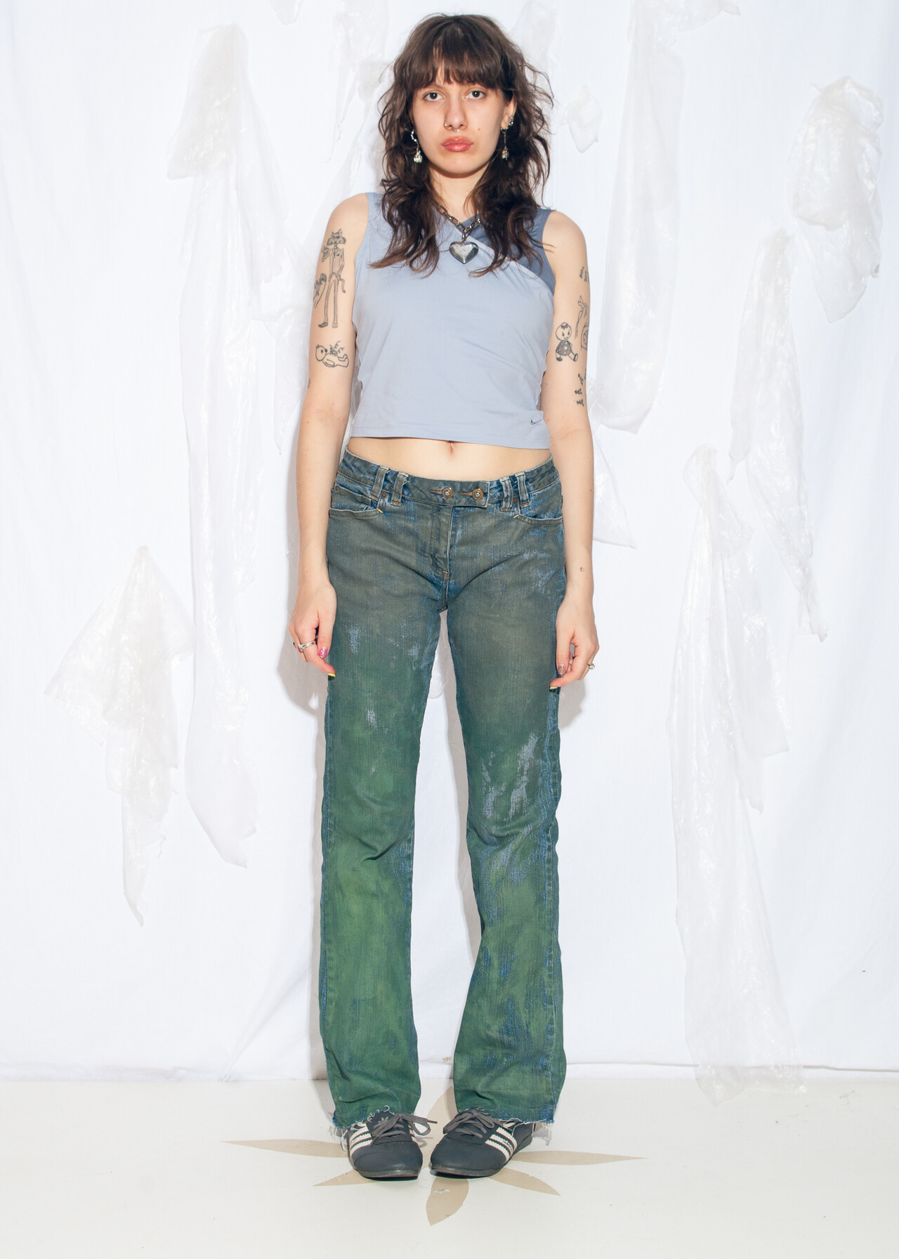 Tags: 2000s style clothing, bootcut jeans, dirty painted, flare denim pants, green trousers, hand-painted, low rise waist, reworked, y2k vintage fashion