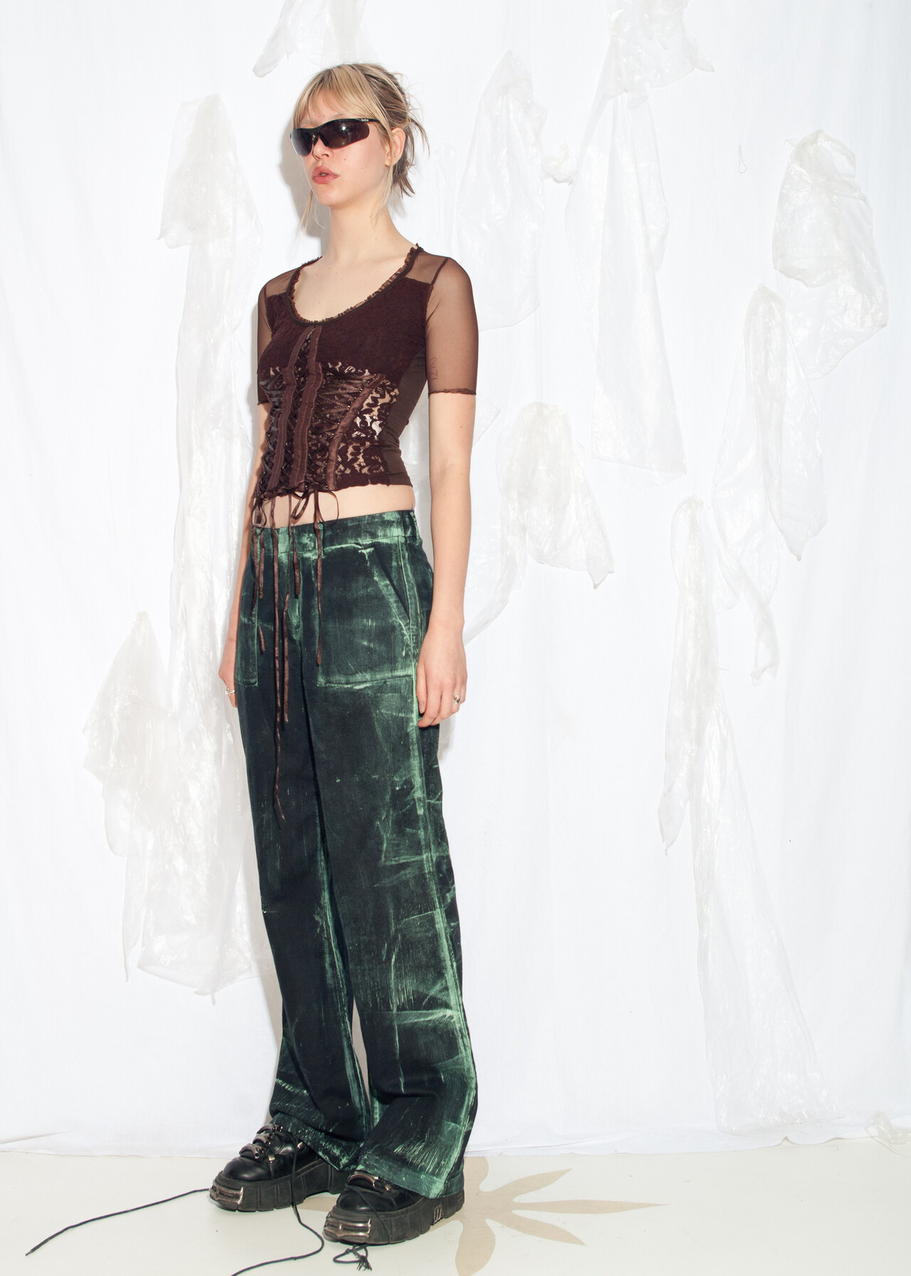 Reworked Vintage Y2K Linen Trousers in Hand-Painted Green