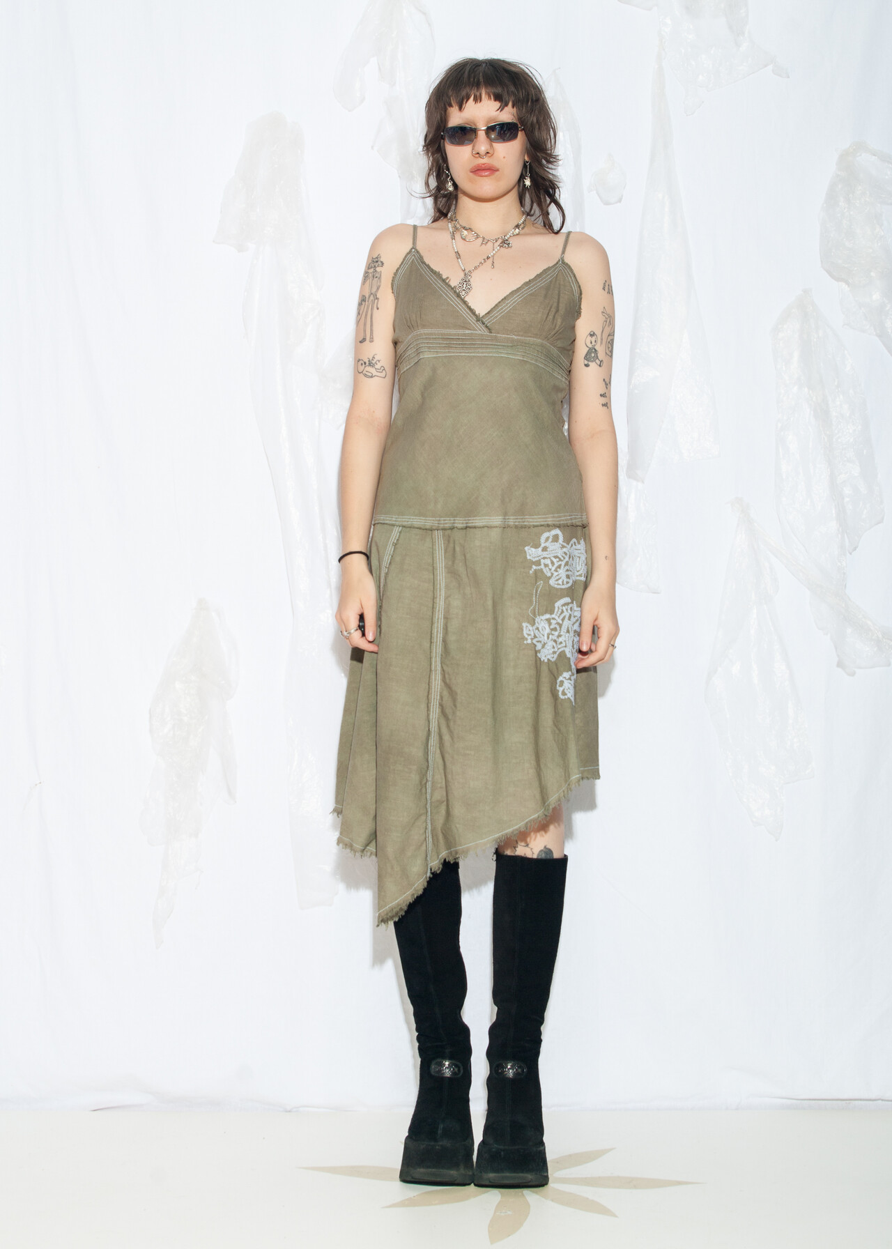 Tags: 2000s style clothing, asymmetric raw hem, flower embroidery, linen dress, mud wash dyed, reworked, whimsigoth, y2k vintage fashion
