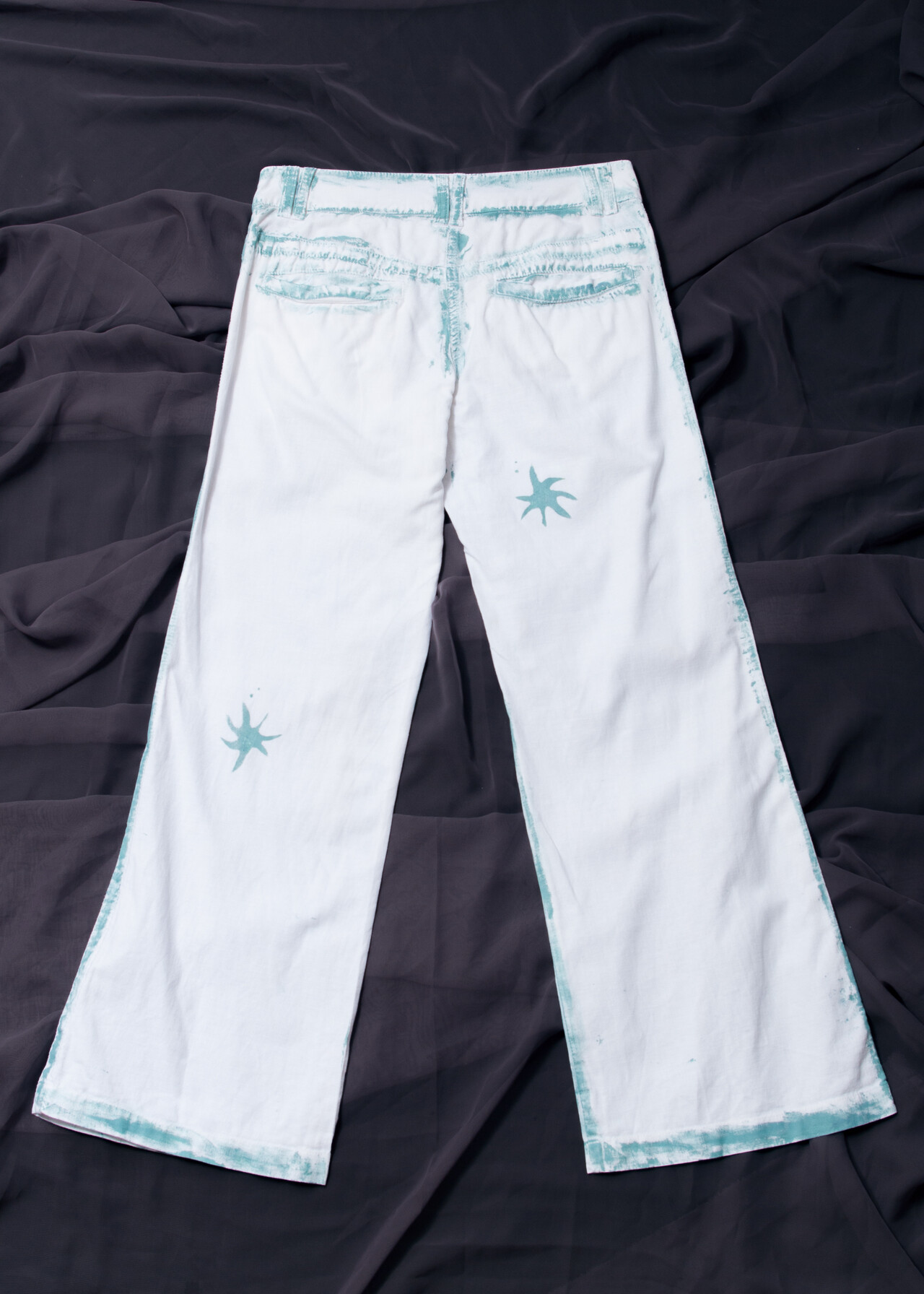 Tags: 2000s style clothing, hand painted pants, low rise waist, reworked, upcycled flares, white jeans, wide leg trousers, y2k vintage fashion