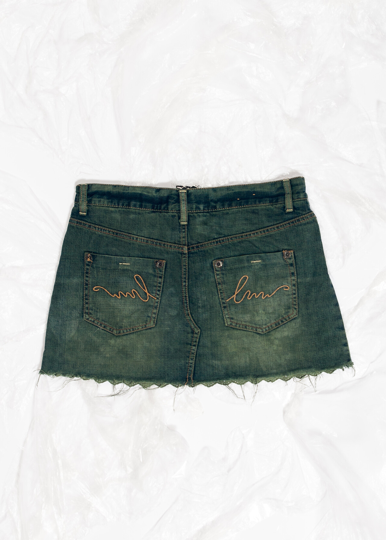 Tags: 2000s vintage style, denim micro skirt, low rise waist, mud wash green, overdyed, reworked, whimsigoth