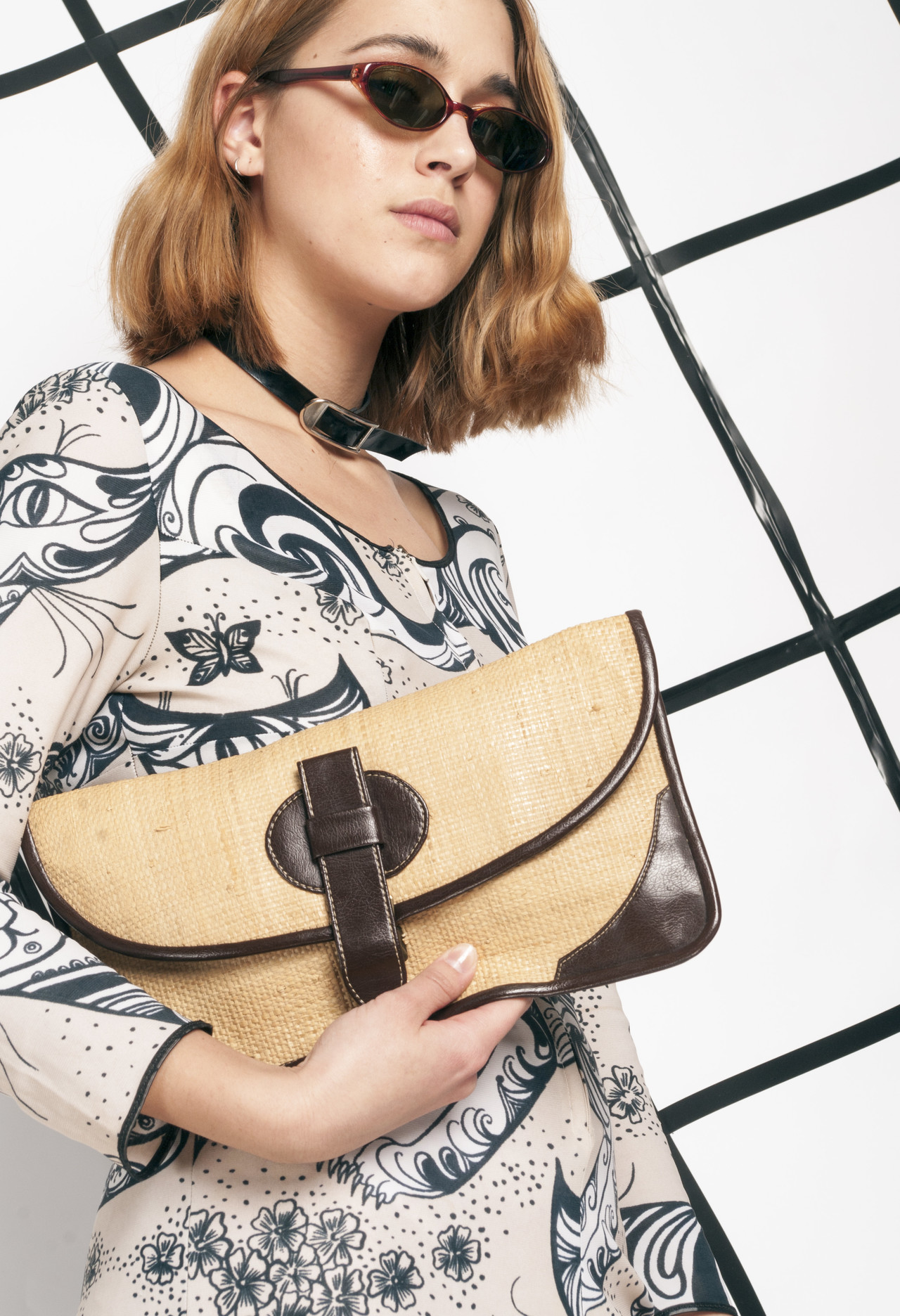 The most amazing vintage clutch made of woven straw. It features a copper fastener and vegan leather details. It escaped from the 70s in excellent condition.