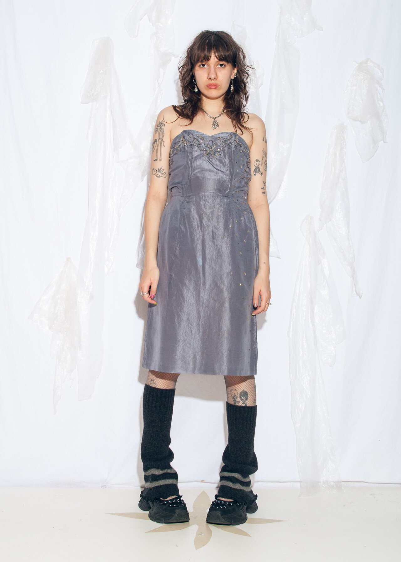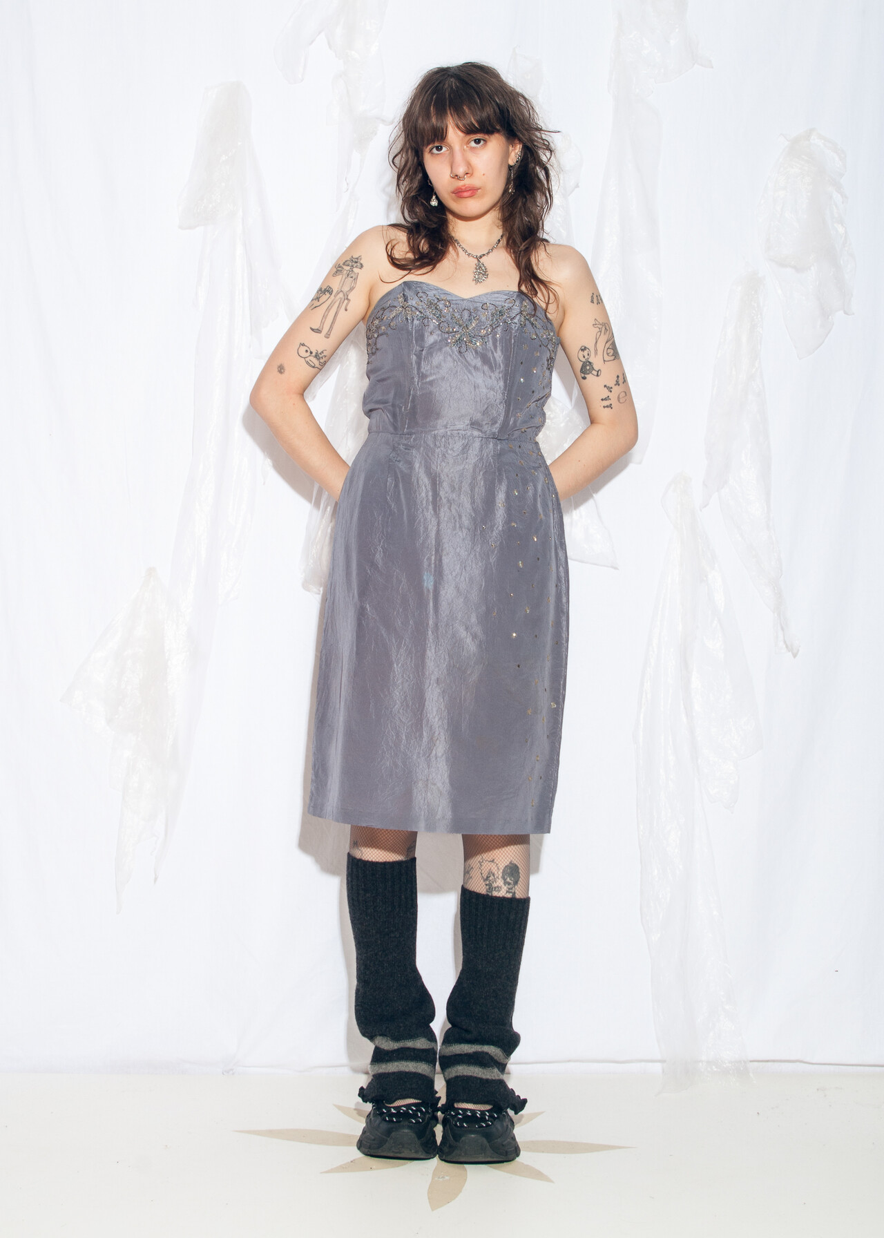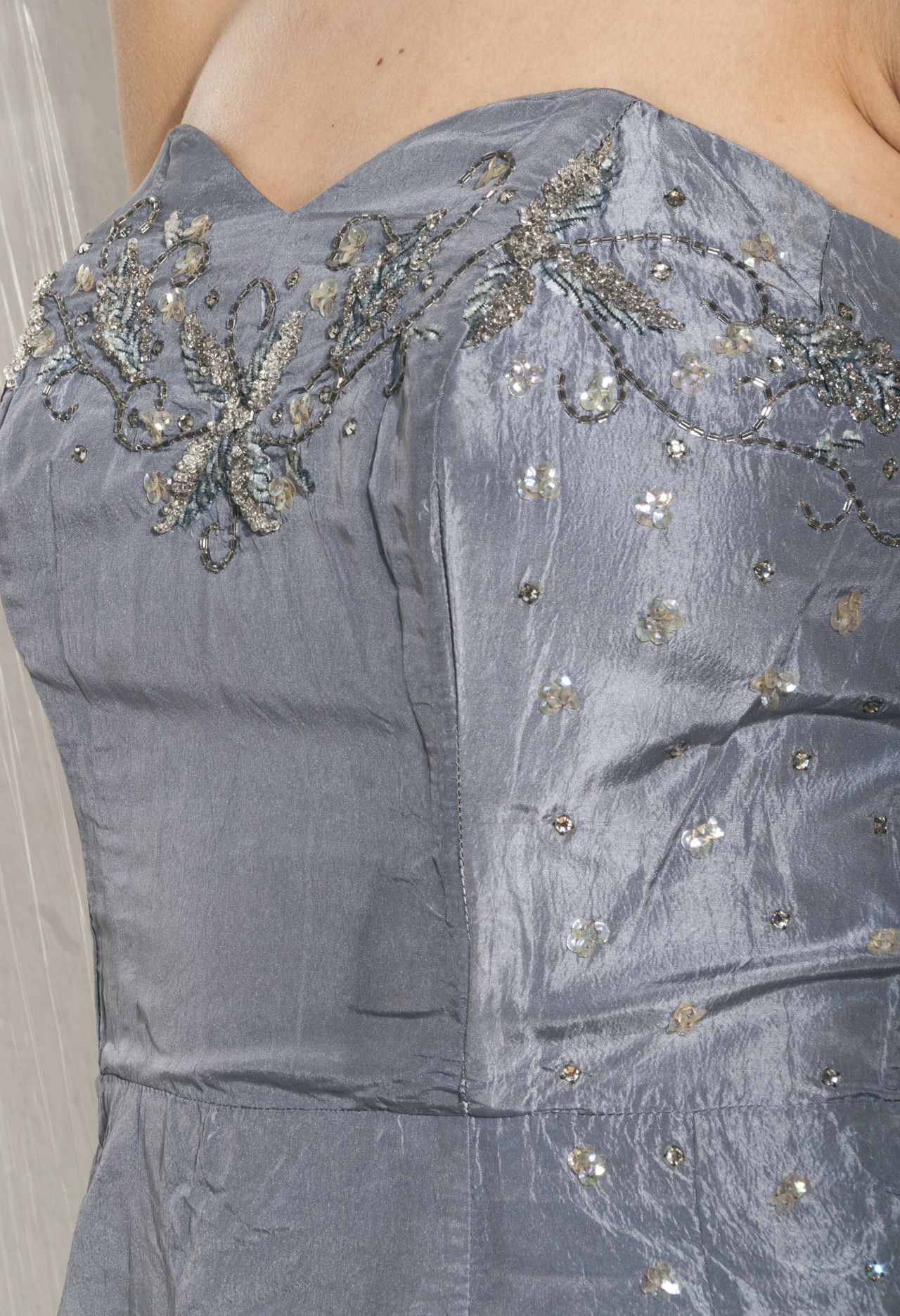 50s vintage dress – a dazzling corset creation adorned with glass beads and sequin embroidery that’ll make your prom night a silver blast!