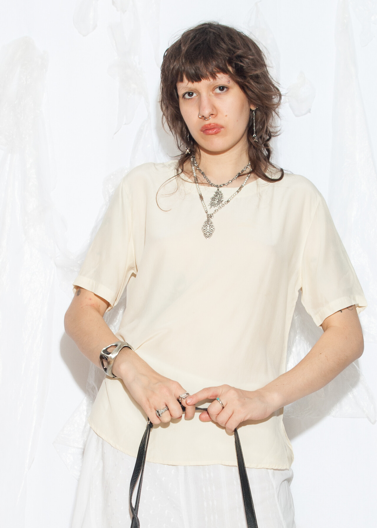 Tags: 90s vintage fashion, beige top, minimalist, natural fabric, oversized tee, pure silk blouse, silk t-shirt