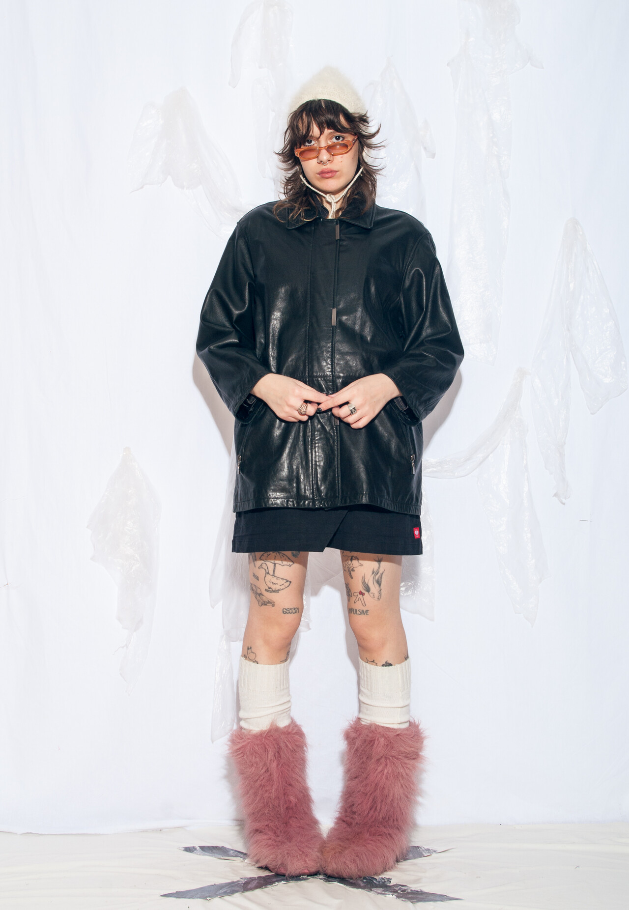 Tags: 2000s vintage style, boyfriend fit, leather coat, oversized jacket