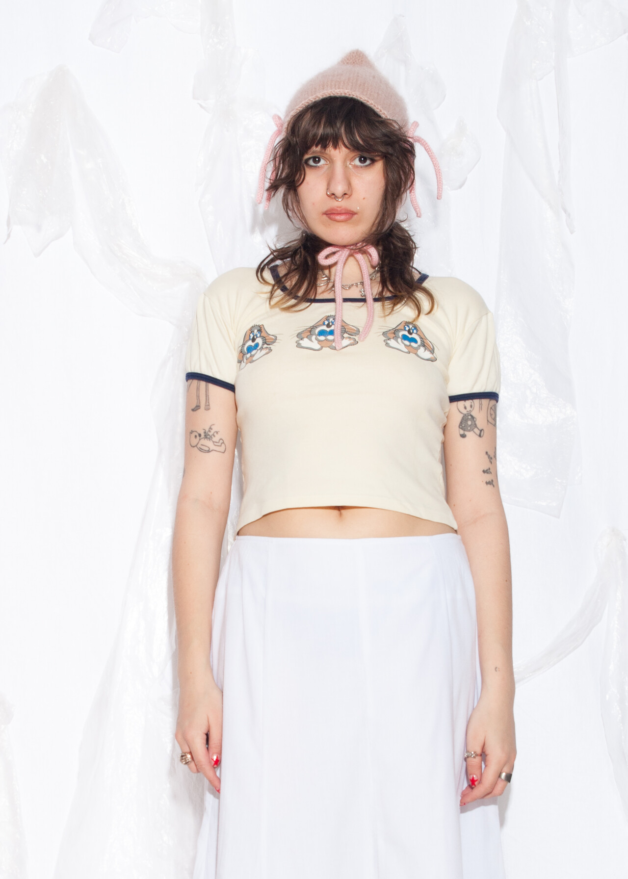 This rare 90s vintage baby tee is the dog-printed ringer tee that’ll have you raving like it’s 1999, beige vibes and all!