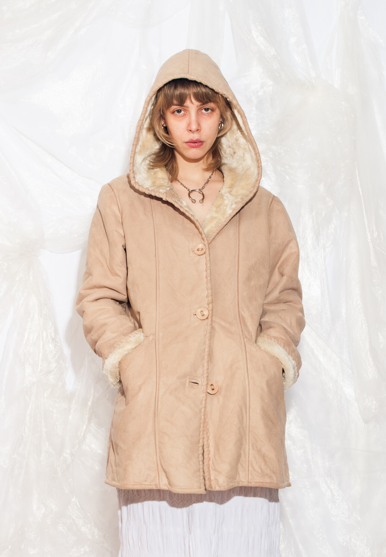 This 90s vintage coat is like a cosy time machine back to the era of Tamagotchis and inflatable furniture. Slip into this faux shearling hooded beauty and reignite your love for all things beige.