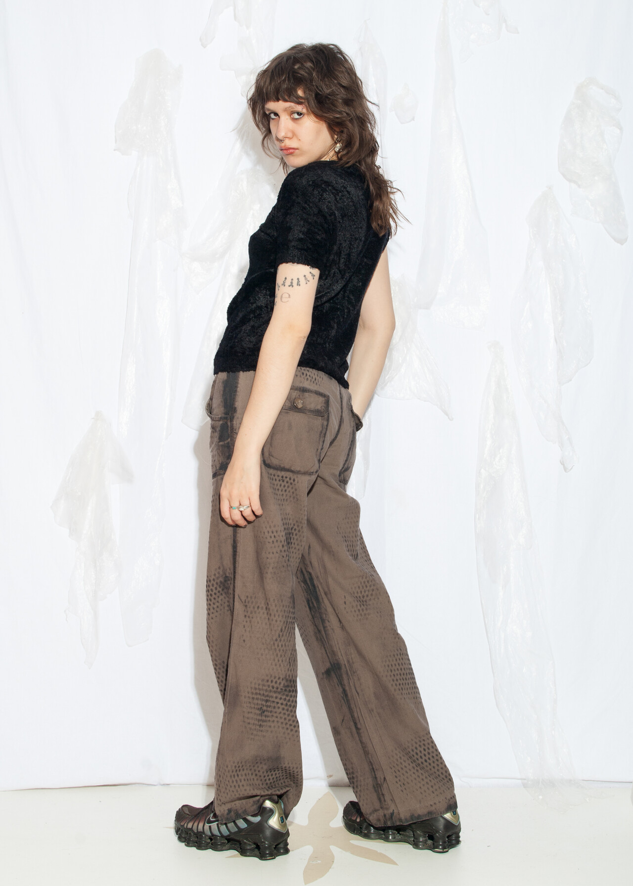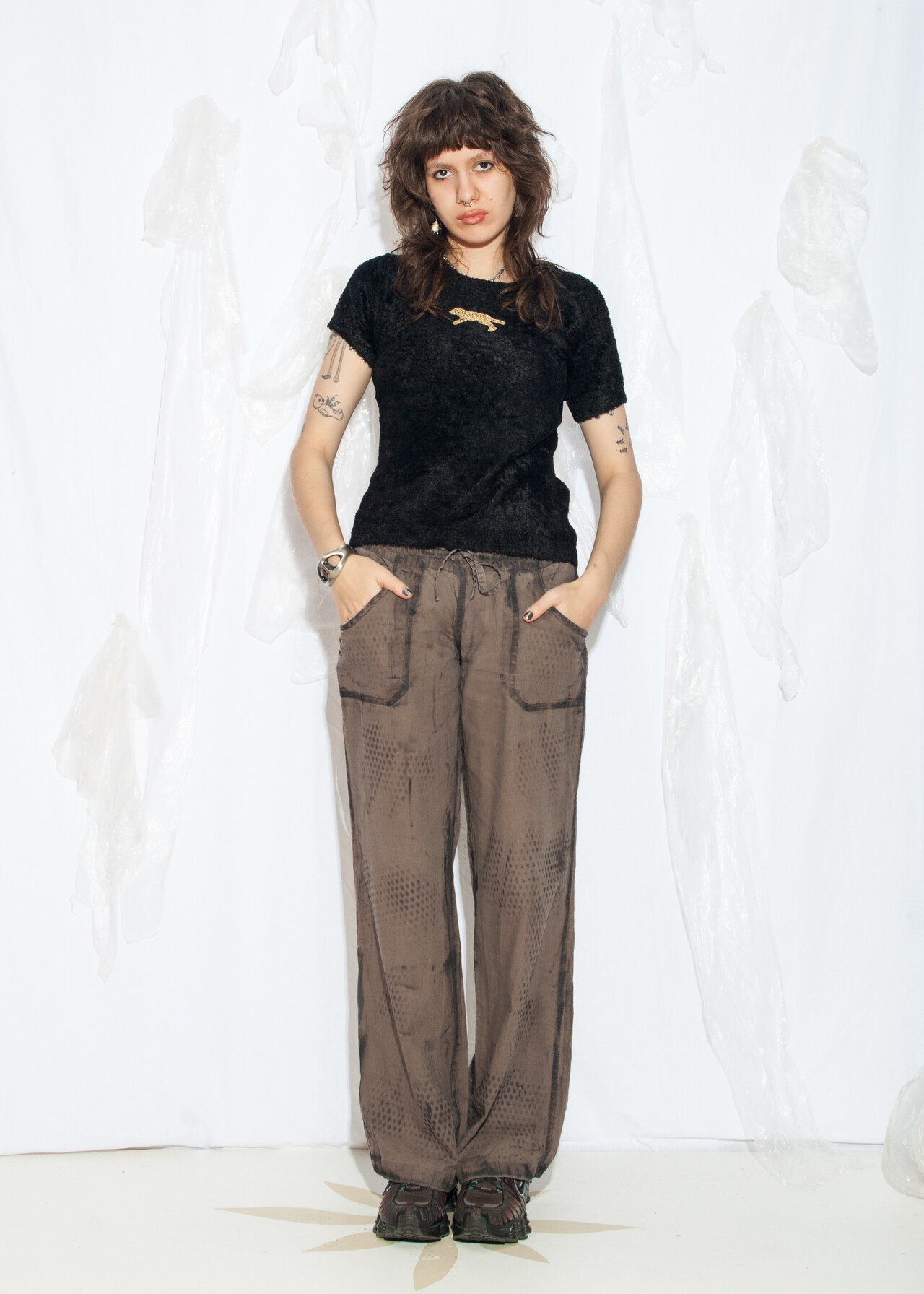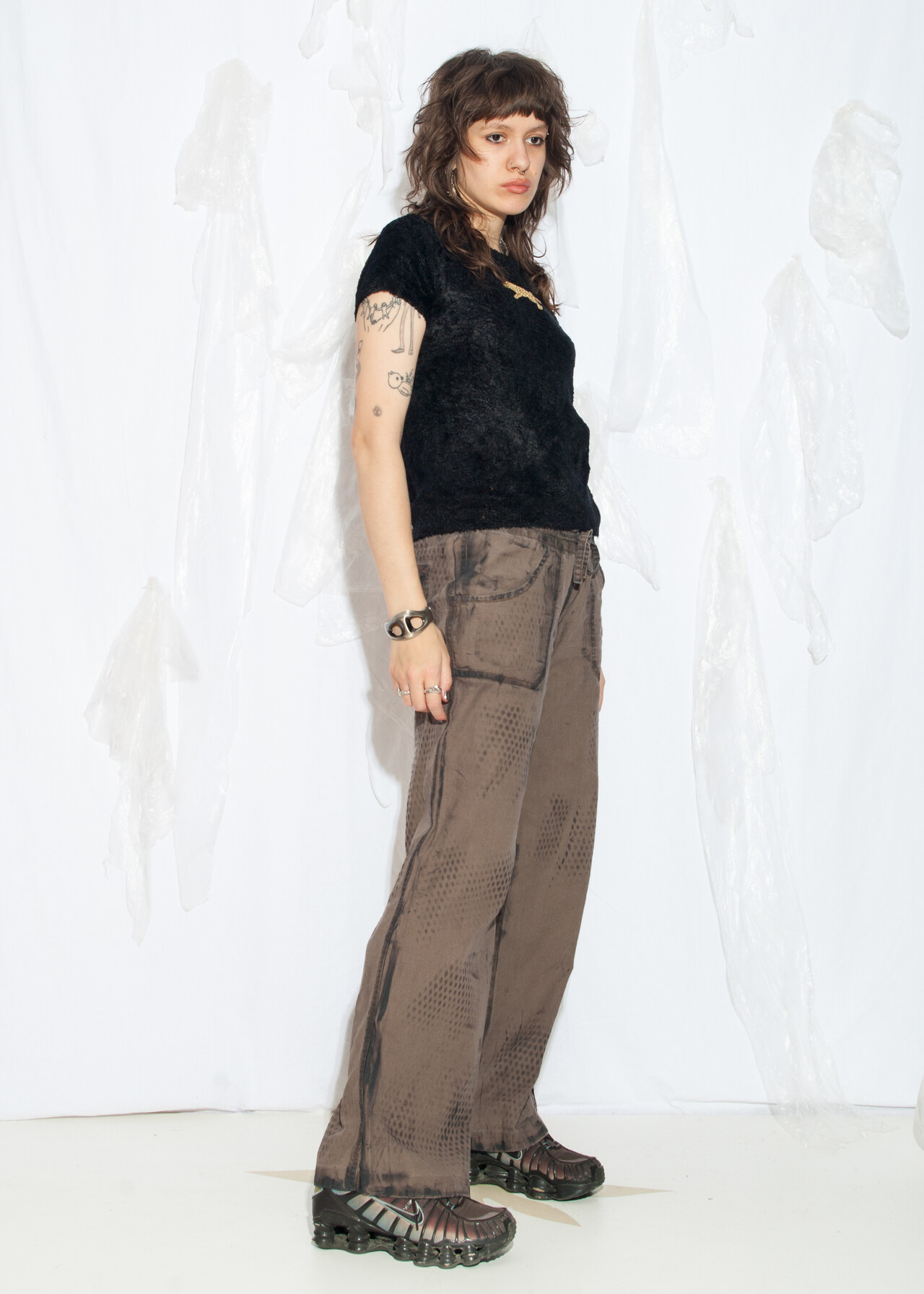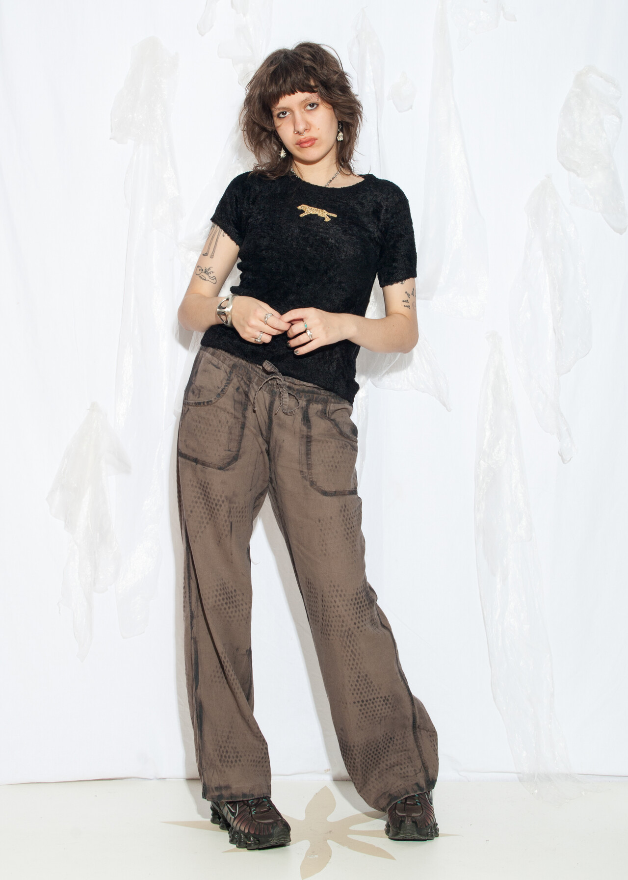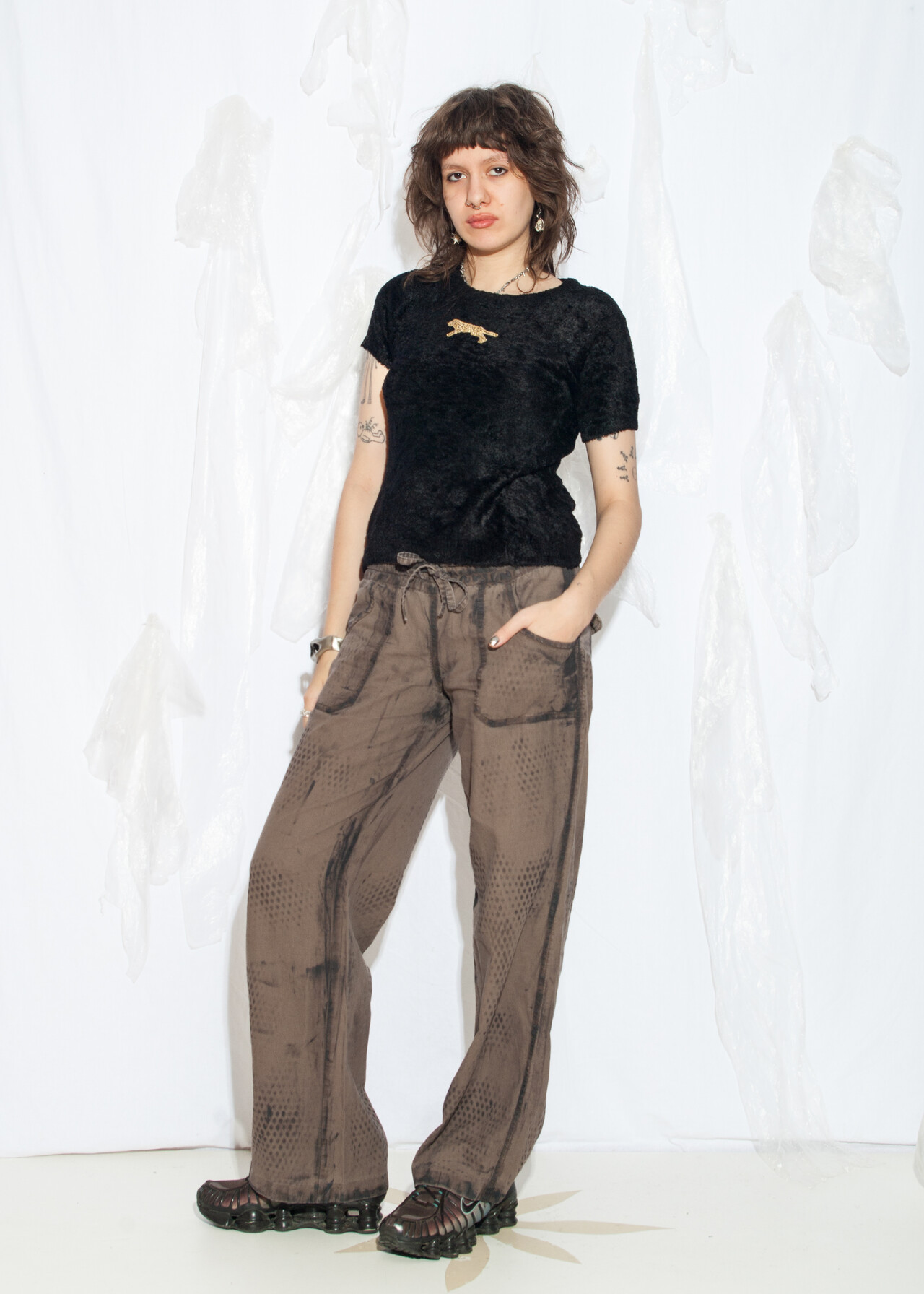 Tags: 90s vintage fashion, black baby tee, fluffy top, furry t-shirt, leopard pattern, plush top, y2k grunge outfit