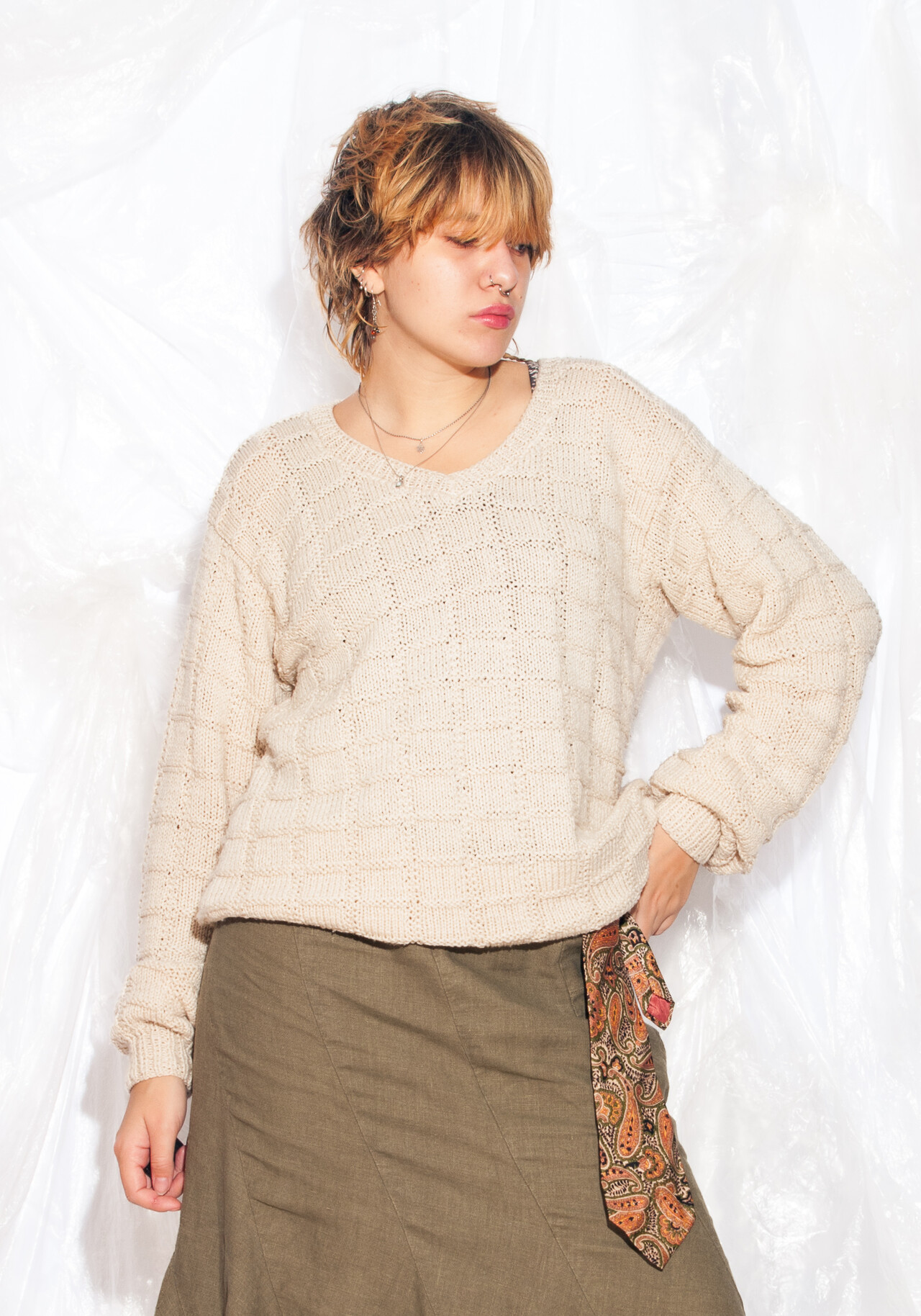 This handmade 90s vintage beige knit jumper is a cosy time capsule straight out of the buttoned-up era, when Friends dominated TV and the world was a little less tweaky.