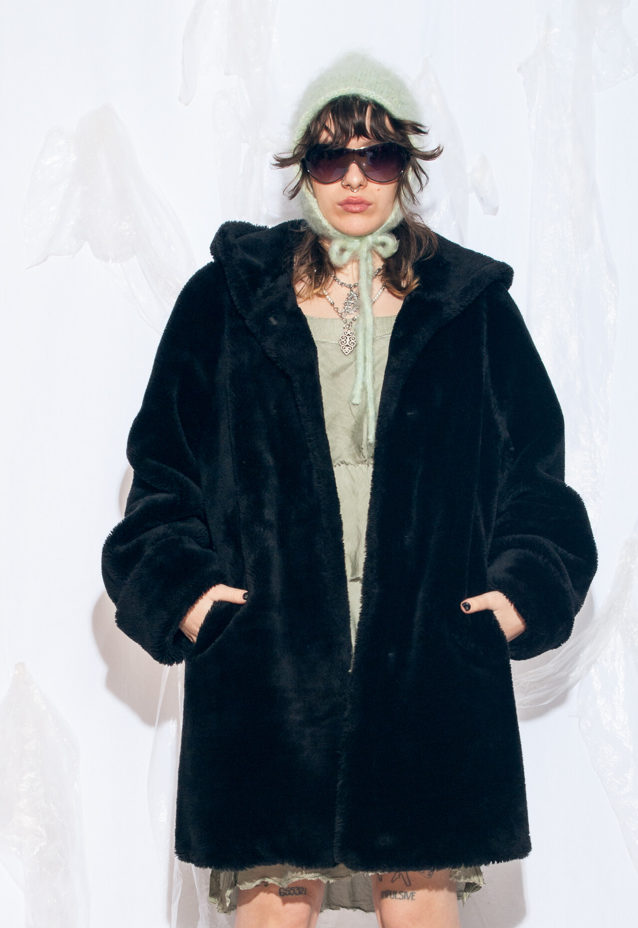 Vintage 90s Hoodfed Faux Fur Coat in Black
