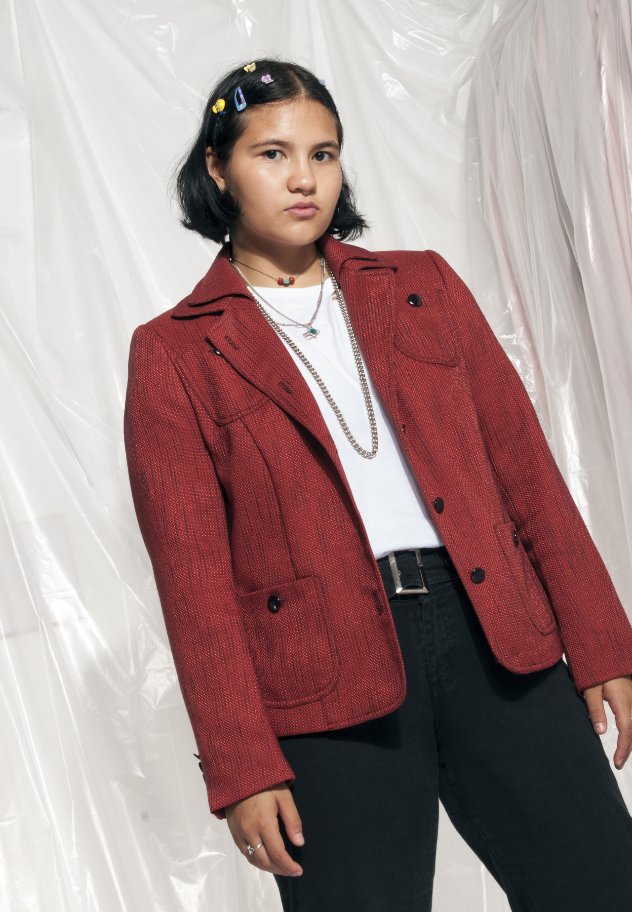 Fully lined rust-red vintage blazer from the 90s featuring doubled collars, contrasting black buttons, natural fabric and four pockets. It looks amazing layered with a crop top. This vintage babe survived the breeze of times in great vintage condition.