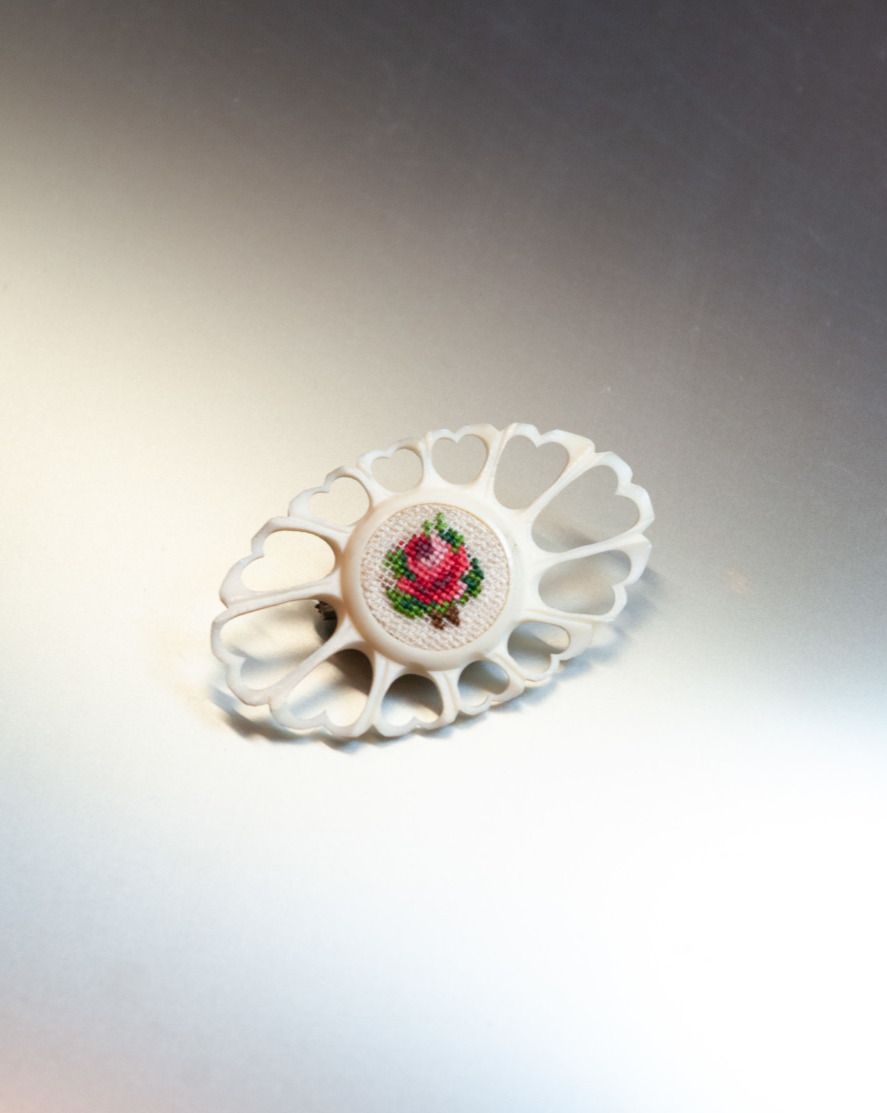 Carved bone brooch with a beautiful round embroidered rose. Looks absolutely gorgeous between the collars of your high-necked blouse.
