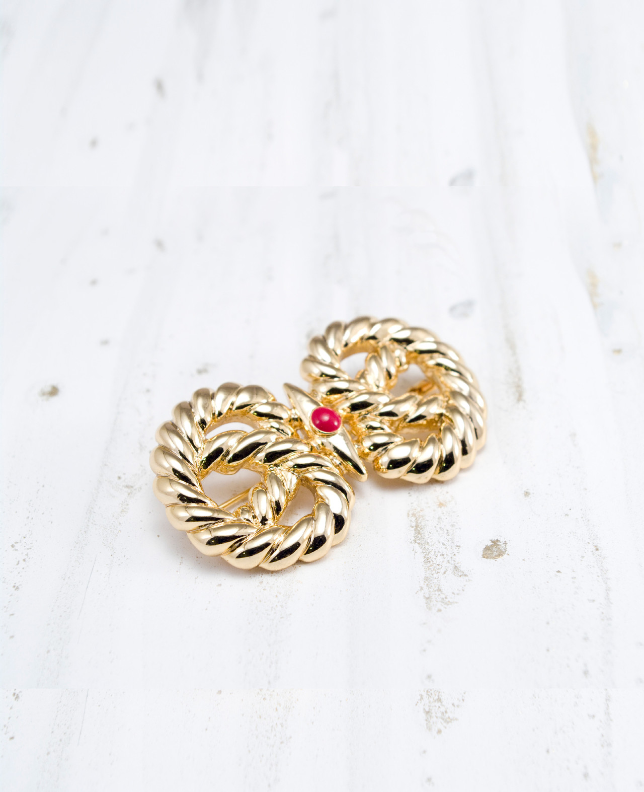 Golden plated pretzel shaped brooch from the 80s with a tiny red bead in the middle. Vintage, but still new: it came to light in a warehouse after many years.