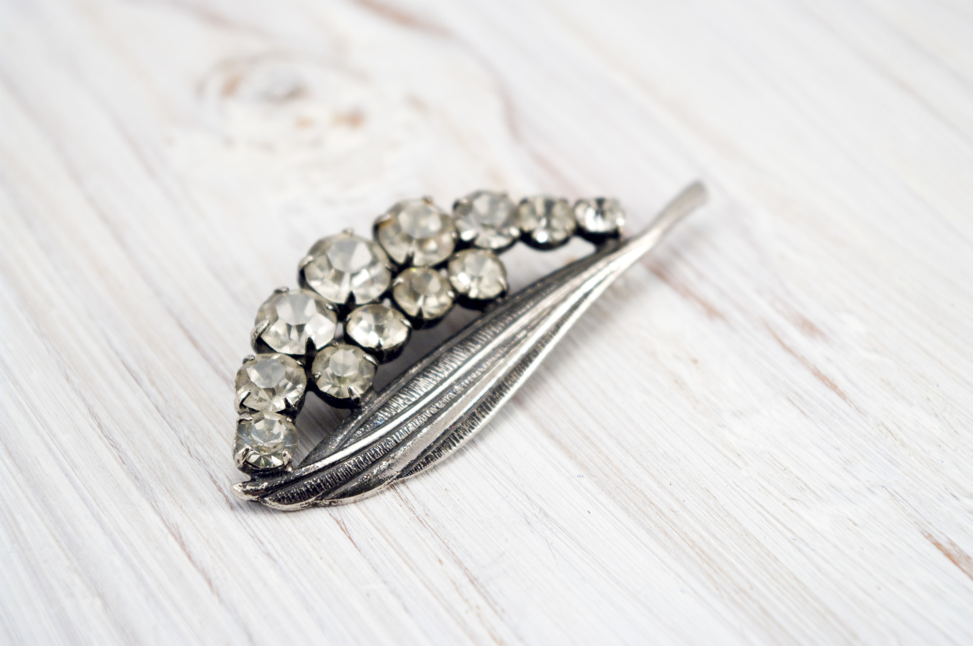 Vintage brooch 80s rhinestone silver leaf diamante pin
