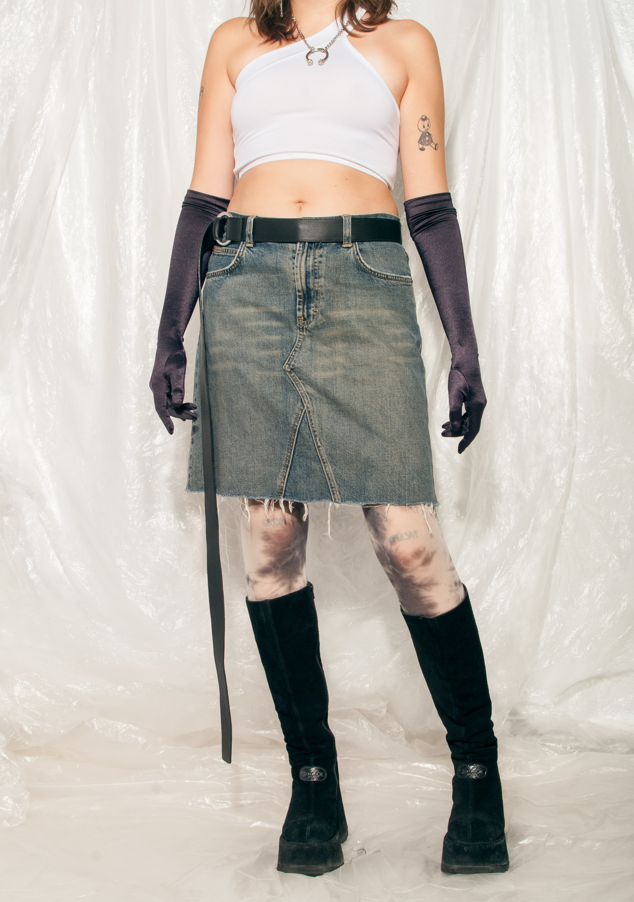 90s vintage Calvin Klein denim midi skirt still in mint condition, wowzy wow. Featuring a zip closure, five pockets, raw hem and greenish-blue cotton fabric. It’s an EU size 38 worn on the hips and a size 40 worn on the waist.