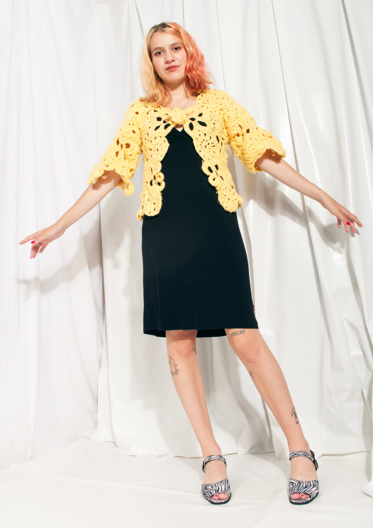 This handmade vintage crocheted cardigan just landed here from the 70s and it’s still in good condition. It’s a rare one-off find that features flared sleeves and a crocheted flower button closer. It fits more sizes — we recommend it up to EU size 36. Grab this authentic hippie piece before it’s gone!