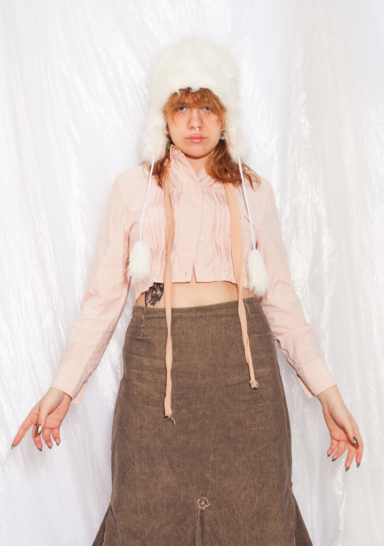 A one-off reworked vintage shirt from the 90s still in great condition! We shortened it for you. It features pastel pink viscose blend fabric, button closure and a pleated front. Go, go, go!