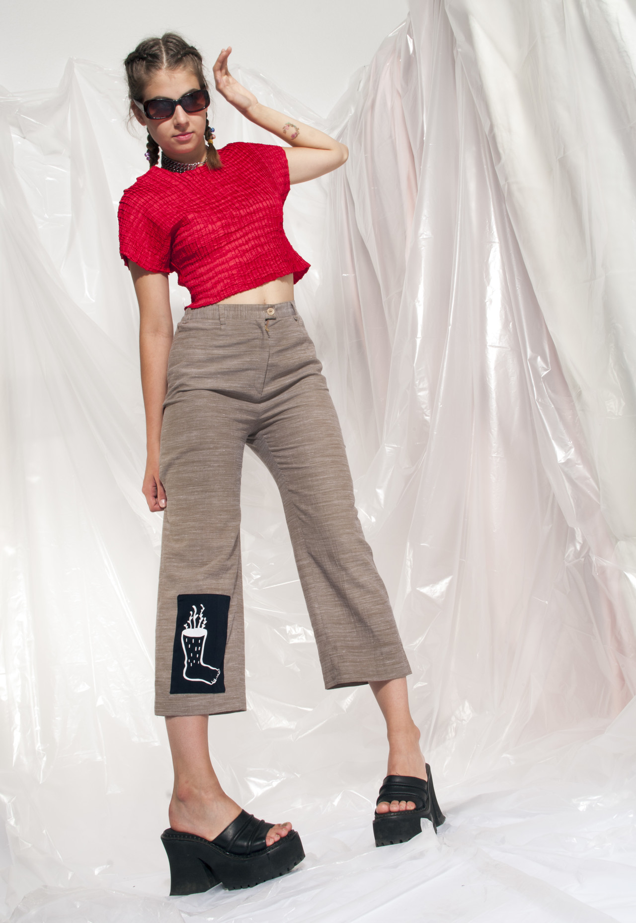 Flash your ankles in this pair of cropped trousers! It’s a real vintage piece that was handled by our rework team: now it comes with one of our limited edition hand-printed hairy leg patch. Made from natural-feel and easy-to-care blended fabric, has two pockets and a zip closure.