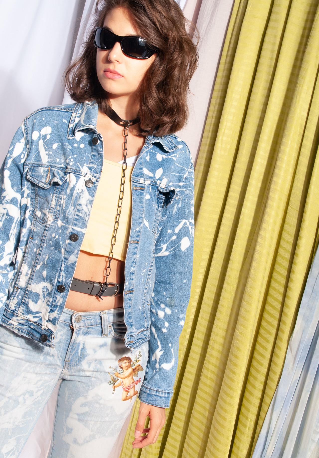 This ultra-cool Y2K vintage jacket just got through our company time tunnel — luckily in great condition. It’s made of blue denim fabric and comes with 4 pockets and button closure. We bleach-painted it to get this one-off look. Aaand here comes our daily styling advice: team this one with 2000s fashion treasures.