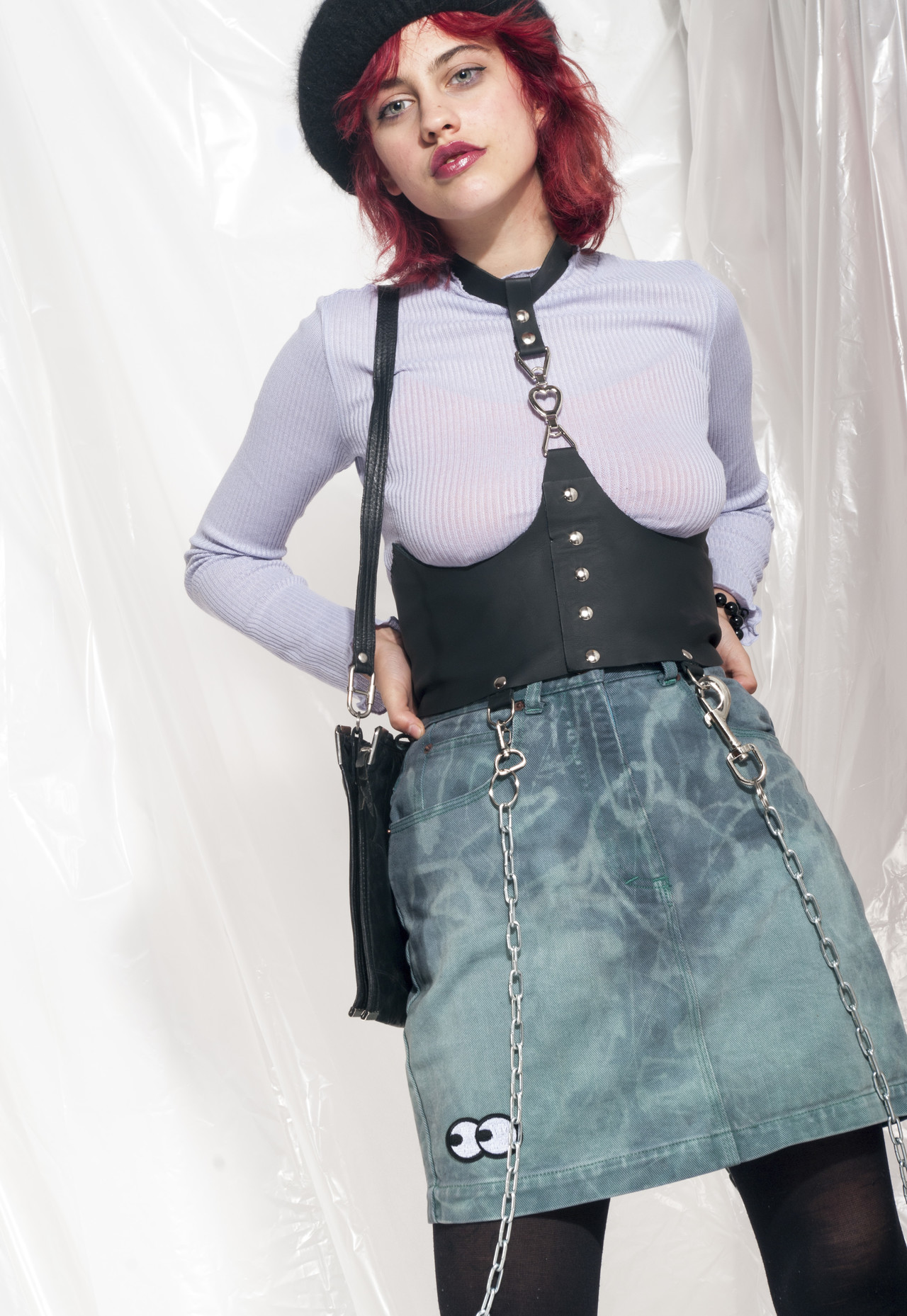 This skirt is a Pop Sick reworked piece of clothing with a nice tie-dyed pattern and eyes patch. Front zip and button closure, five pockets, true 90s vibe. Don’t hesitate, grab it — and team it with sustainable thrifted items, of course.